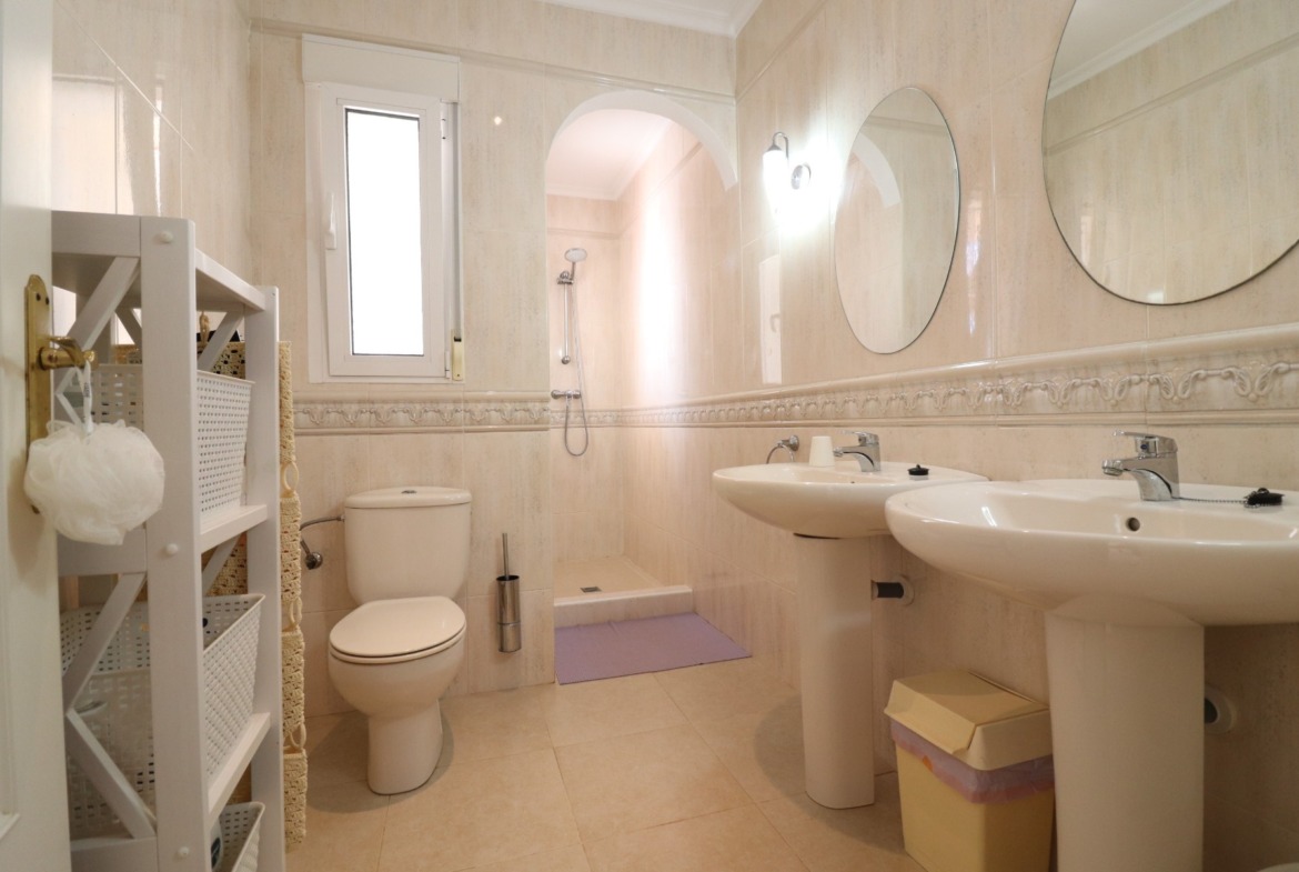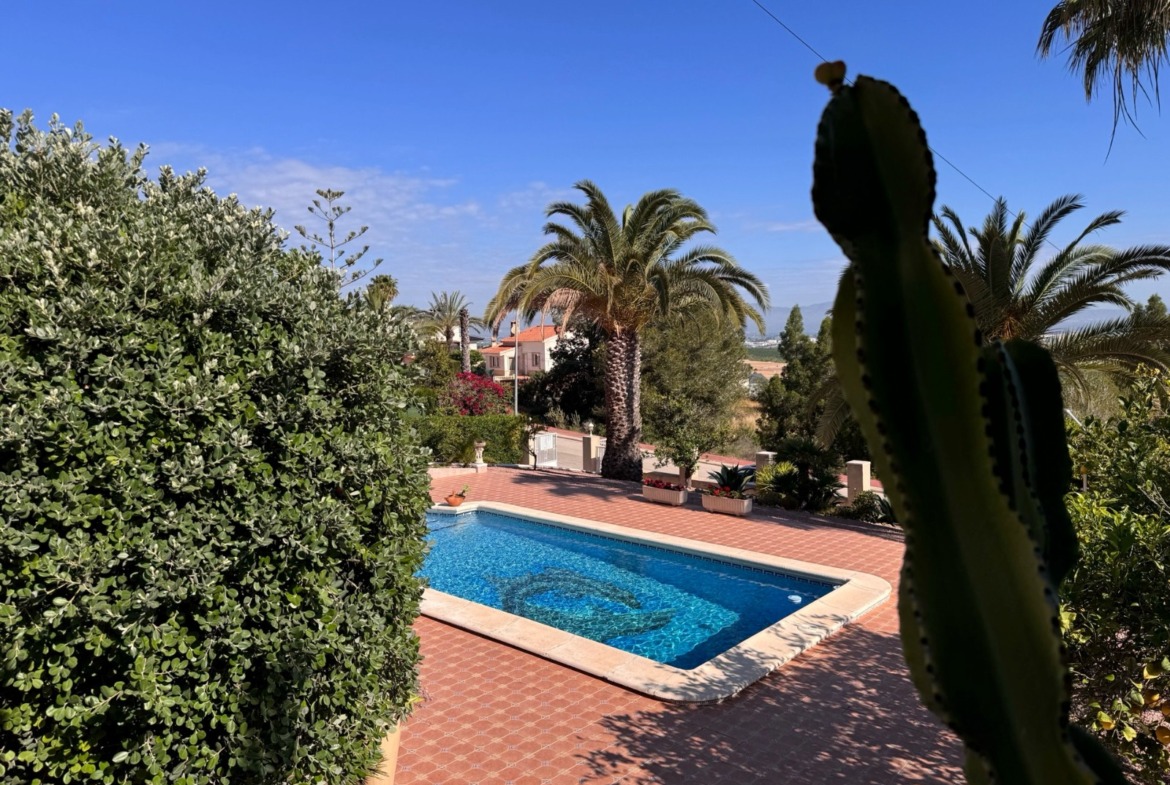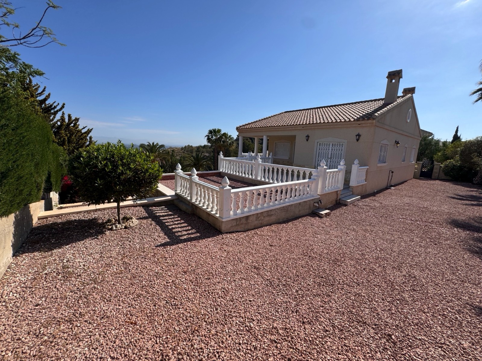 This Imposing 216m2, Three Bedroom, Detached Villa in Lomas de La Juliana is located in a very sought after residential area, with a tennis club at the entrance and La Finca 5* hotel, spa and golf course right on the doorstep, where you can also find a variety of eating places and shops.  Main chain supermarkets can be found in Almoradi and Benijofar which are just 5 minutes by car.  The beaches along the coast by car are approximately 20 minutes away.  This outstanding home occupies a 1220m2 private landscaped plot with the most extensive views you will find in the area.  The main living area of the villa is accessed via external staircase to an ´L´shaped covered terrace area, this then provides access into the lovely light living area, having a set of sliding doors and three sets of windows, feature open fireplace; incredible fitted kitchen/breakfast room; double bedroom and a family shower room.  The ground floor of the property is accessed externally and comprises of  lounge, archway into the fitted kitchen, bathroom and two double bedrooms.  The garden is pebbled and tiled with a long driveway leading to a garage and a carport; the pool area has tiled surround and there are plenty of mature trees, bushes, palm trees surrounding.  Extras include underfloor heating throughout the main floor, air conditioning, fitted wardrobes in all bedrooms, irrigation system.