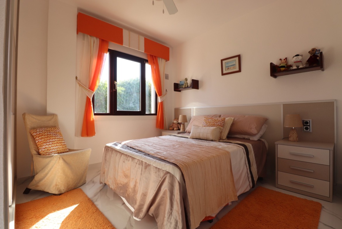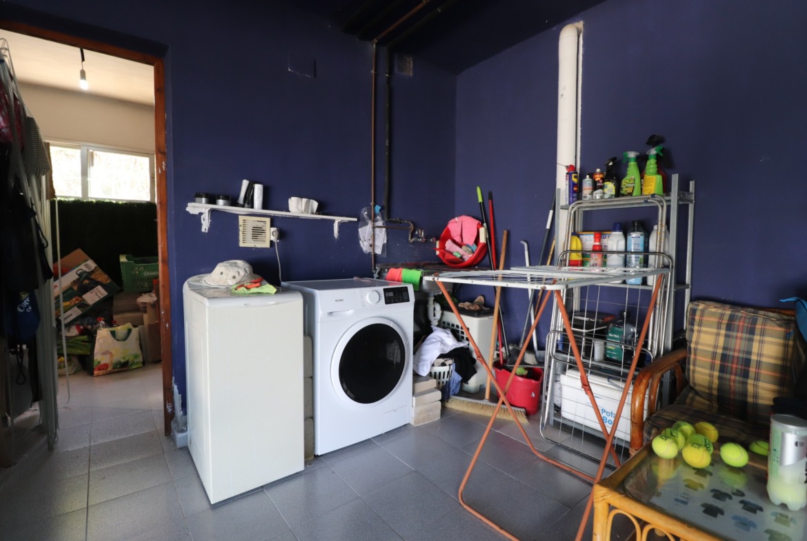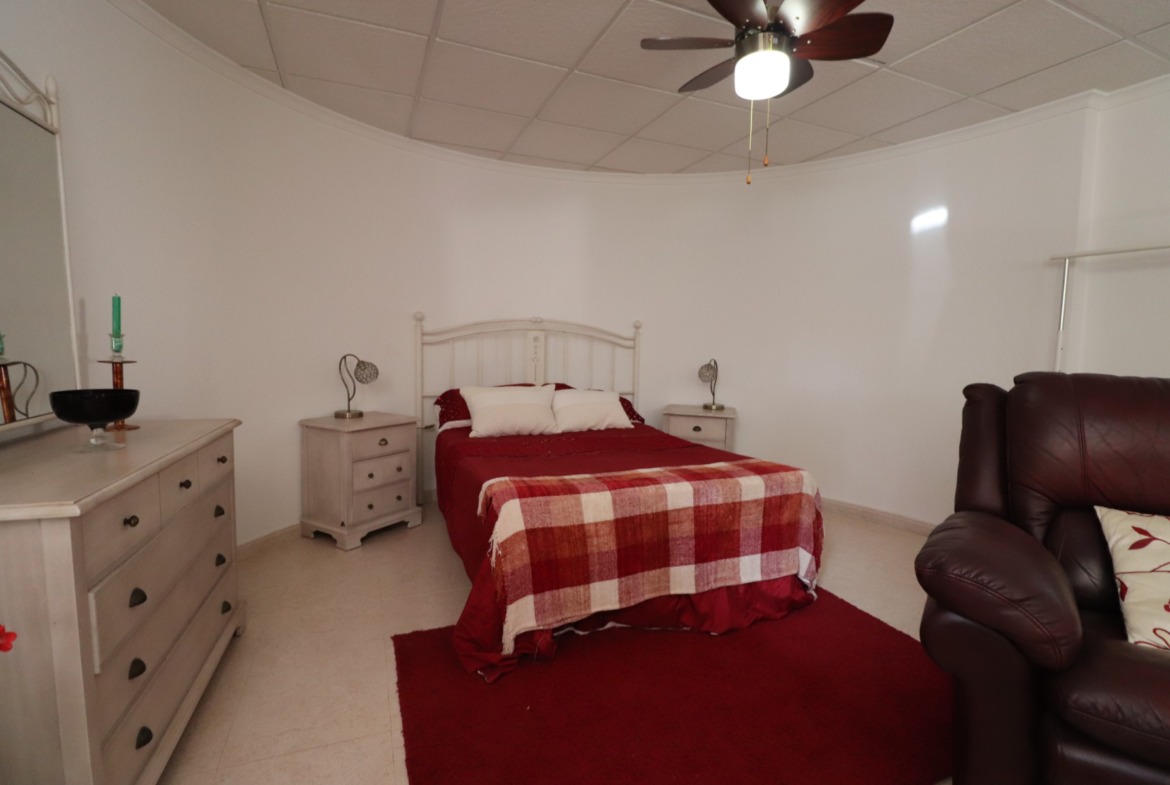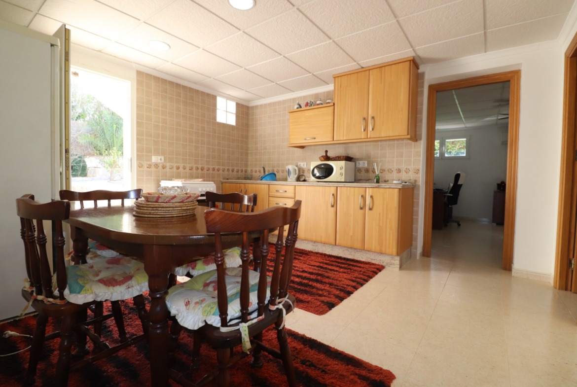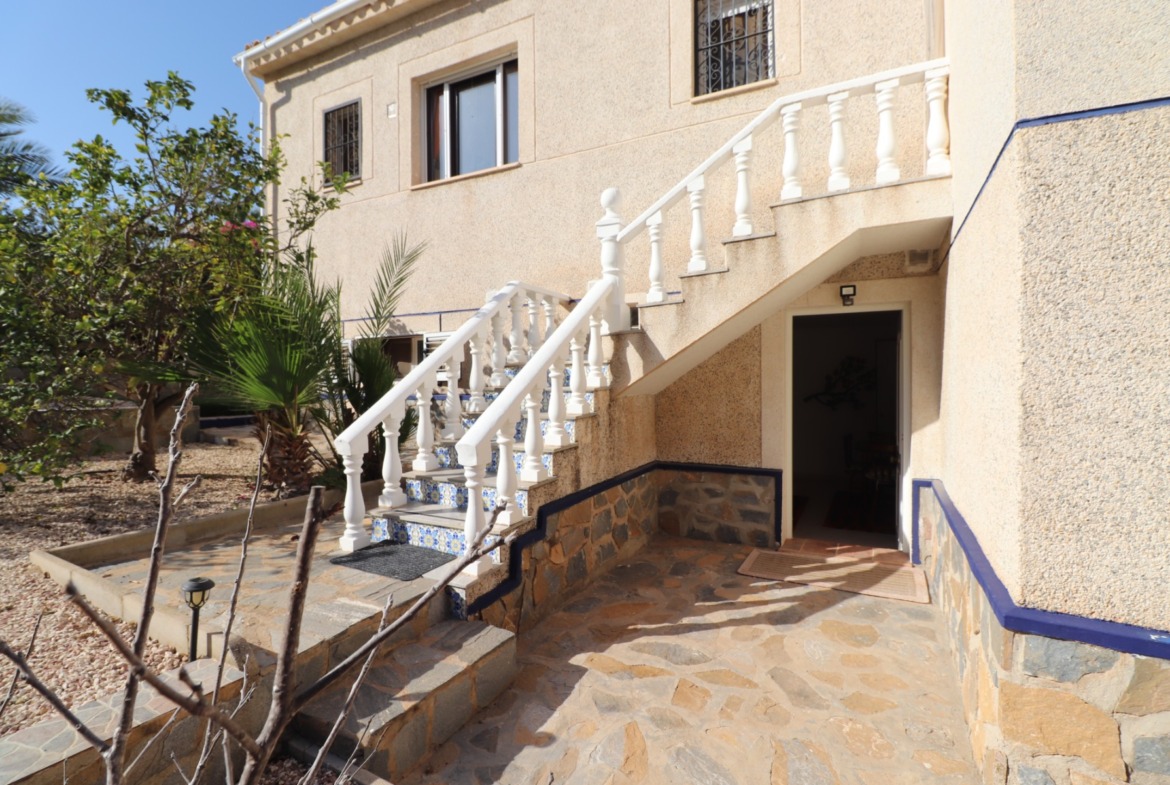 This Remarkable, West Facing, Corner, Five Bedroom Detached Villa in Lomas de La Juliana is located in a prominent position on the Costa Blanca South, under the area of Almoradi but closer to and conveniently situated between Algorfa village and the prestigious La Finca Golf, Hotel & Spa Resort. With a tennis club just at the top of the road and main brand amenities only a few minutes’ drive away, the blue flag beaches of Guardamar del Segura are also just 15 minutes away! This incredible property spans an impressive 375m² build size on a stunning 1,149m² plot, offering panoramic views of the countryside, citrus groves, mountains, and sunsets. The main villa has been fully updated and modernized, retaining its character and charm, and includes three bedrooms and three bathrooms. Upon entering, the hallway leads to an open-plan, fully fitted kitchen with a breakfast bar, a spacious family-sized living room with a cozy log-burning fireplace, and direct access to the large front covered terrace, perfect for appreciating the breathtaking views. There’s also a dining room with rear garden access, a shower room, and two bedrooms on the ground floor, one with an en-suite bath and shower. The upper-level master bedroom features a walk-through wardrobe, dressing table, and an en-suite shower room. The separate annex, located in the under-build, provides two additional bedrooms and a bathroom, accessed via the double garage or independently from the rear. This space includes a separate kitchen and dining area, a large bedroom with a living area and office, plus an en-suite shower. The garage is currently used as a games room with a pool table, ping pong, utility space, and an adjoining storeroom. Outside, the gravelled and tiled garden features an updated private swimming pool, a BBQ area, a small putting green, and ample space for outdoor dining and entertaining. Additional highlights include a carport, off-road parking, oil central heating, air conditioning throughout, ceiling fans, fitted wardrobes in the main villa, and dual entrances from different roads. This is an extraordinary opportunity to own a substantial and versatile property with fantastic views in an enviable location!