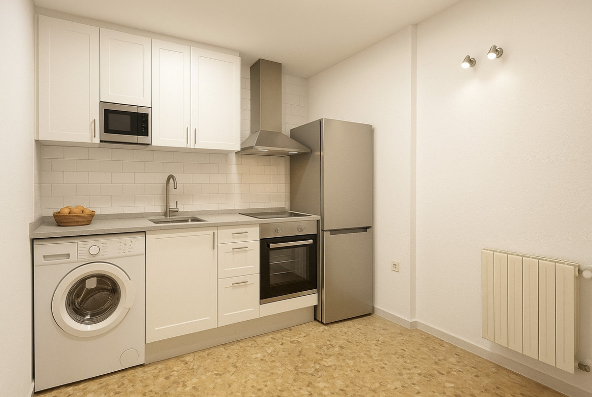 It includes a pre-installed kitchen , not yet assembled, and 3D renderings that showcase the aesthetic potential of the space, especially the kitchen and secondary bedroom. The building has an elevator, and there is also a supermarket and cafe nearby , offering maximum convenience and accessibility .