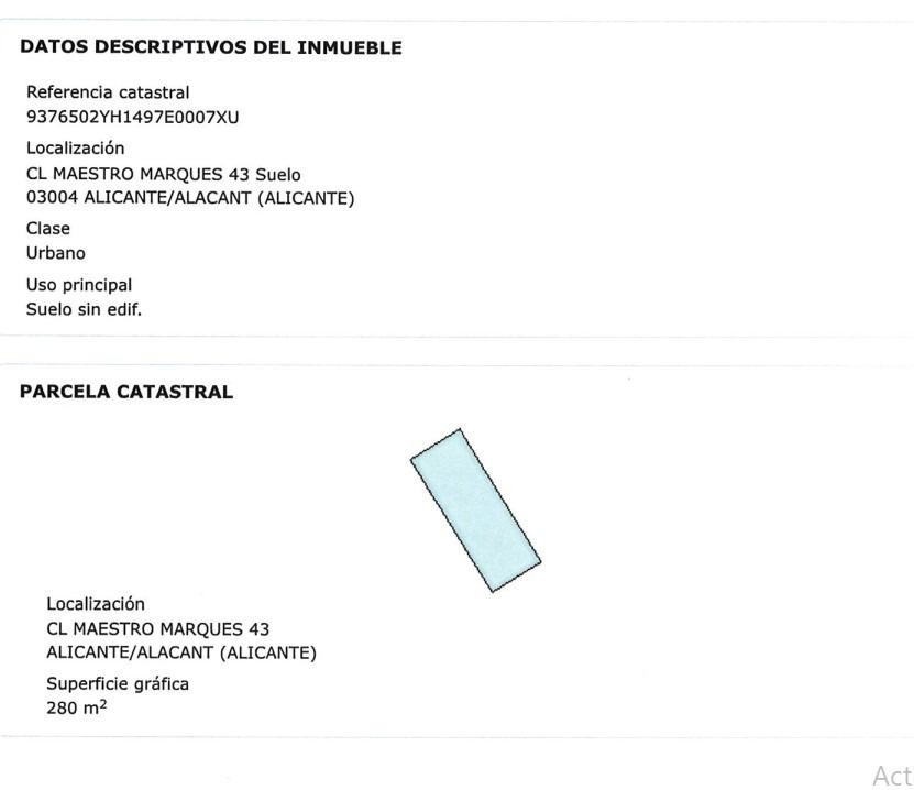 For sale Building Site. Location Alicante (ALICANTE). Total area 0.00 m2. Number of rooms – 0. Number of bedrooms 0. Number of bathrooms 0. Plot area 280 m2. Orientation North.