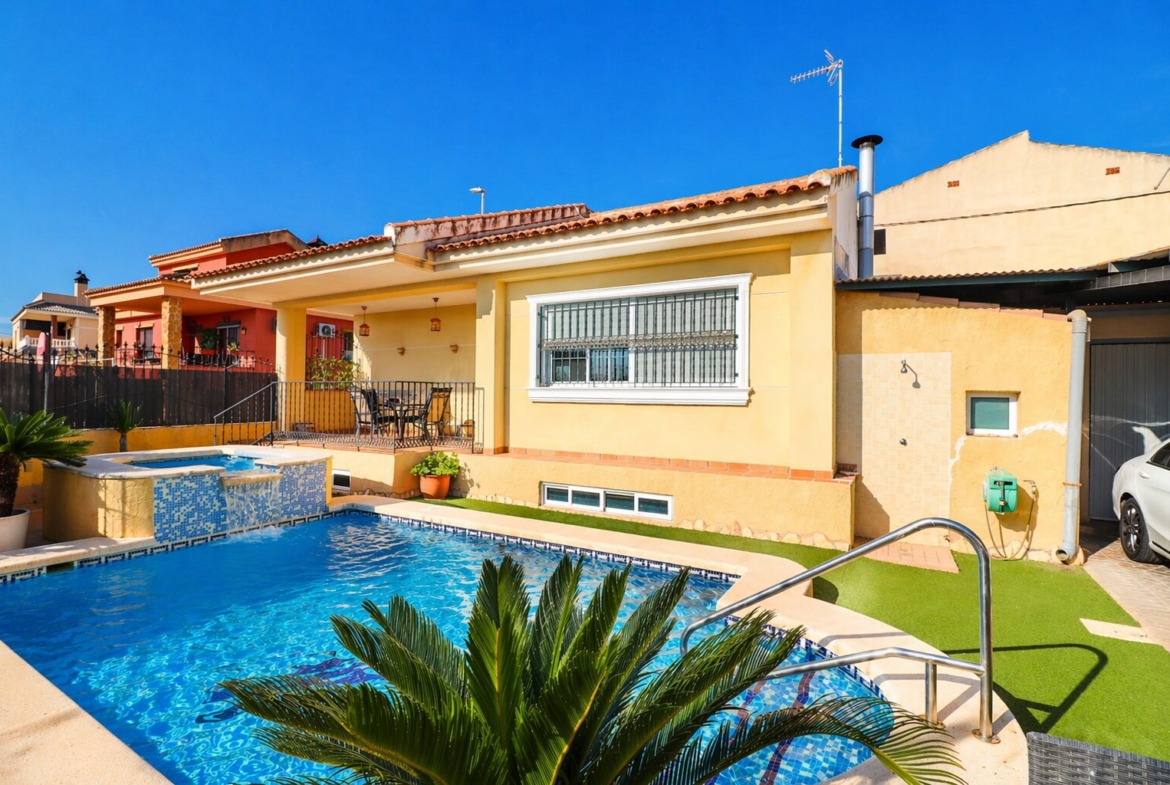 This South Facing, Three Bedroom, Detached Villa in El Saladar, is located in a well-known residential area on the outskirts of Almoradí town, which is just a 5 minute drive away. A variety of café bars can be reached within a 5 minute walk, while the beautiful beaches are approximately 20 minutes away. Golf enthusiasts will appreciate the proximity to the prestigious La Finca Golf 5* Hotel and Spa Resort, only a 15 minute drive, all set within the sought-after Costa Blanca South. This 130m² family home offers comfortable and practical living space. The main living area features a log burner, creating a warm and welcoming atmosphere, and an archway leads into the family-sized kitchen/dining room. From here, a door opens onto the patio and utility area, with steps leading up to the solarium. There is also direct access into the impressive 85m² garage. The villa comprises three double bedrooms, two of which have built-in wardrobes, along with a modern family shower room featuring a walk-in shower. Ducted air conditioning is installed throughout the property. Set on a generous 368m² plot, the exterior is designed for both relaxation and entertaining. There is a car port for two cars, along with a large garage space that can also be used as a family or entertainment area, complete with a fitted kitchen and there is an external WC. A covered terrace overlooks the private swimming pool with jacuzzi, surrounded by astro turf and enjoying open countryside views. Additional features include solar panels serving hot water and internal access to under build storage. This is a superb opportunity to own a spacious detached villa in a peaceful yet well-connected location on the Costa Blanca South, ideal as a permanent residence or family holiday home.