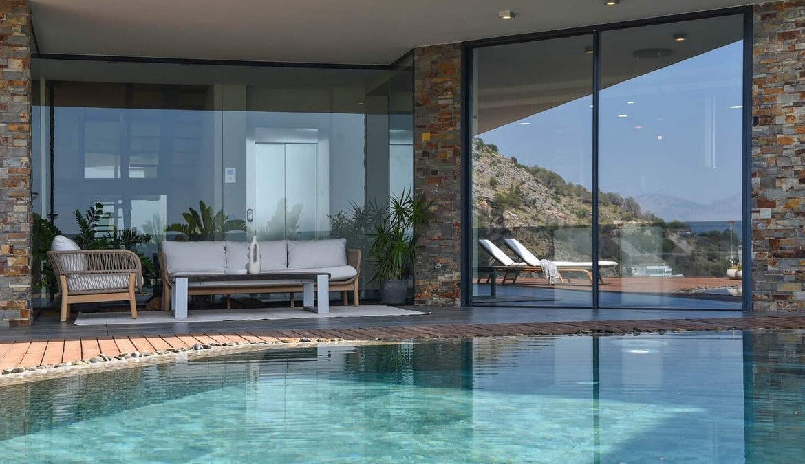 The property offers a range of luxury amenities, including a lift for easy access to each level, a large saltwater pool for summer days, an additional space with a jacuzzi and sauna for your moments of relaxation, an elegant Art Nouveau fireplace for cooler evenings, and a spacious car park for several vehicles.