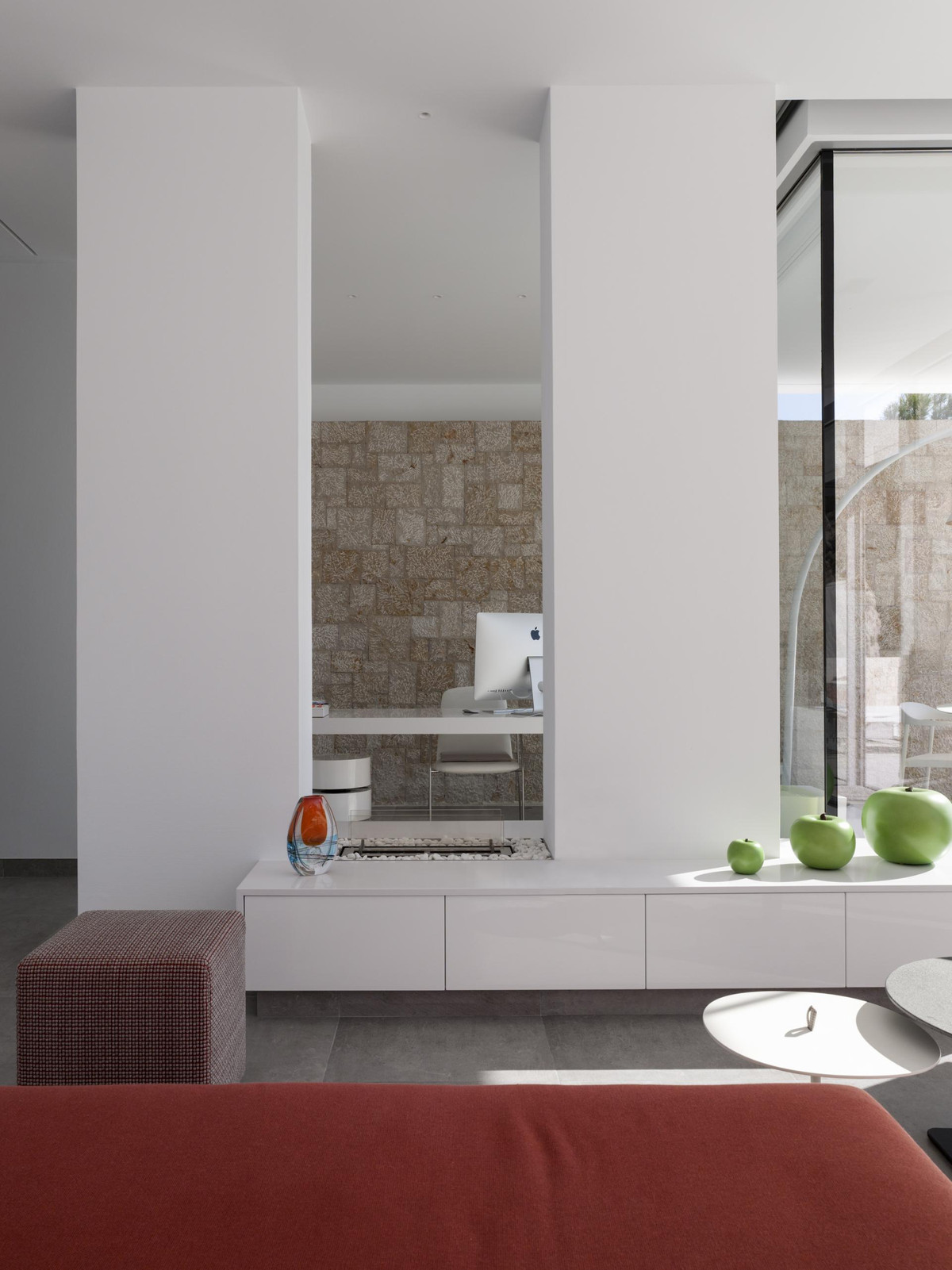 One floor down, you reach the living area, an open American-style luxury kitchen with island, a large open-plan lounge and an additional room currently used as an office space.
