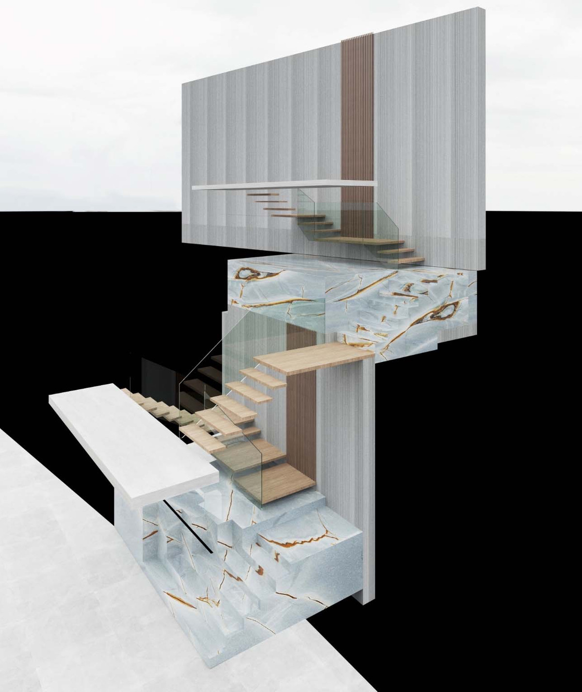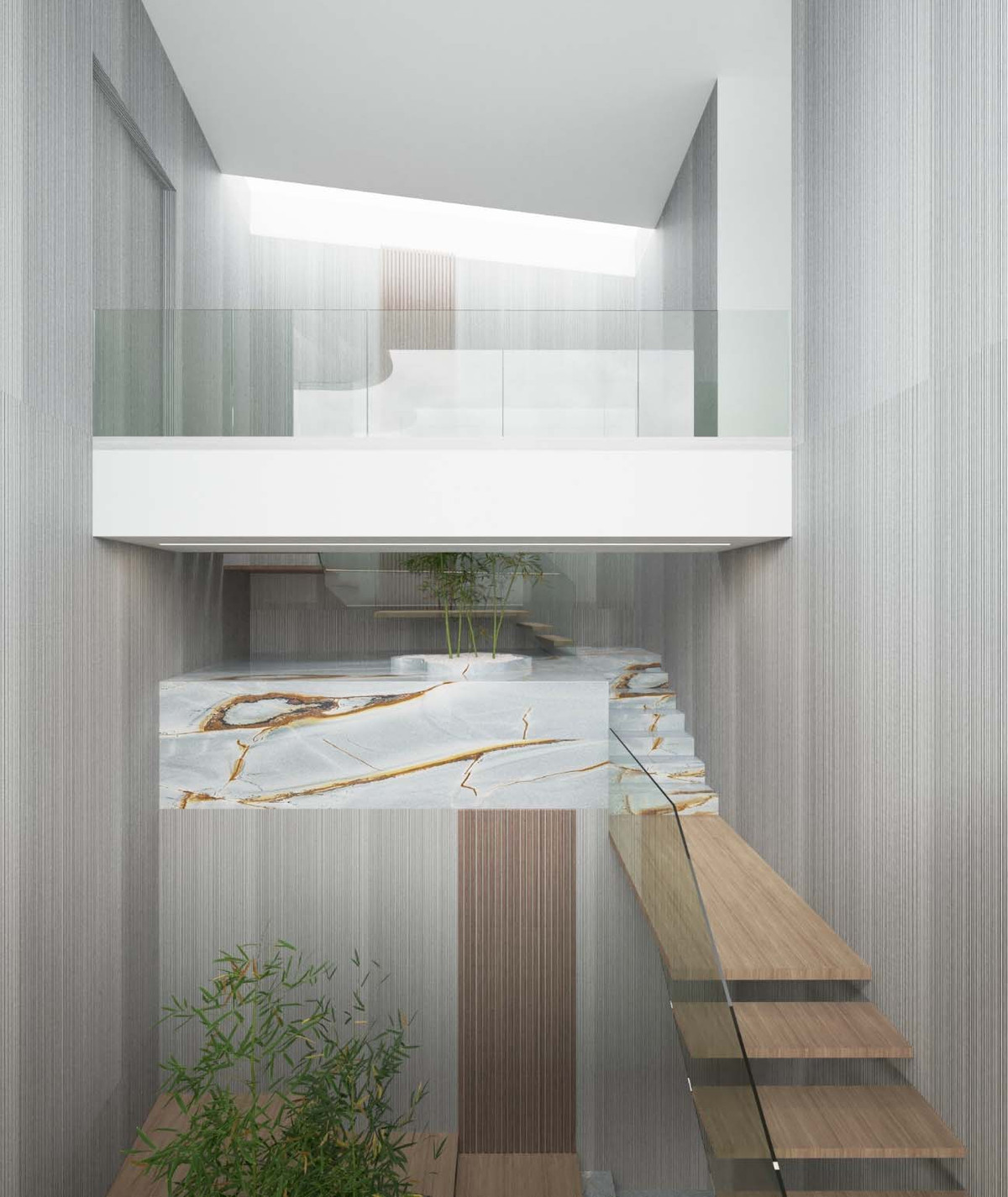 Level 3 houses the master bedroom, which includes two large walk-in closets, a bathroom with a shower and bathtub, and a separate toilet. The living room is connected to the dining area and the kitchen, behind which there is a large pantry. All rooms on this level feature expansive glass walls. The foyer also has a guest bathroom.