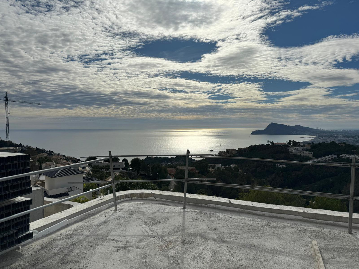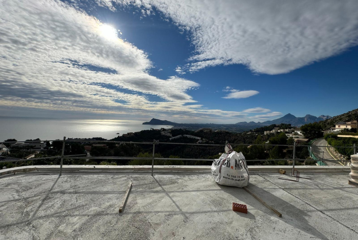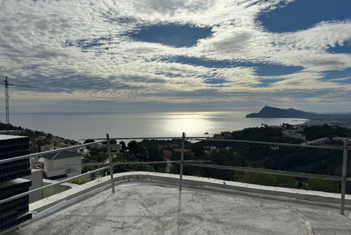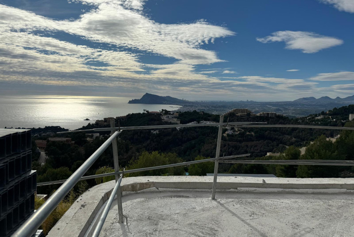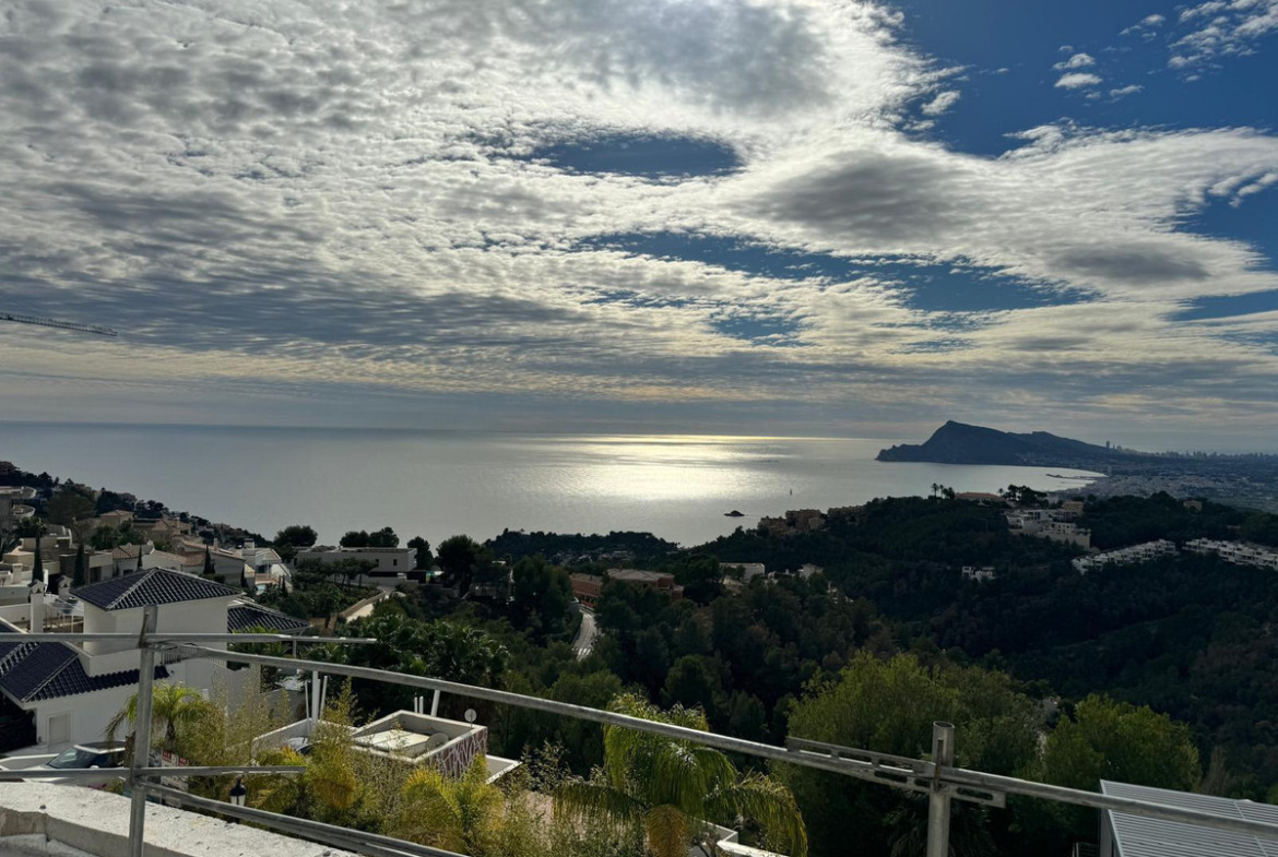 The villa features ultra-modern architecture. Every room, bathroom, living room, dining room, and kitchen offers panoramic views of the Mediterranean Sea, Altea, and Benidorm. The house spans three floors connected by a glass elevator and an impressive staircase.