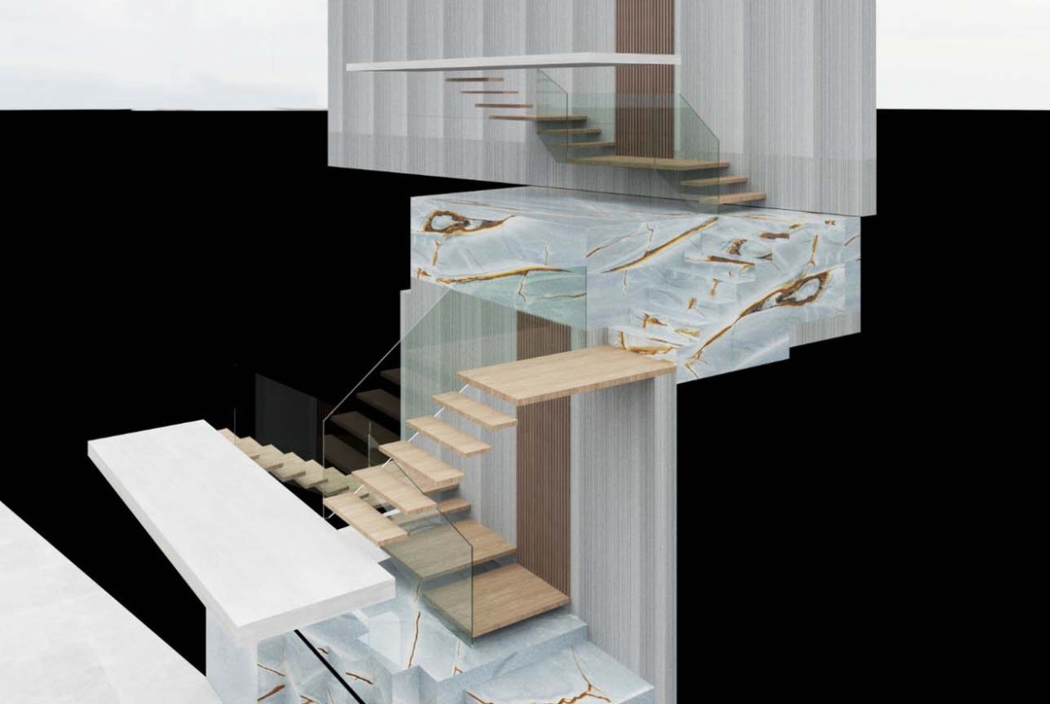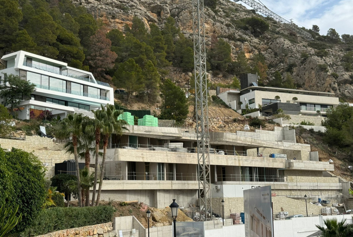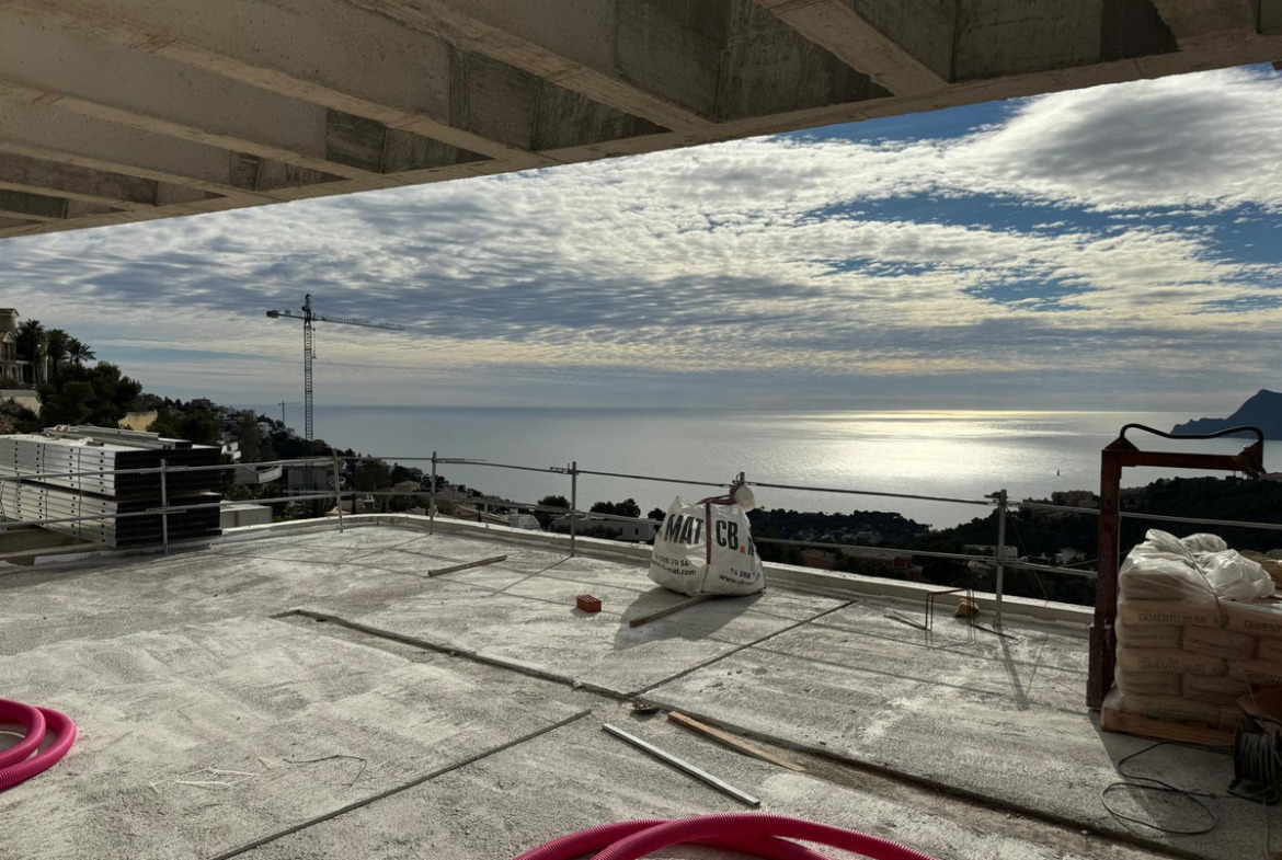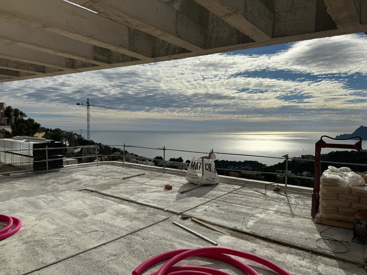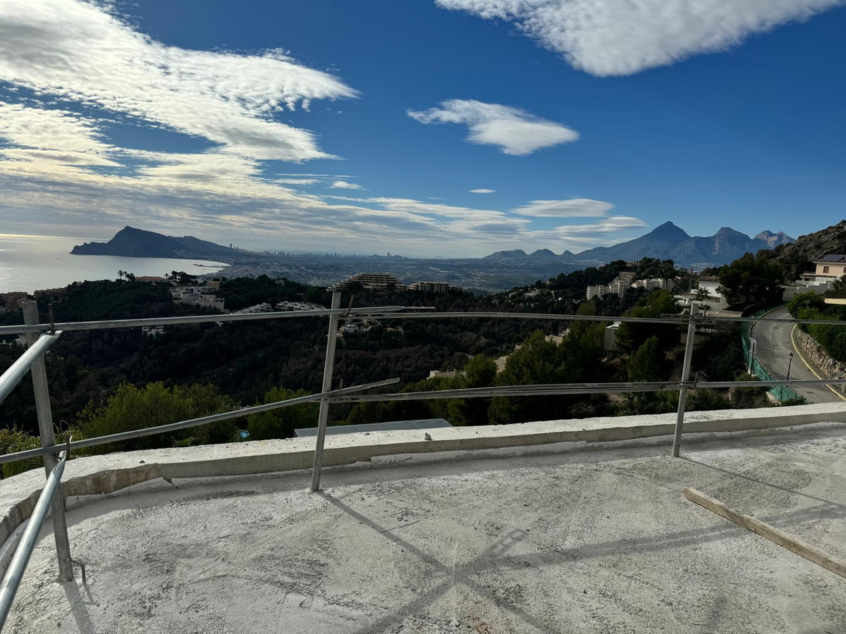 The villa features ultra-modern architecture. Every room, bathroom, living room, dining room, and kitchen offers panoramic views of the Mediterranean Sea, Altea, and Benidorm. The house spans three floors connected by a glass elevator and an impressive staircase.