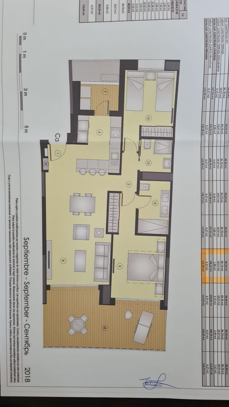 The living area comprises a living room with a dining area and an open kitchen, a semi-open utility room, two bedrooms, two bathrooms and a large terrace.