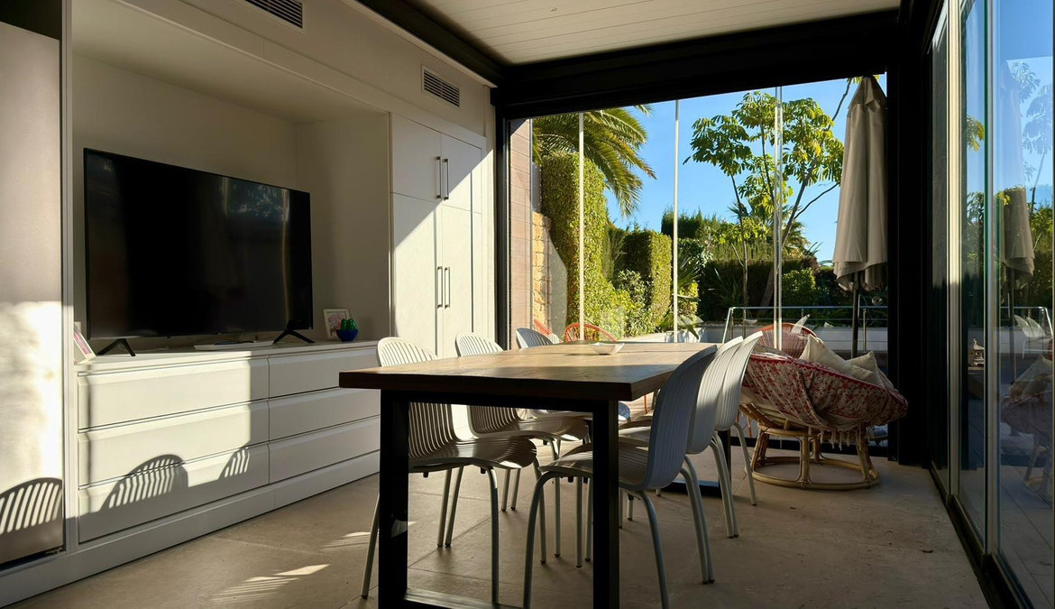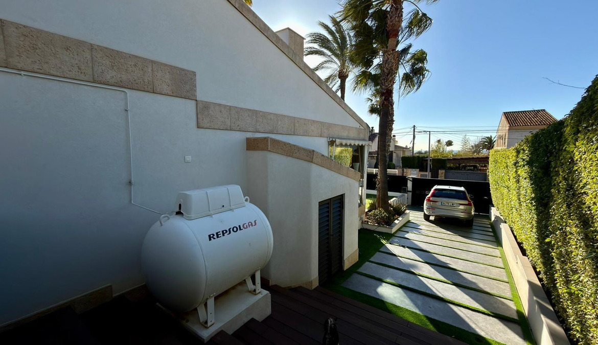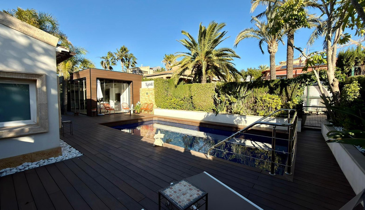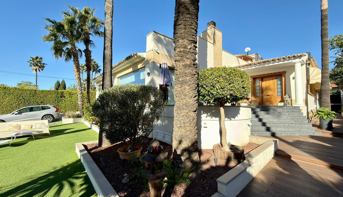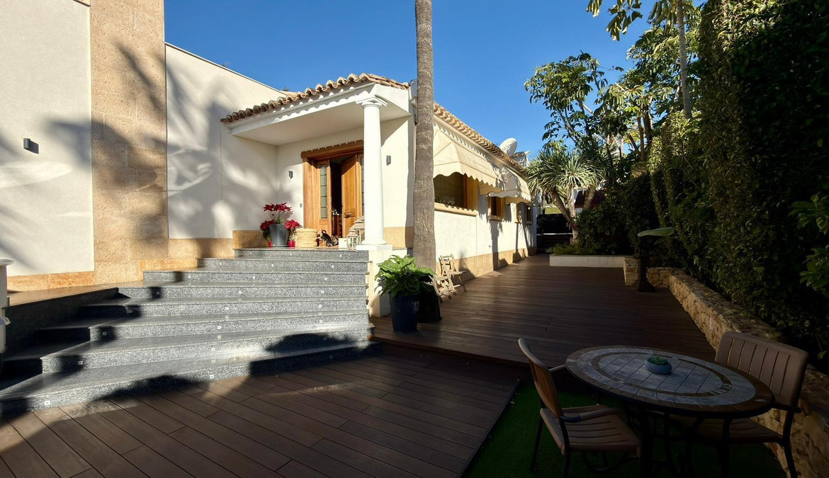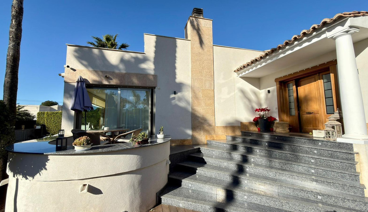 We present to you an exclusive luxury villa located in a prestigious residential area between Benidorm and La Nucía. The property is situated on a spacious plot of 984 m² and has a built area of 258 m², distributed over two floors that perfectly combine elegance, comfort, and functionality.Upon entering the house, a cozy hallway leads to a spacious and bright living room, an elegant dining room, and a charming glazed terrace with marble floors, from where you can enjoy beautiful views of the well-tended garden surrounding the house.The home has been completely renovated using high-quality natural materials, including premium wooden floors. The resting area has two comfortable bedrooms that share a complete bathroom, in addition to a large master suite with a spacious dressing room and a bright en-suite bathroom with natural light, equipped with a bathtub, independent shower, and double sink.Additionally, the home features an independent bedroom with a private bathroom, ideal for guests or family members, offering maximum comfort and independence. This space is conveniently connected to the fully equipped kitchen and the laundry area.The kitchen has direct access to a side terrace, perfect for outdoor dining. From there, you can access an impressive glazed barbecue area with a courtesy bathroom and direct access, through an elegant wooden deck, to the pool and solarium.On the plot, there is also a space designated for the storage of sports and nautical equipment. The upper floor has a spacious multifunctional room that can be used as an office, game room, or leisure area, in addition to two cozy guest bedrooms that share a complete bathroom.The garden, carefully designed, combines different shades of green with majestic palm trees and abundant vegetation, creating an intimate, relaxing, and very exclusive atmosphere.The urbanization offers 24-hour private security, a communal pool, tennis courts, and a social club.A unique opportunity to acquire a truly exclusive property in one of the most sought-after areas of the Costa Blanca. Contact us to arrange a private visit.
