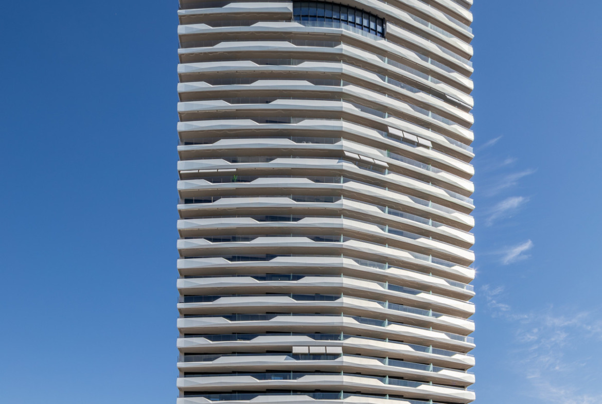 A superb glass tower rising in front of the sea.​