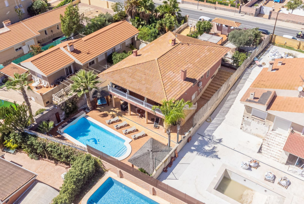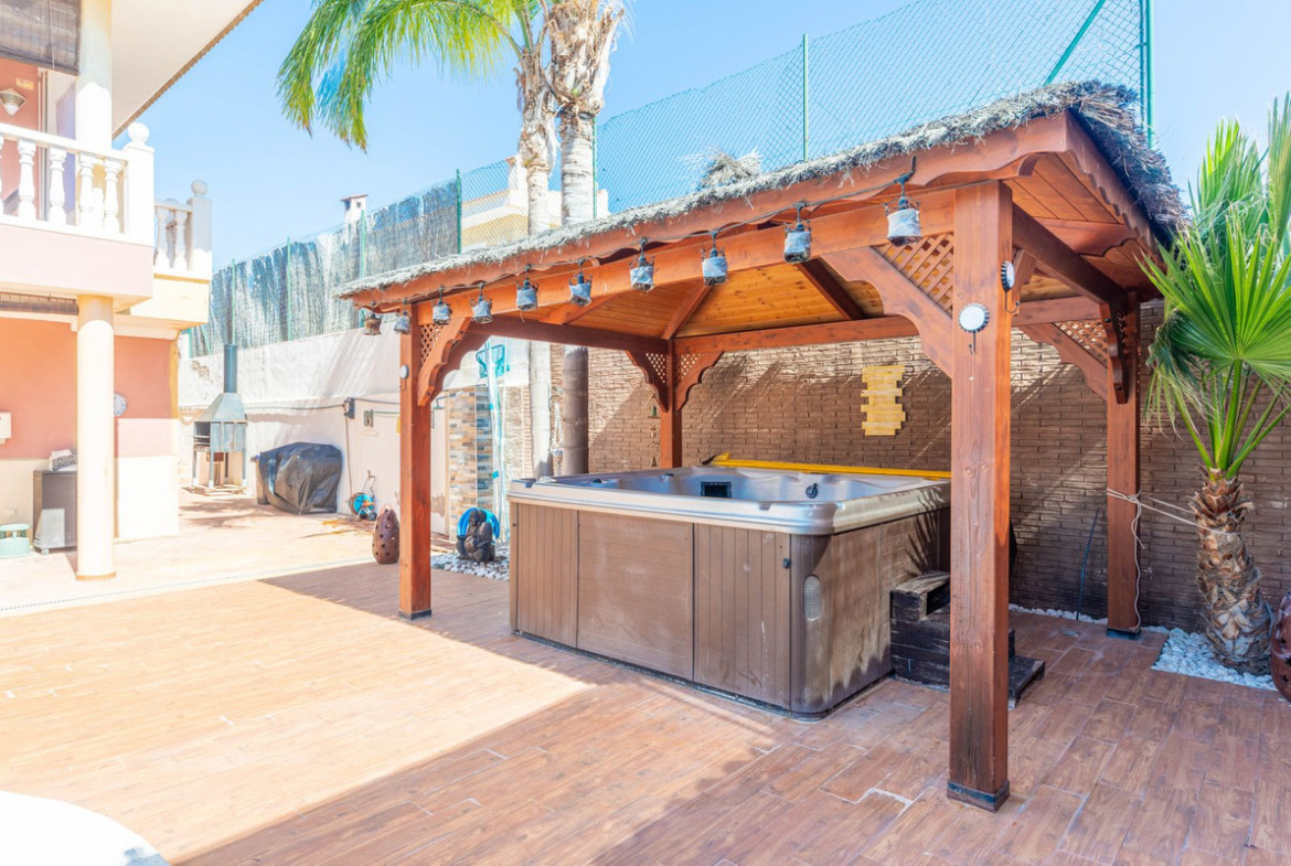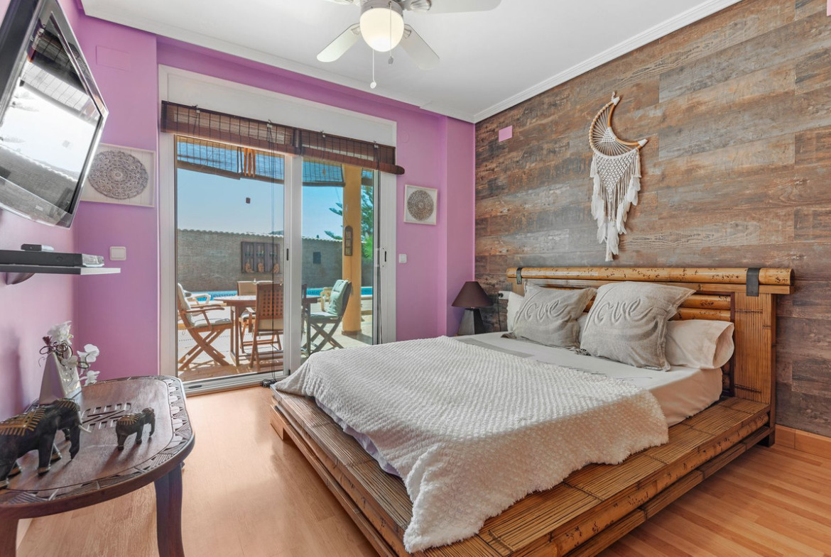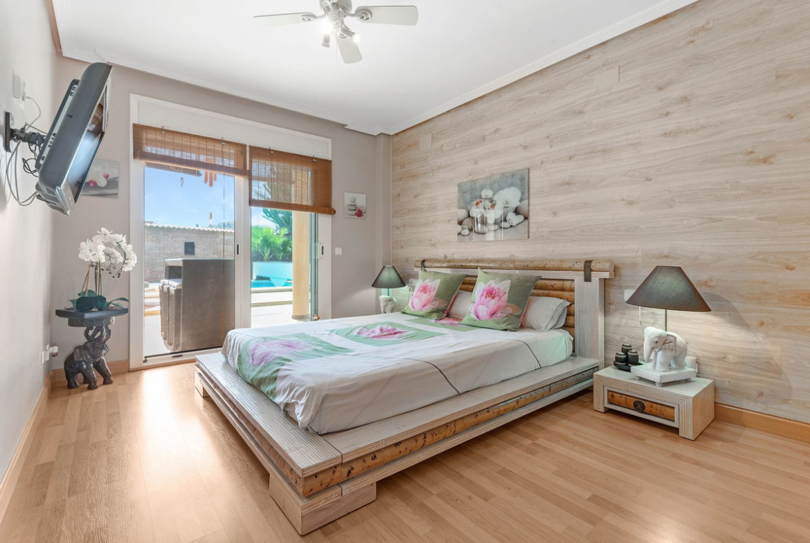 Located in the sought-after area of Partida Bonalba, Busot, between the golf course and the charming village of Busot, is this remarkable residence: Villa Bali. Renovated to a high standard, it offers over 330 m² of living space. Situated on a private plot more than double its size, this villa enjoys easy access to the village of Busot, just a five-minute drive away, 15 minutes from the pristine beaches of El Campello-San Juan, and only 25-30 minutes from Alicante and its international airport.