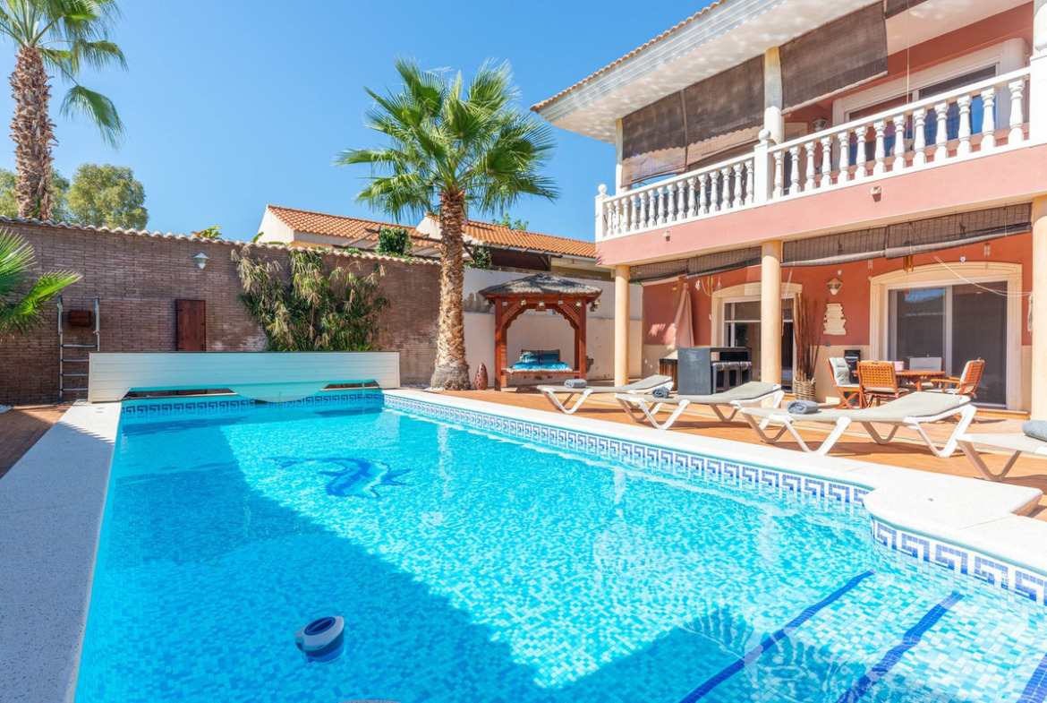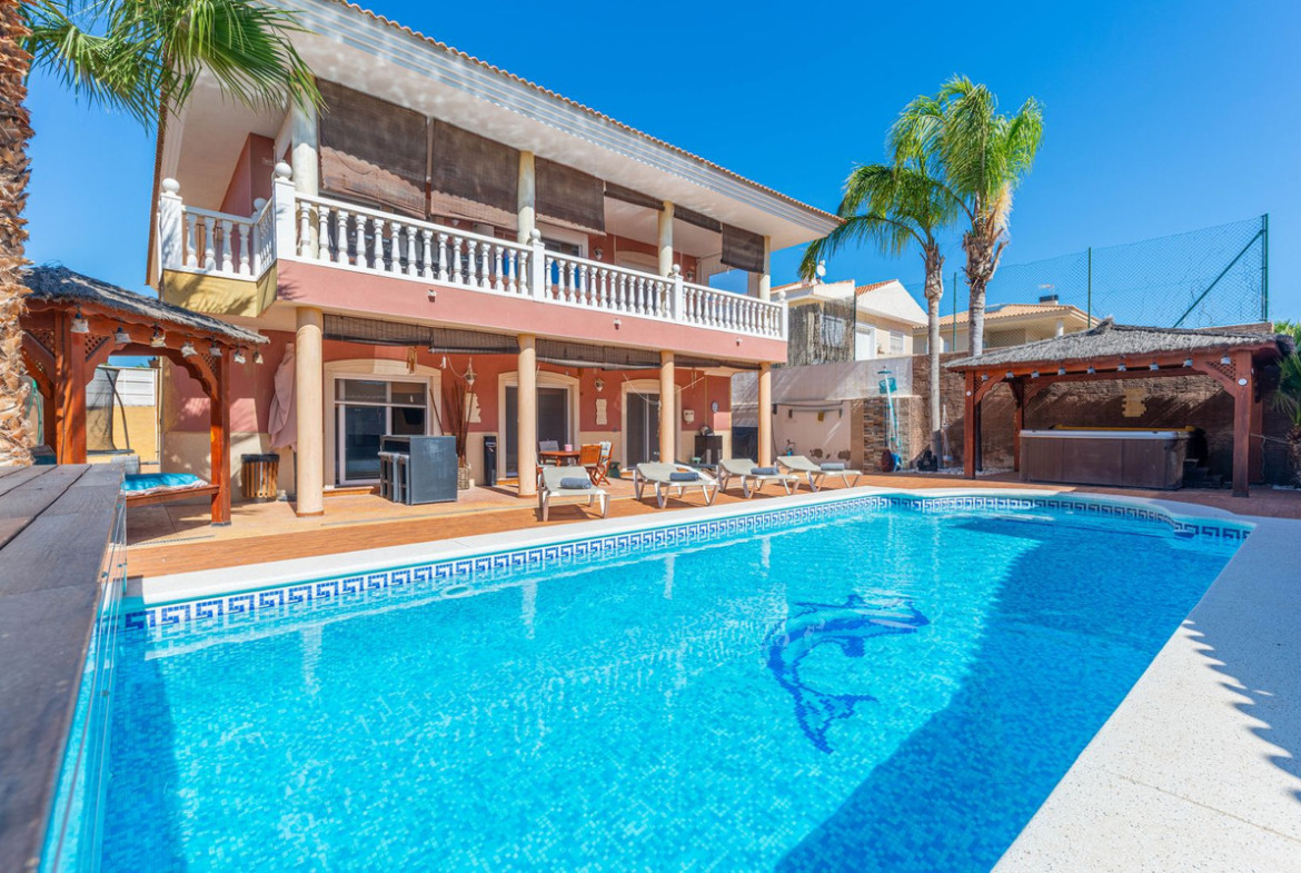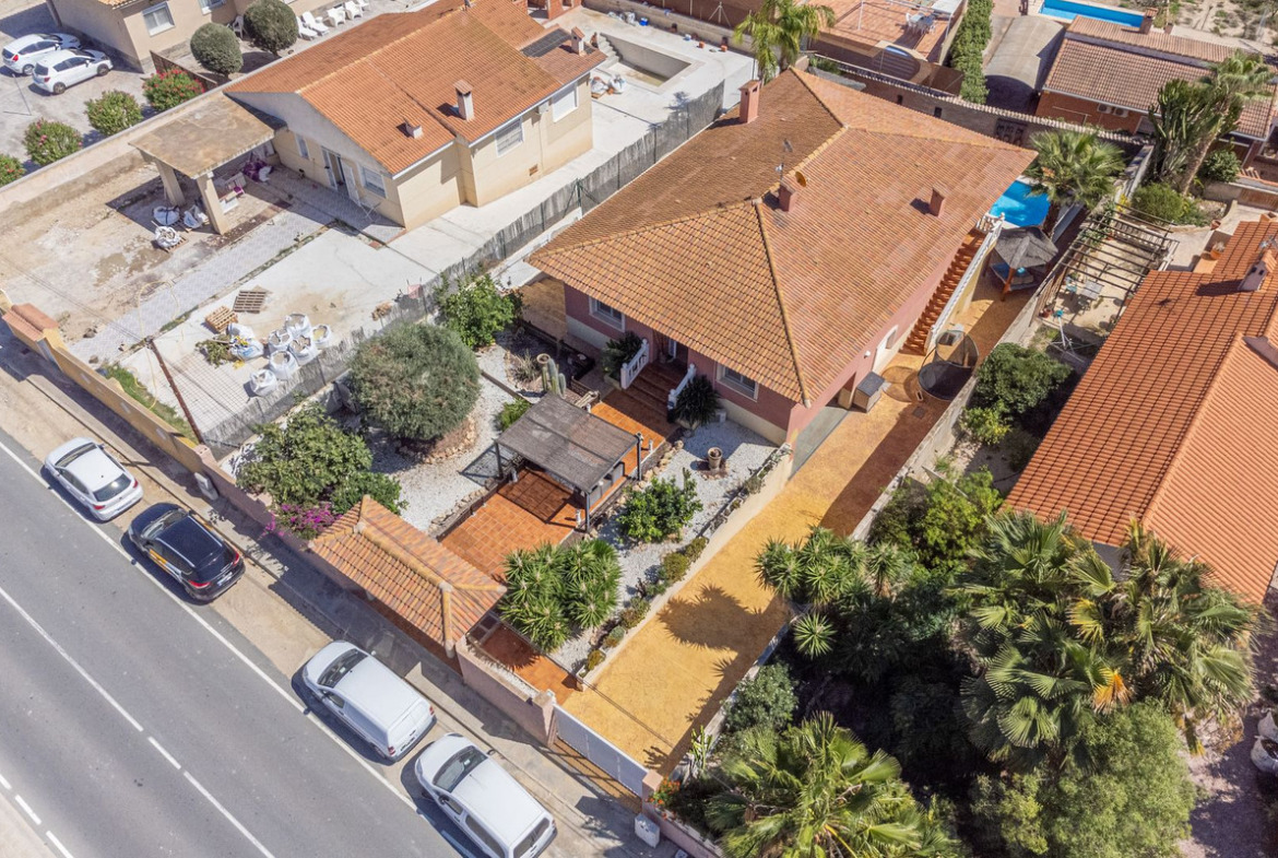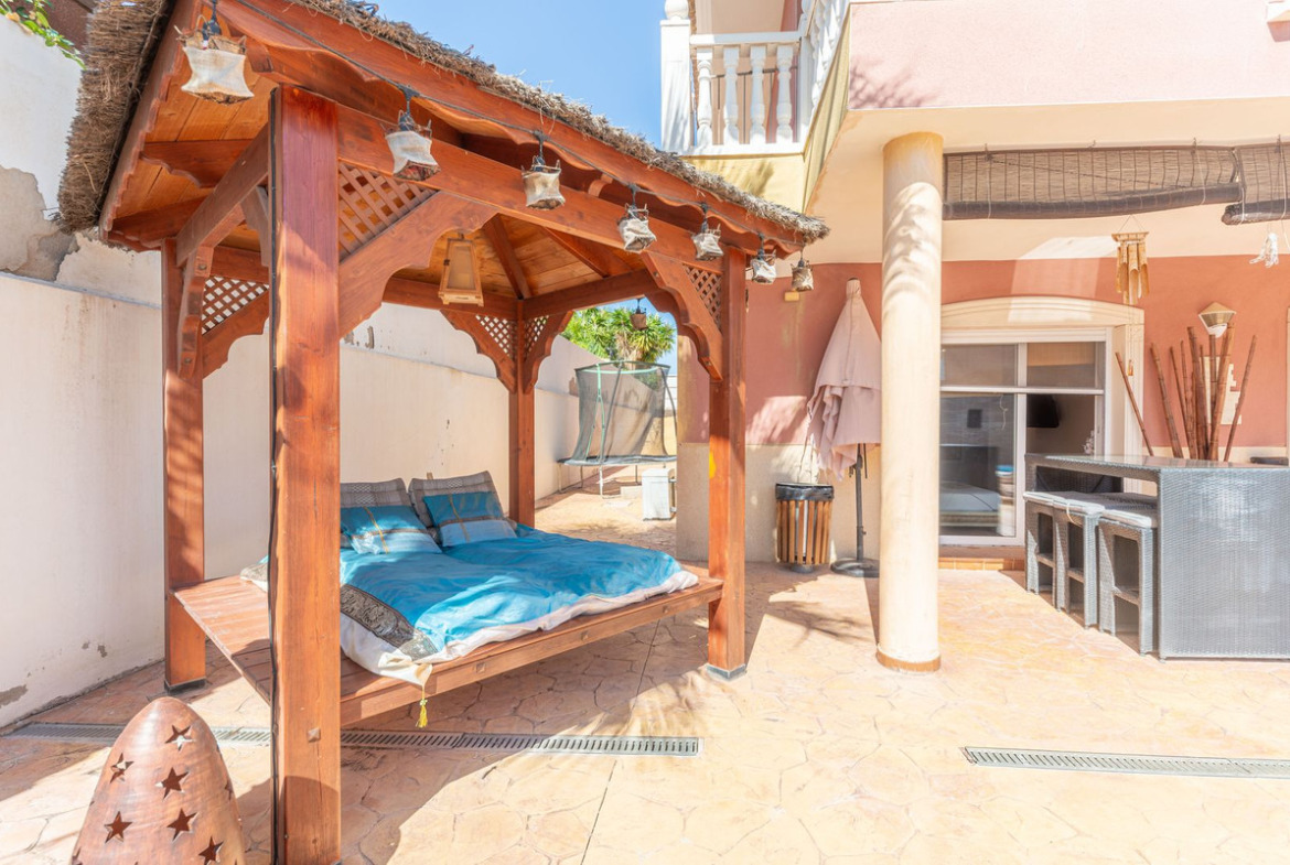 Located in the sought-after area of Partida Bonalba, Busot, between the golf course and the charming village of Busot, is this remarkable residence: Villa Bali. Renovated to a high standard, it offers over 330 m² of living space. Situated on a private plot more than double its size, this villa enjoys easy access to the village of Busot, just a five-minute drive away, 15 minutes from the pristine beaches of El Campello-San Juan, and only 25-30 minutes from Alicante and its international airport.