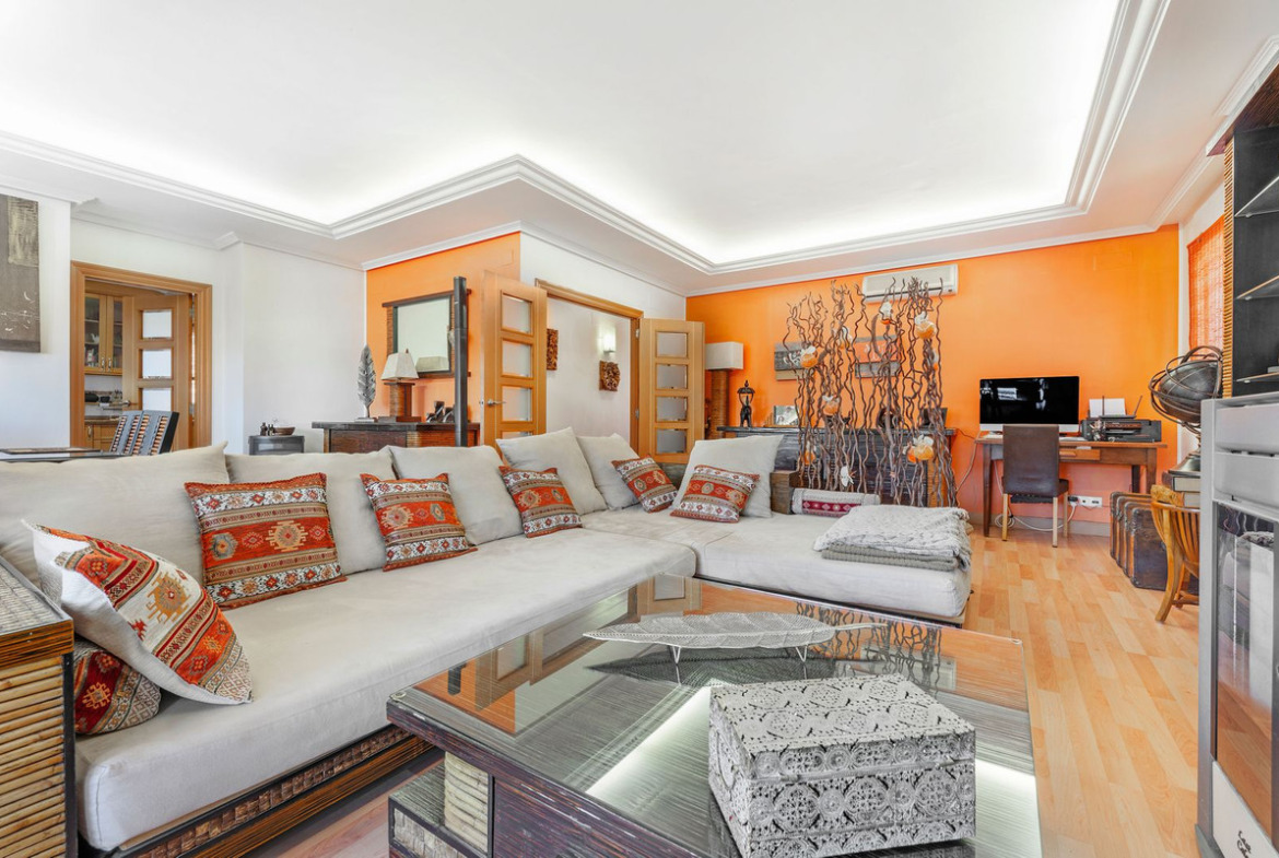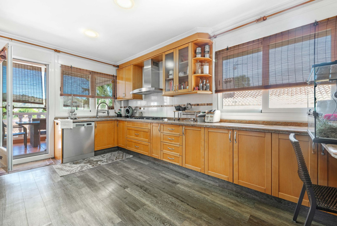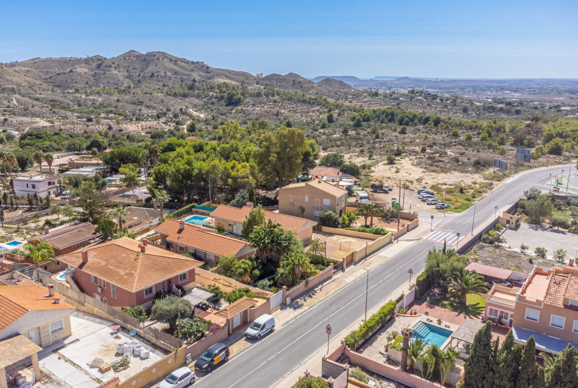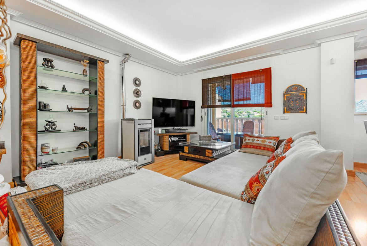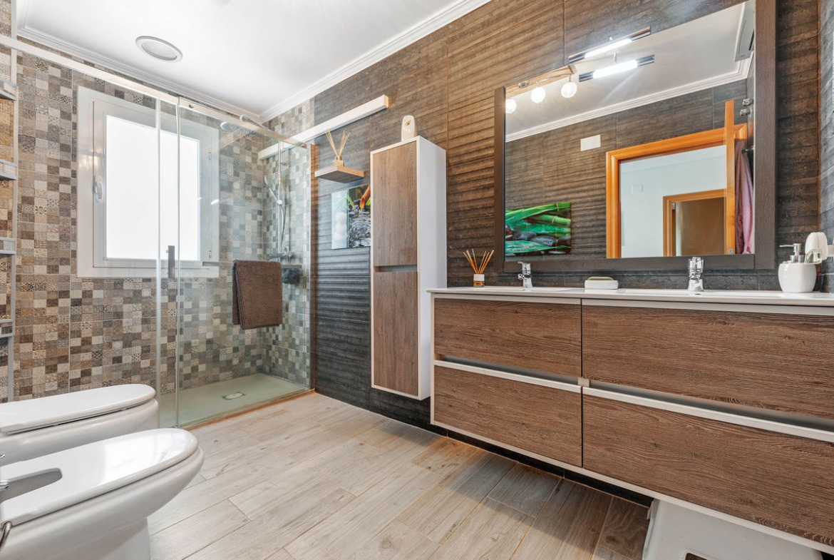 The rear of the villa is accessed via the road to Busot, where an automated gate provides access to a driveway and a garage for two cars. The upper floor is the main living area, with a spacious living-dining room featuring a wood-burning stove and electric heating inside the walls for the winter, and air conditioning for the summer. A good-sized, semi-equipped independent kitchen extends from the living room and includes a pantry and an adjacent laundry room. Both the living room and the kitchen have direct access to a large south-facing covered terrace, with views of the pool and the mountainous countryside in the distance. This floor also includes the entrance hall, two double bedrooms (one with a built-in wardrobe and the larger one with a walk-in closet and en-suite bathroom), and a separate family bathroom.