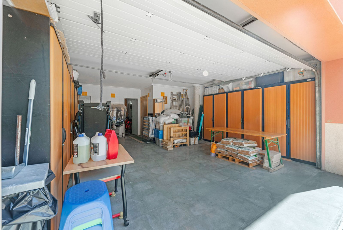 On the lower floor, you'll find three additional double bedrooms, along with a family bathroom with a shower. This floor also includes a living room, dining room, storage room, and an enclosed garage for two vehicles. From here, there is direct access to the pool terrace.