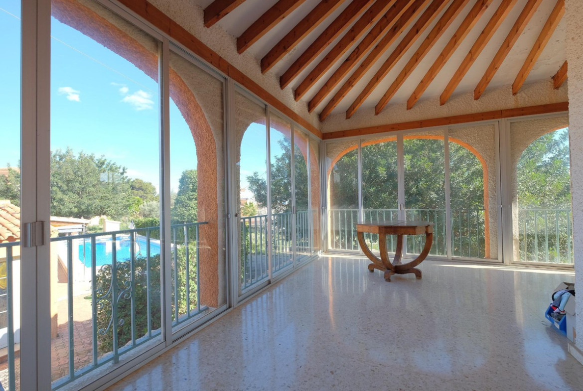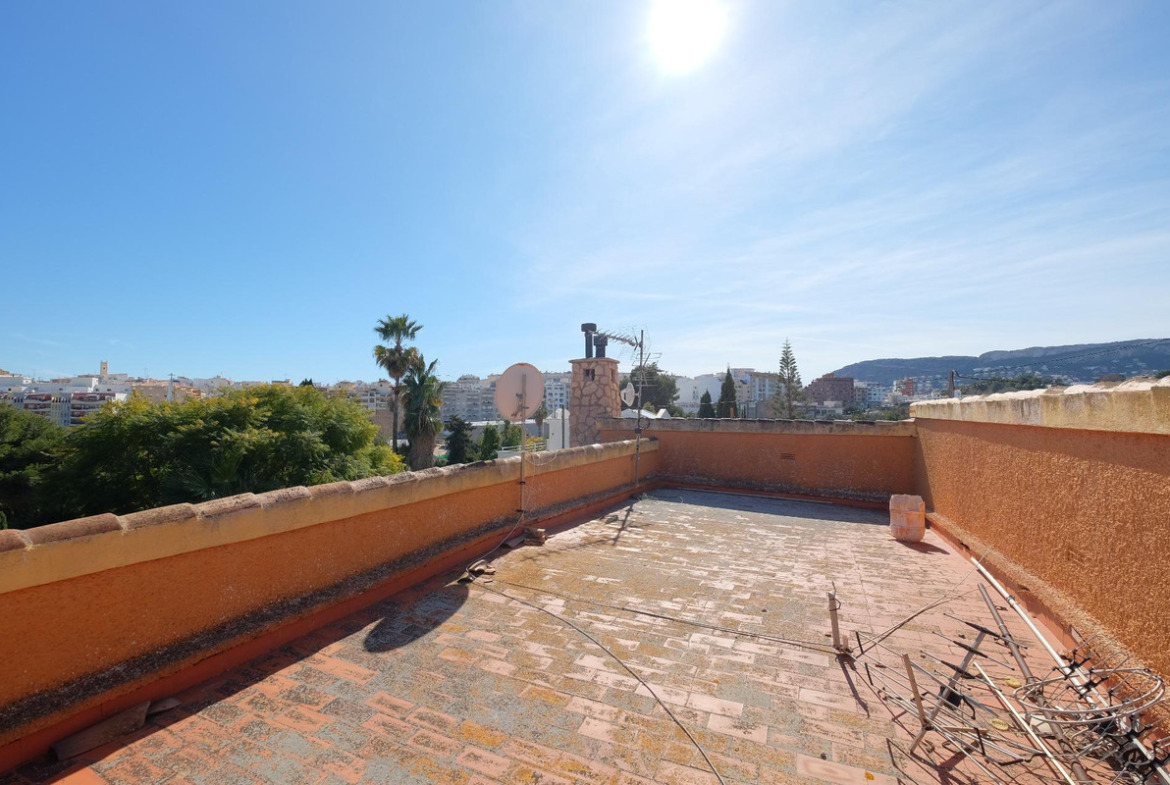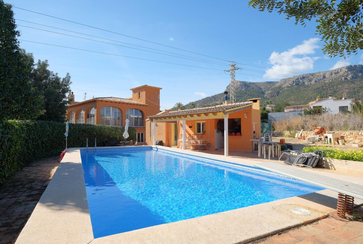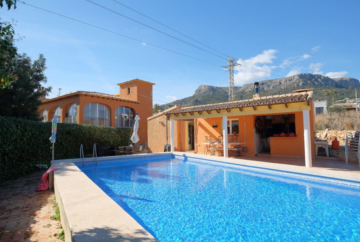 Villa of 426m2 with a large plot of 2.752m2 near the center of Calpe.~~This spectacular villa offers many possibilities: it is ideal to accommodate a large family, rent it as a tourist property or even transform it into a charming hotel. Its location is magnificent, just 500 meters from the center of Calpe and 1.5 km from the beaches; Supermarkets and schools are less than 1 km away, so you can easily reach them on foot. You will not find a house as spacious and close to all services in Calpe.~~The villa is currently divided into two buildings, a main house of 391m2 and a guest apartment next to the pool with an area of 35m2.~~The layout of the main house consists of two independent floors with an identical layout: Large living-dining room with fireplace, 4 double bedrooms, 2 bathrooms, separate kitchen and a large glazed terrace with an area of approximately 40m2. On the ground floor, the kitchen and one of the bathrooms have been renovated. On the upper floor there is a very private solarium with stunning views of the Peñón de Ifach and the mountains surrounding Calpe.~~The layout of the guest apartment consists of a living-dining room, an open kitchen, a bedroom and a bathroom with shower. This apartment has a large covered terrace with access to the 13x5m2 pool where you can enjoy good times in company. There is also an outdoor barbecue and garden areas.~~The villa is fully south facing and is sunny all day long. It has easy indoor parking, you can park about 8 cars without any problem, you will not have parking problems when you invite your friends and family.~~An additional advantage of this villa is that there is the possibility to separate the plot of 2,752 m2 to build a second house, there is plenty of space available.