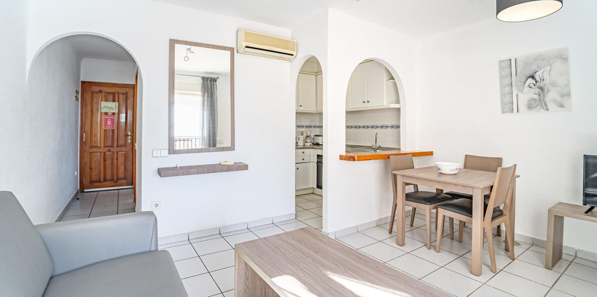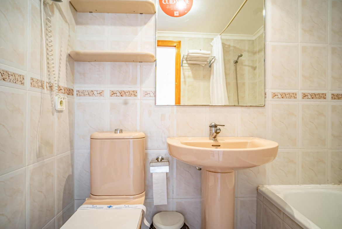 This apartment is part of a residential complex with 200 homes, located approximately 10 minutes from the center of Calpe and the sea. The apartment features a spacious bedroom, a full bathroom, a semi-open kitchen, and a living/dining room. From the living room, you can access a large terrace with stunning views of the sea and the Peñón (rock), and from this terrace, you can go up to a 23 m² solarium.