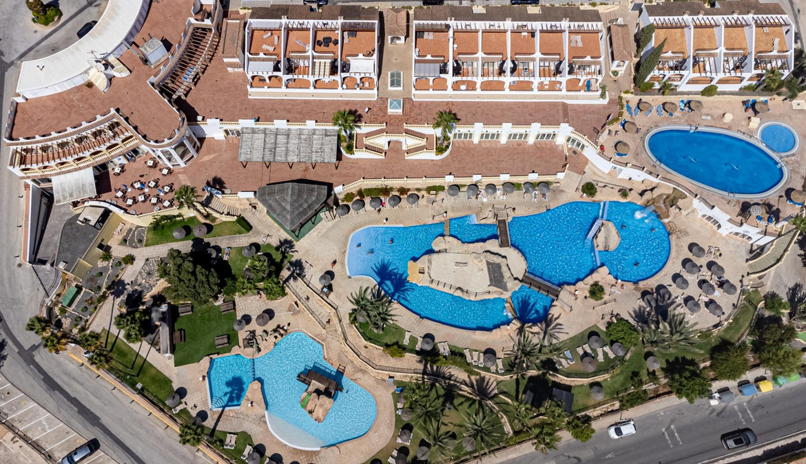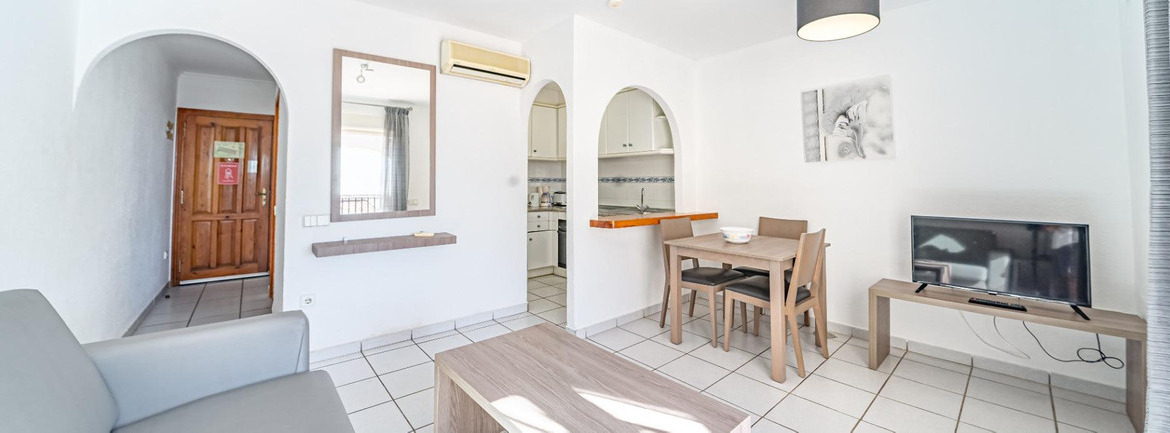 The complex includes a communal area with several swimming pools—one of which is open year-round—a café, and a reception that is open during the high season. Next to the complex, there is a large green area perfect for walks.