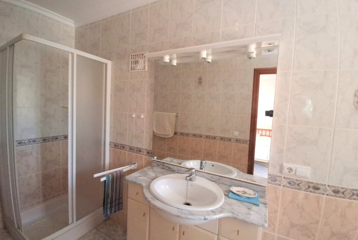 The house has two floors. On the upper floor is the main residence with a living and dining room that offers direct access to a covered terrace. There is a built-in barbecue here and from this veranda you have a view of the sea and the Peñon de Ifach. The living and dining room is open to the kitchen. A few steps down are two bedrooms that share a bathroom.