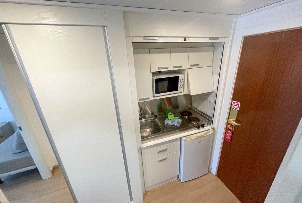 The space features a spacious living-sleeping area, ideal for creating different ambiances according to your needs. The built-in kitchen is perfectly integrated, providing everything you need for daily living. The full bathroom offers comfort and privacy, while the built-in wardrobe optimizes storage.