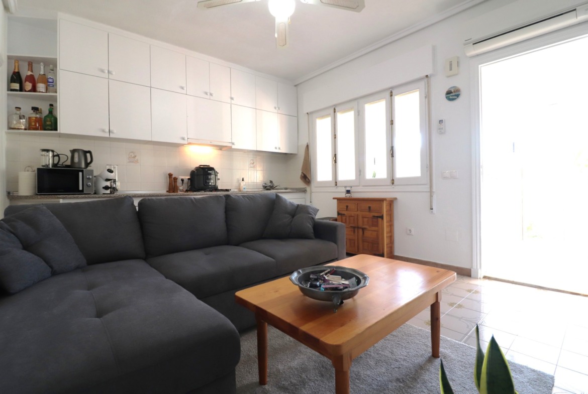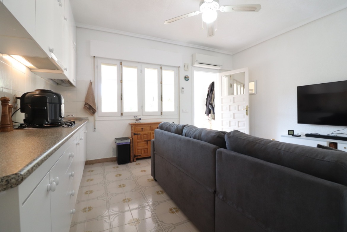 This West Facing, One Bedroom, End Bungalow in Altos de Quesada, is located in a popular residential area of Quesada, just a 5 minute walk to a well-known bar and restaurant. The main high street of Quesada and La Marquesa Golf Course are only a 5 minute drive away, with the beautiful beaches of the Costa Blanca South reachable in approximately 15 minutes. This charming property is all on one level with a 69m² build and comprises a glazed-in, spacious entrance terrace leading into the living area, an open plan fitted kitchen, separate utility area, a double bedroom with built-in wardrobe, and a shower room. Outside, the property boasts a lovely sized front garden with planted borders, a palm tree, and a combination of tiled and gravelled areas, extending down the side of the bungalow — perfect for enjoying the outdoor lifestyle. There is also space to park a car directly in front of the property. Additional features include air conditioning, ceiling fans, and the property has been freshly painted internally and externally in 2025. A fantastic, easy to maintain home in a desirable location on the Costa Blanca South.