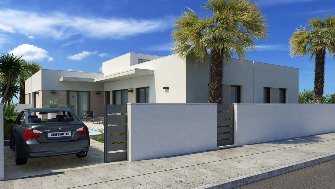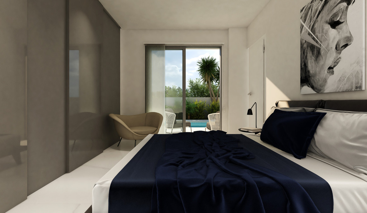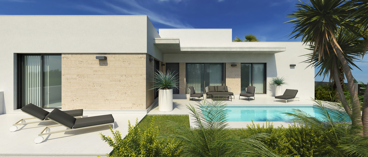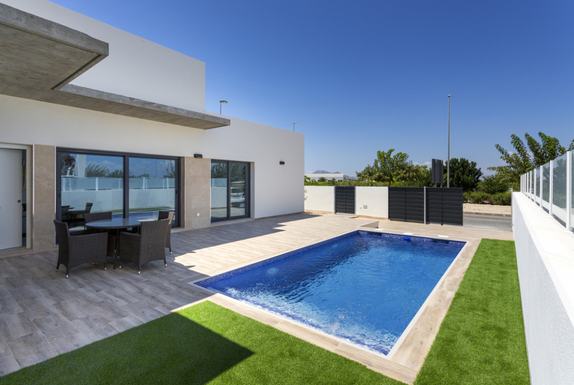 New build villas all on one floor in the new part of Daya Nueva. A few minutes walk to the centre of the town. The property has 3 bedrooms, 2 bathrooms, and a private swimming pool of 18m2. Living / dining area with double height ceiling, open plan kitchen, natural light and option for solarium. The master bedroom has option for a walk in closet and bathrooms en suite.