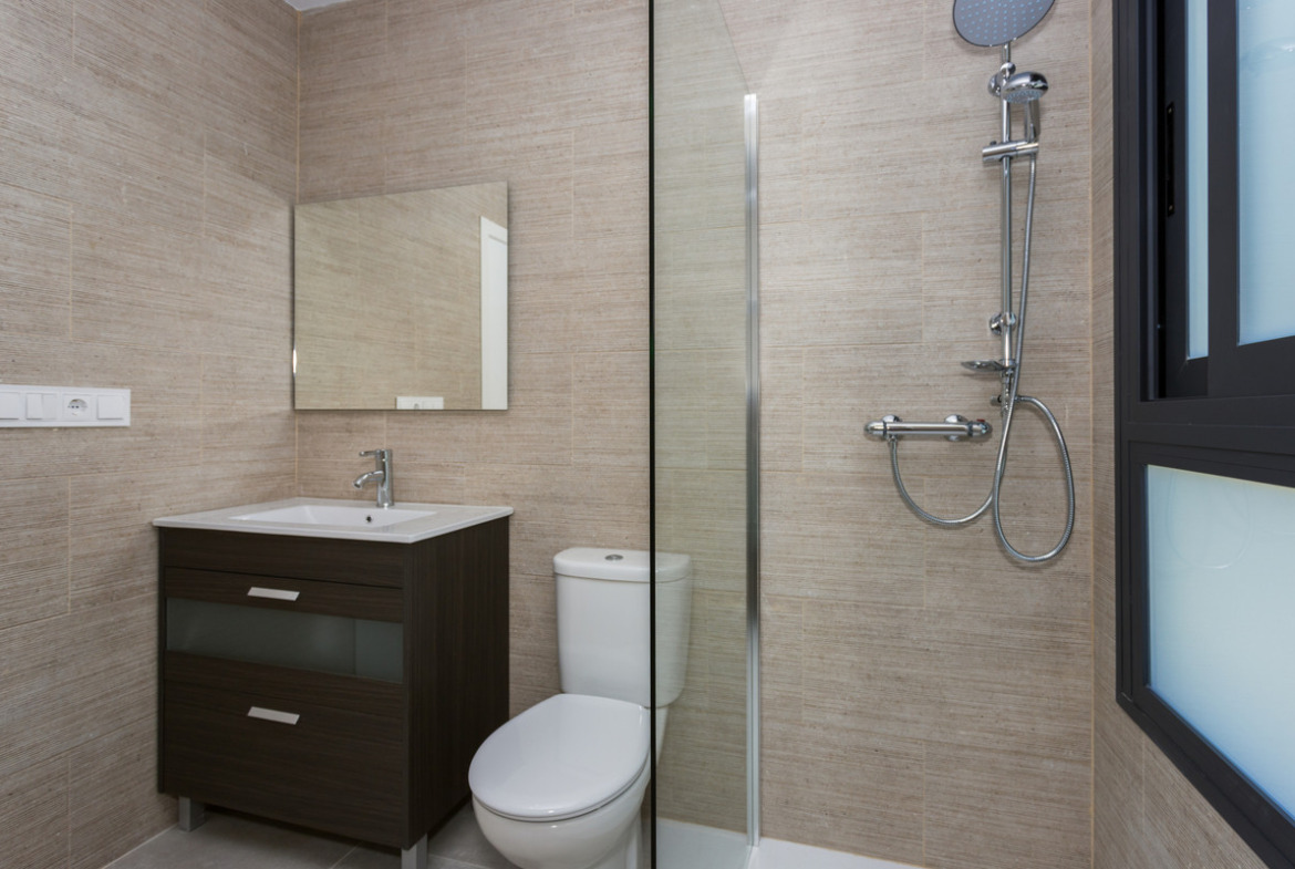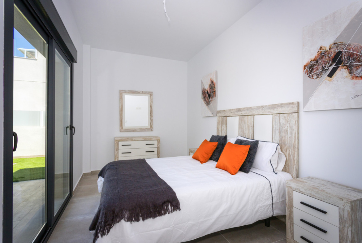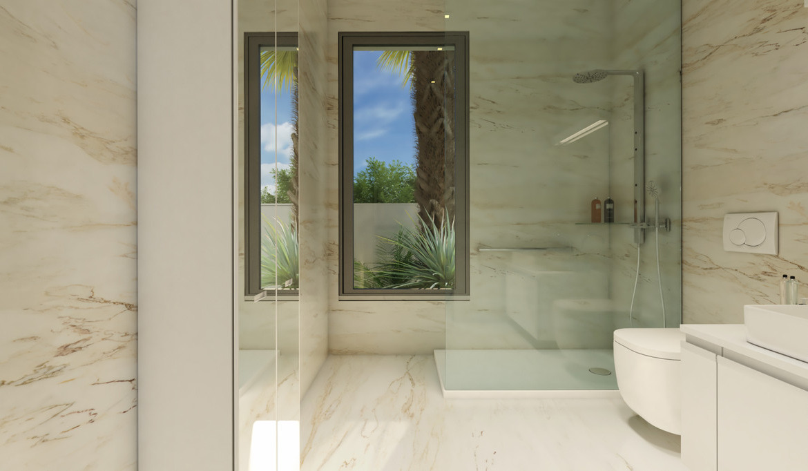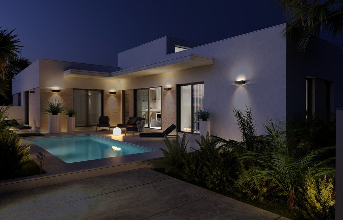 New build villas all on one floor in the new part of Daya Nueva. A few minutes walk to the centre of the town. The property has 3 bedrooms, 2 bathrooms, and a private swimming pool of 18m2. Living / dining area with double height ceiling, open plan kitchen, natural light and option for solarium. The master bedroom has option for a walk in closet and bathrooms en suite.
