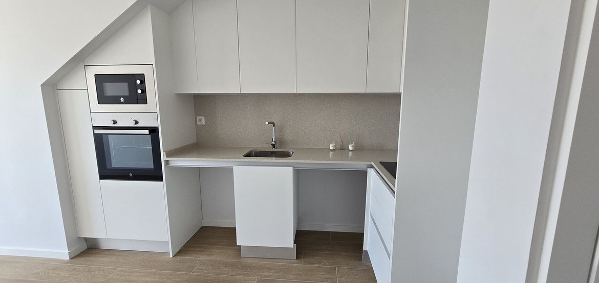 The interior has been carefully finished – there are panels imitating wood on the floors, and the kitchen is equipped with a modern quartz countertop, induction hob, oven, microwave and sink. The bathroom is fully furnished and ready for use, and the bedroom has a large, built-in wardrobe. The apartment has central air conditioning with the possibility of cooling and heating.