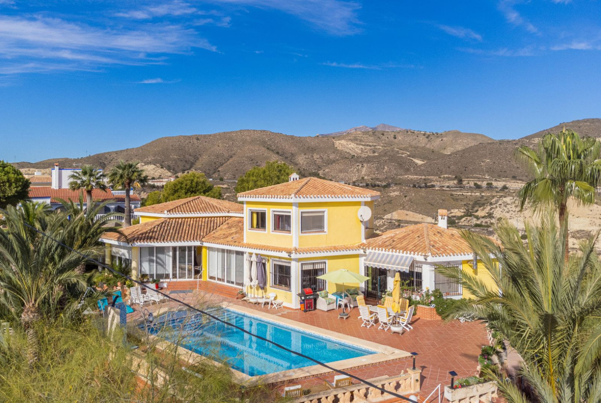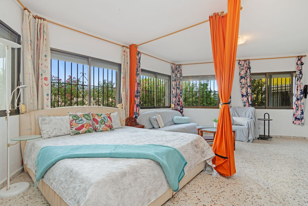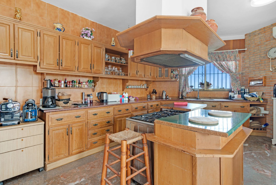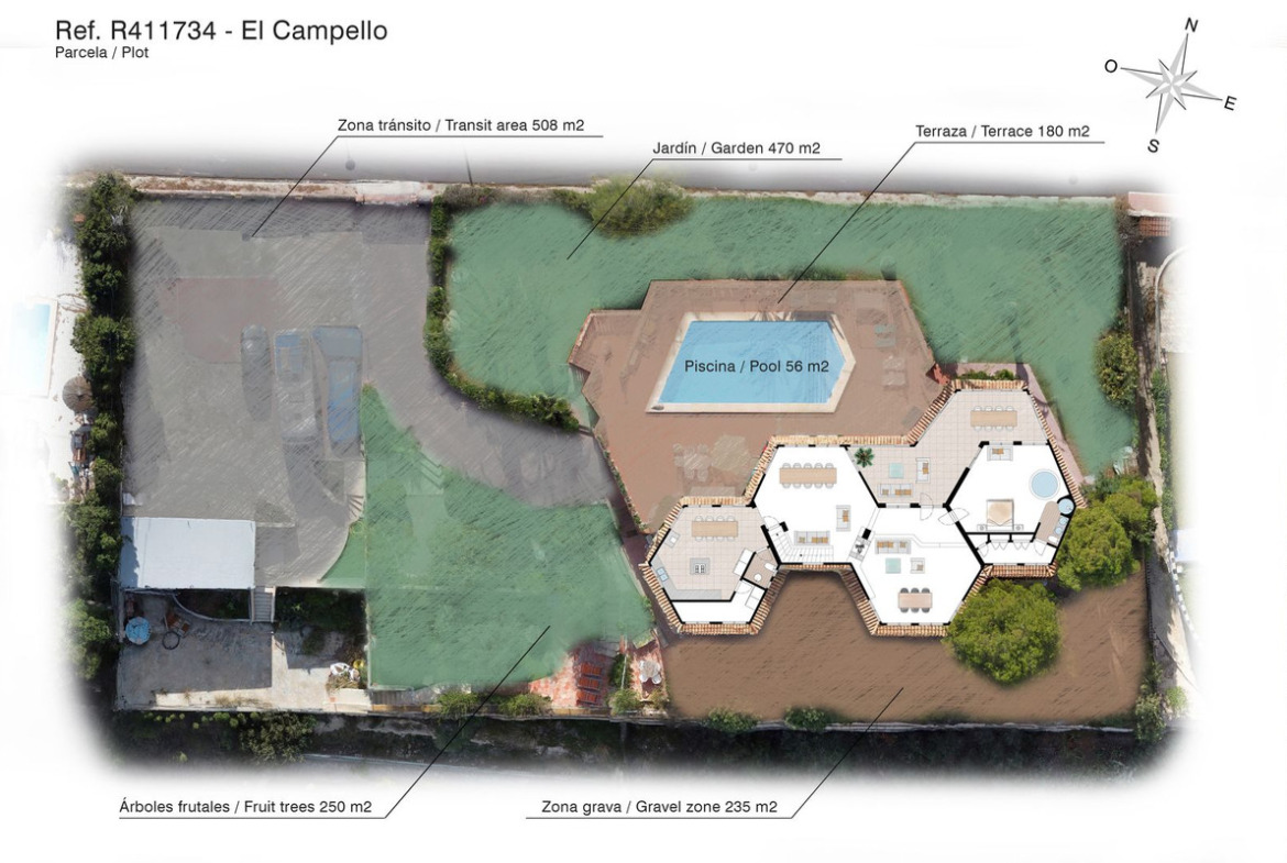Exteriors: Large plot with gardens, terraces and 56m2 swimming pool. Space for a tenis court or further construction posibilites.