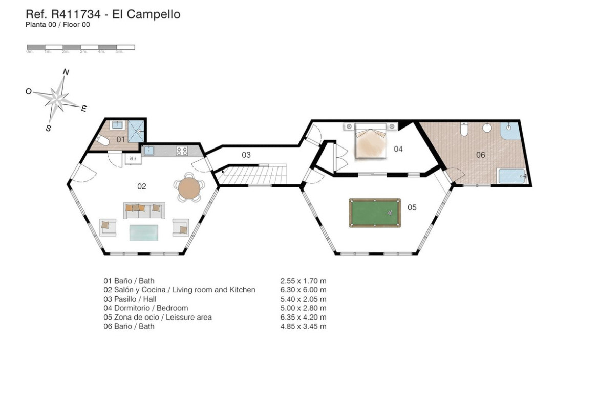 Bottom floor: Open plan lounge-kitchen-dining area, double bedroom, good-sized bedroom and leisure room. 2 bathrooms on this level one with a shower and the other with a bath and shower. Garage and store room.