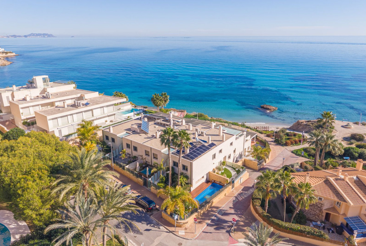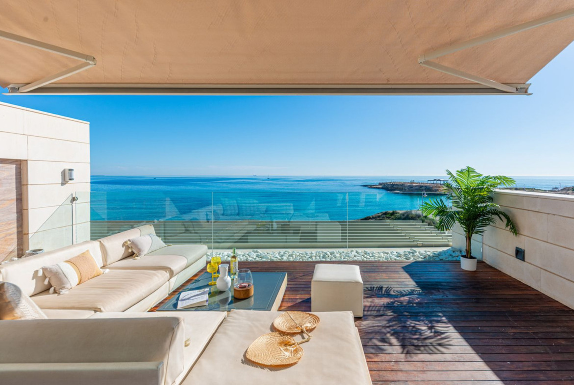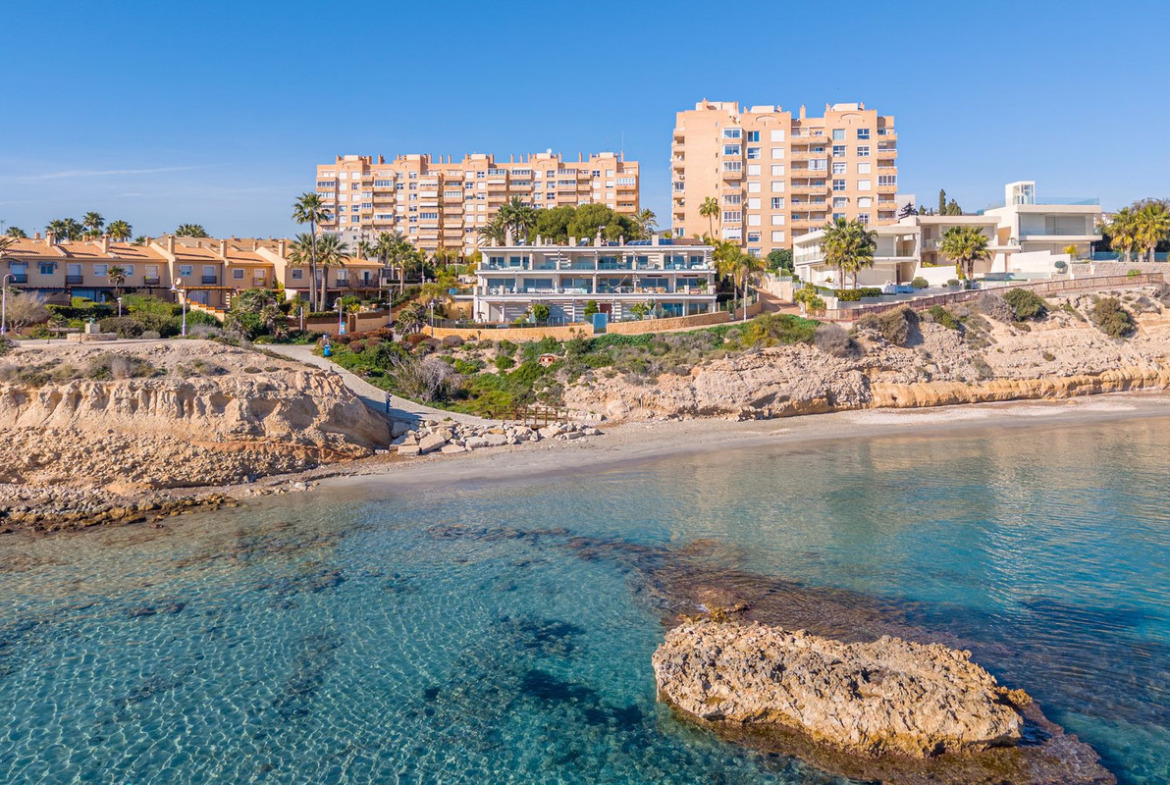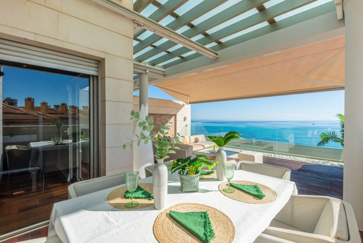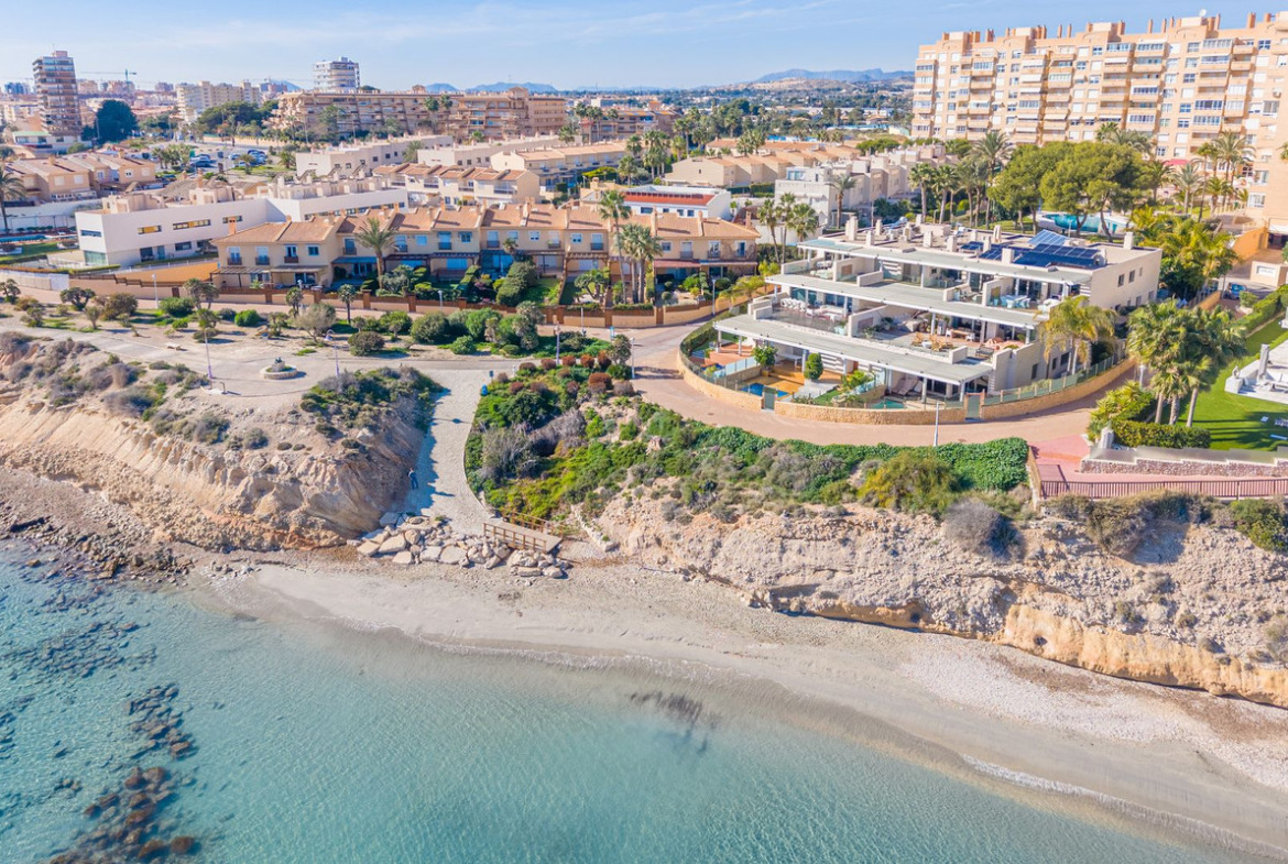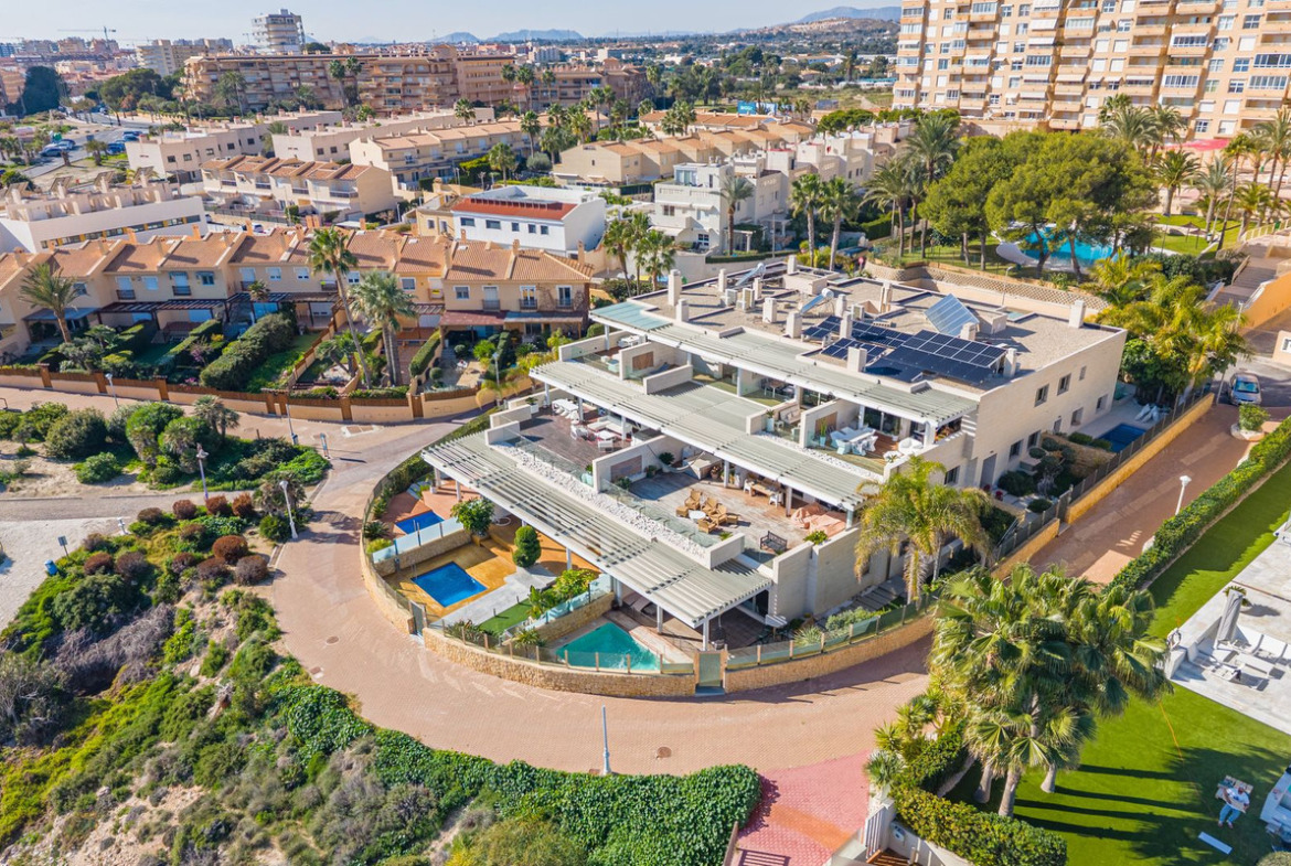 Nestled in one of the most exclusive locations on the Costa Blanca, directly on the beachfront and facing the archaeological site of the Banos de la Reina, next to the marina of El Campello (Alicante), this extraordinary corner duplex penthouse with private pool occupies the top floor of a singular and exclusive building, set within a quiet cul de sac.