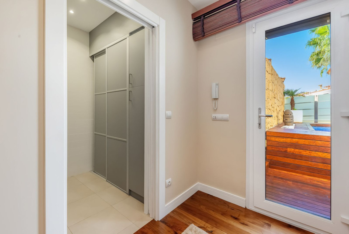 From this level there is direct access to the private outdoor plot, which includes a generously sized swimming pool, landscaped gardens and sun soaked relaxation areas, all perfectly integrated into the surroundings and offering complete privacy. The property also includes a closed double garage integrated within the home.