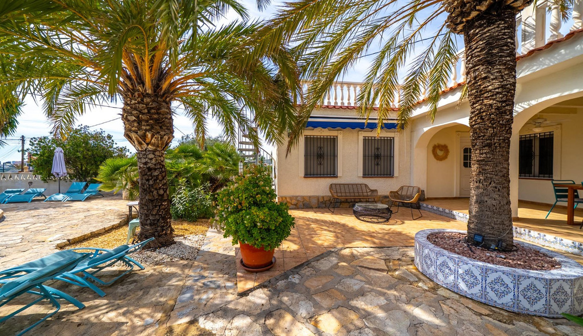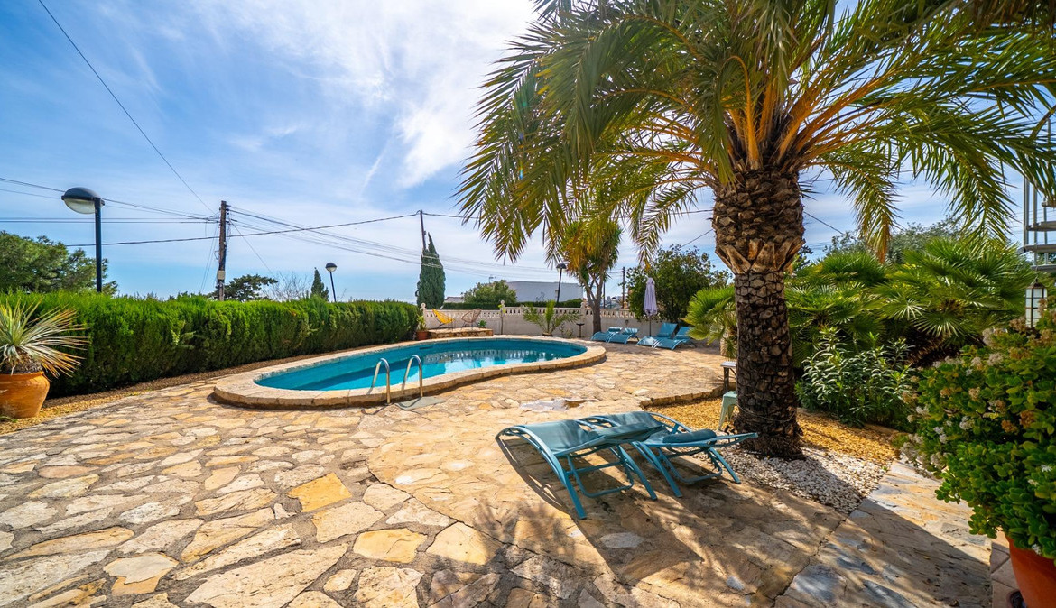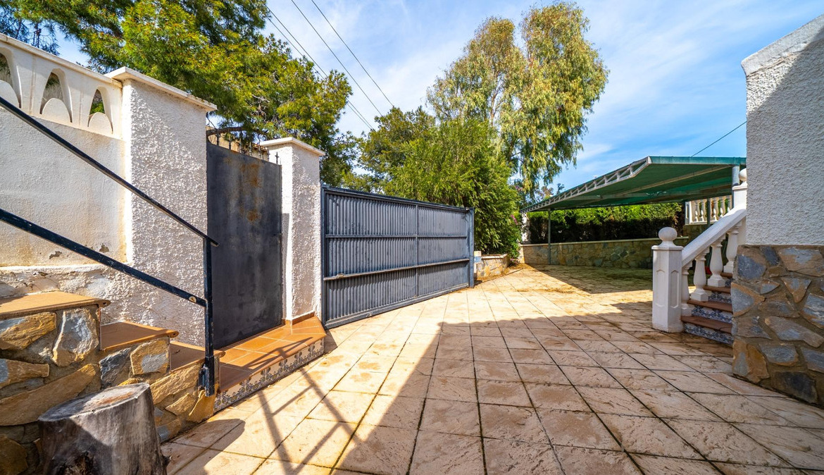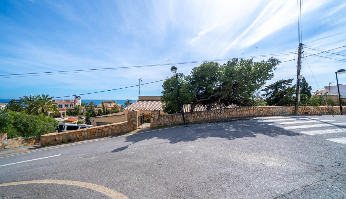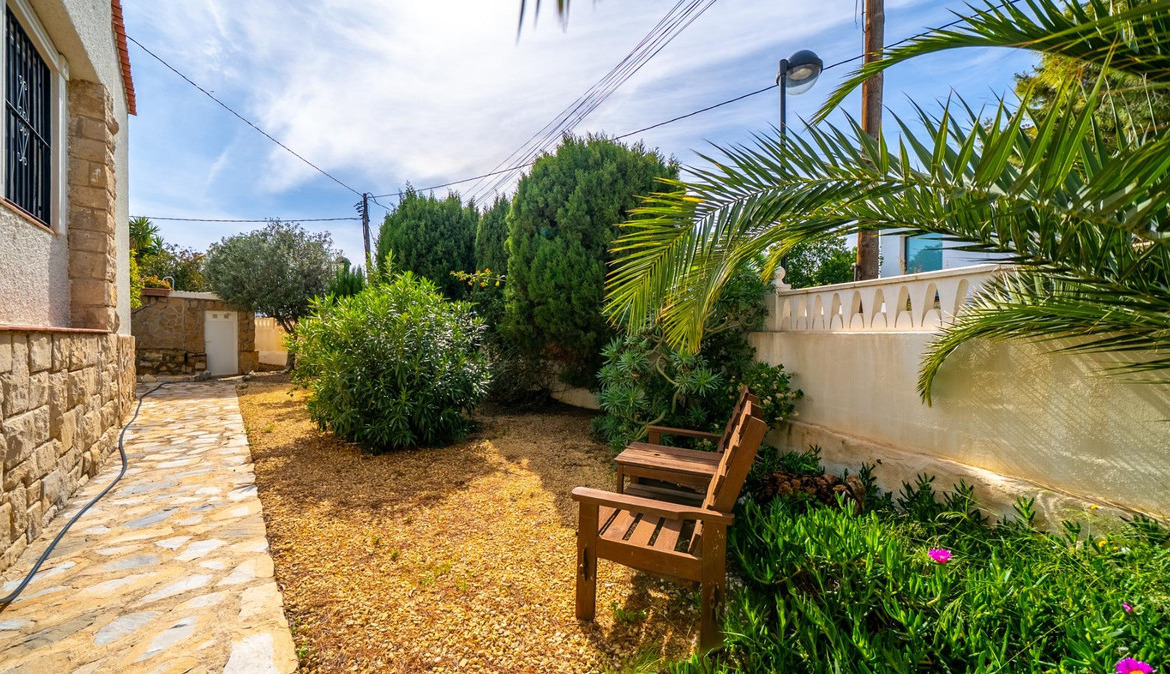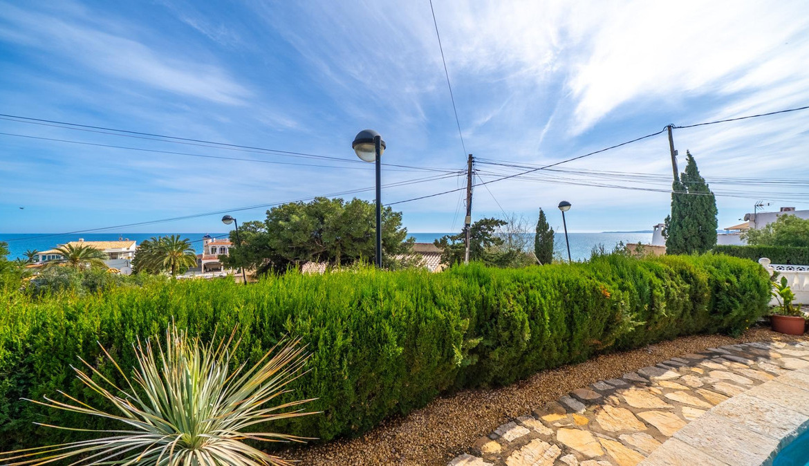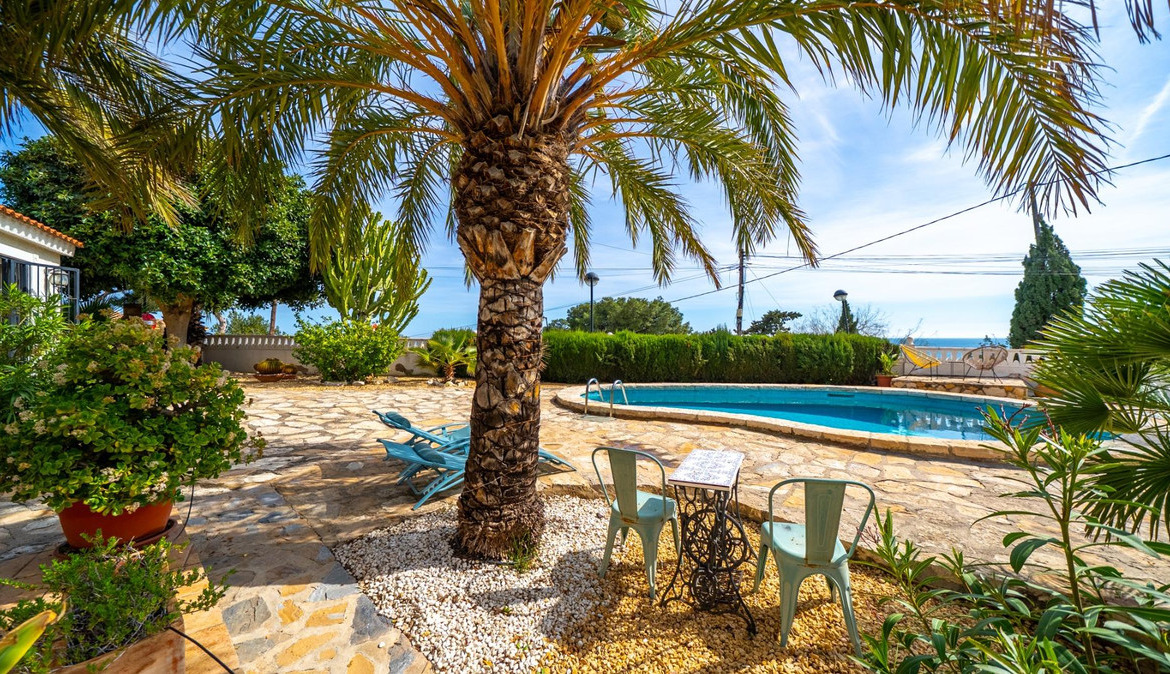 A cozy villa with 3 bedrooms, 3 bathrooms, living-dining room, and fireplace. Three spacious terraces offer stunning sea views on one side and mountain views on the other. A large and well-maintained garden with a wide variety of plants (olive trees, lemon trees, and numerous palm trees) includes a barbecue area, private pool, and outdoor shower with hot water. It also features a covered garage for one car and covered parking spaces for two. It has automatic gates and a laundry room. The house has been completely renovated.