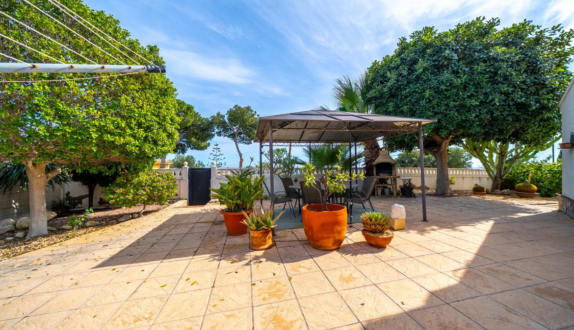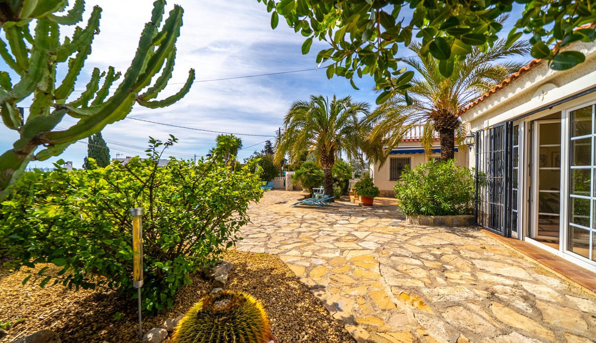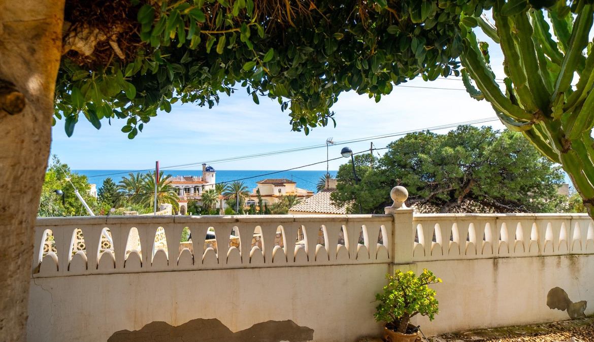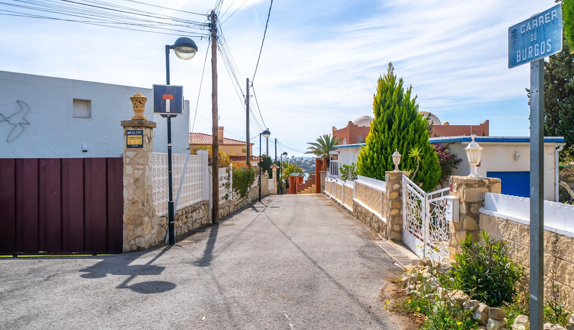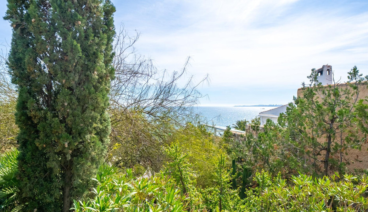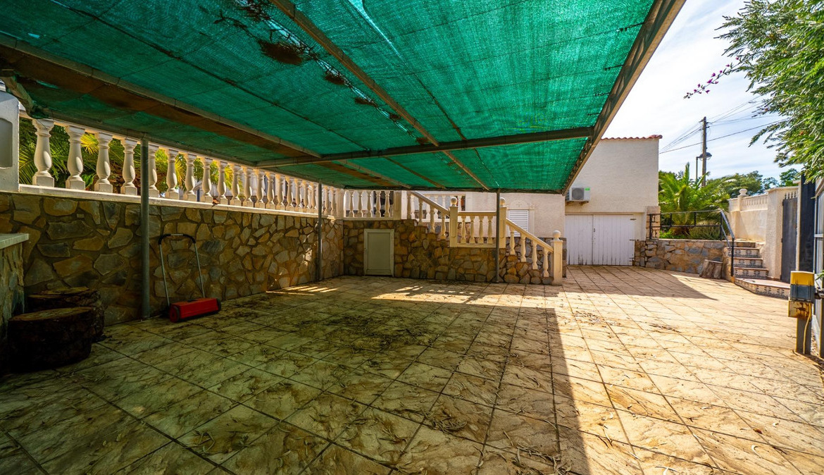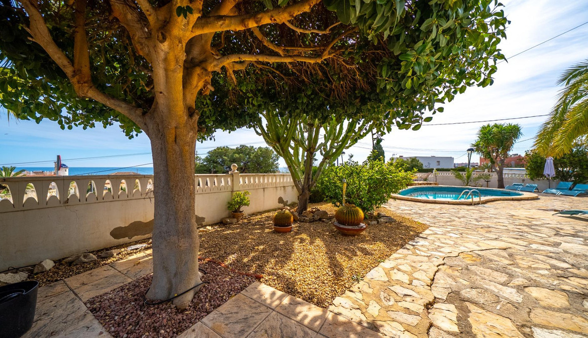 A cozy villa with 3 bedrooms, 3 bathrooms, living-dining room, and fireplace. Three spacious terraces offer stunning sea views on one side and mountain views on the other. A large and well-maintained garden with a wide variety of plants (olive trees, lemon trees, and numerous palm trees) includes a barbecue area, private pool, and outdoor shower with hot water. It also features a covered garage for one car and covered parking spaces for two. It has automatic gates and a laundry room. The house has been completely renovated.