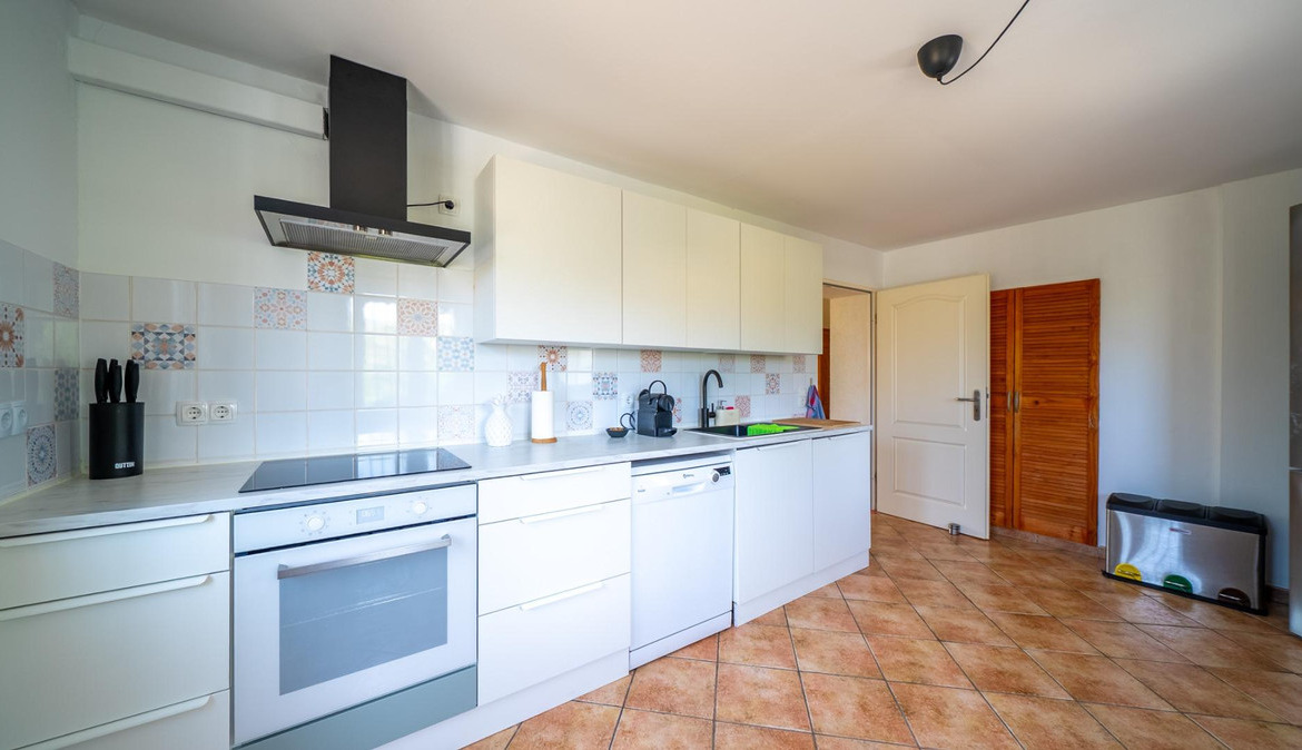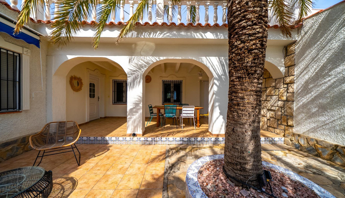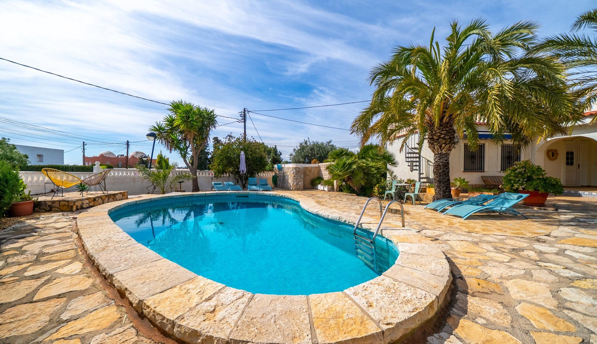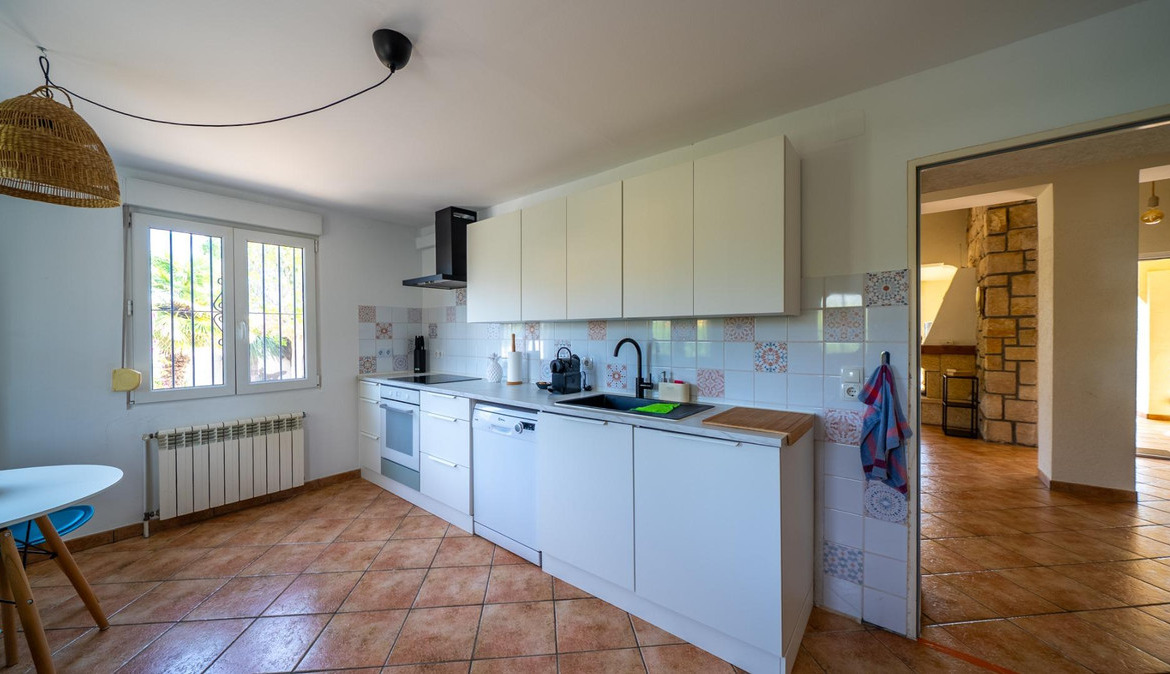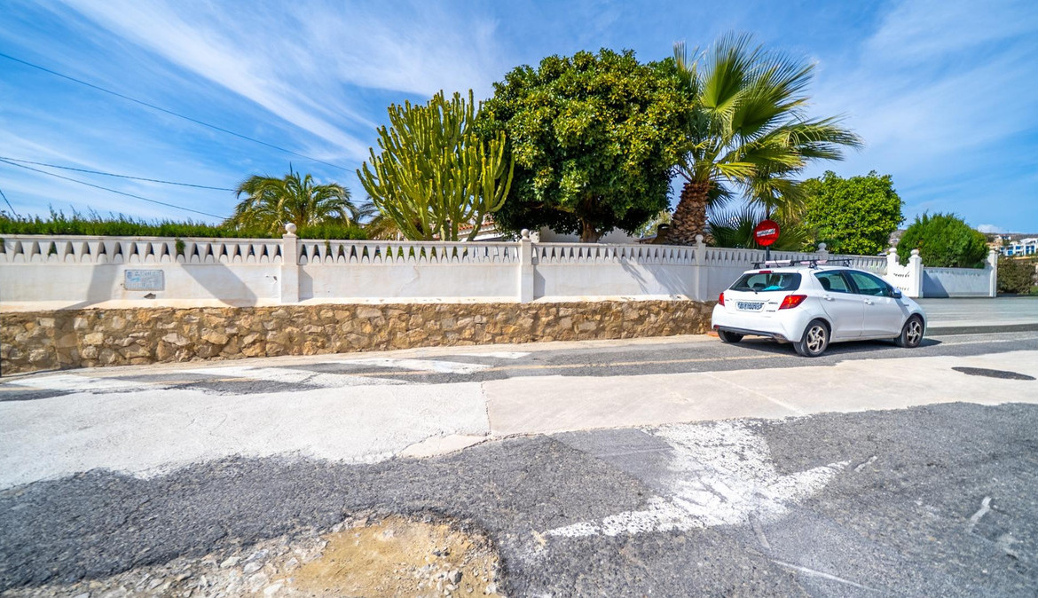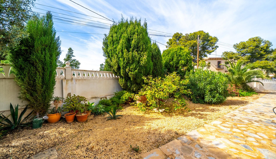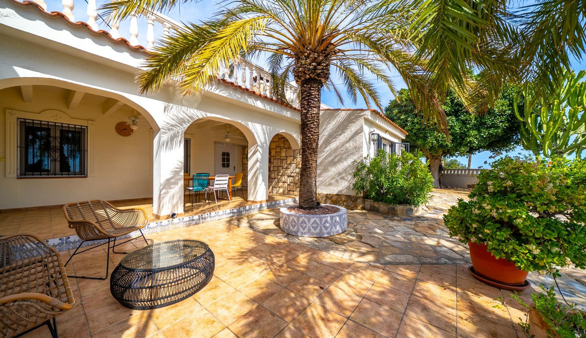 A cozy villa with 3 bedrooms, 3 bathrooms, living-dining room, and fireplace. Three spacious terraces offer stunning sea views on one side and mountain views on the other. A large and well-maintained garden with a wide variety of plants (olive trees, lemon trees, and numerous palm trees) includes a barbecue area, private pool, and outdoor shower with hot water. It also features a covered garage for one car and covered parking spaces for two. It has automatic gates and a laundry room. The house has been completely renovated.