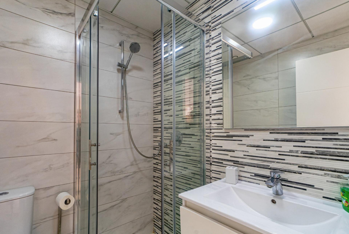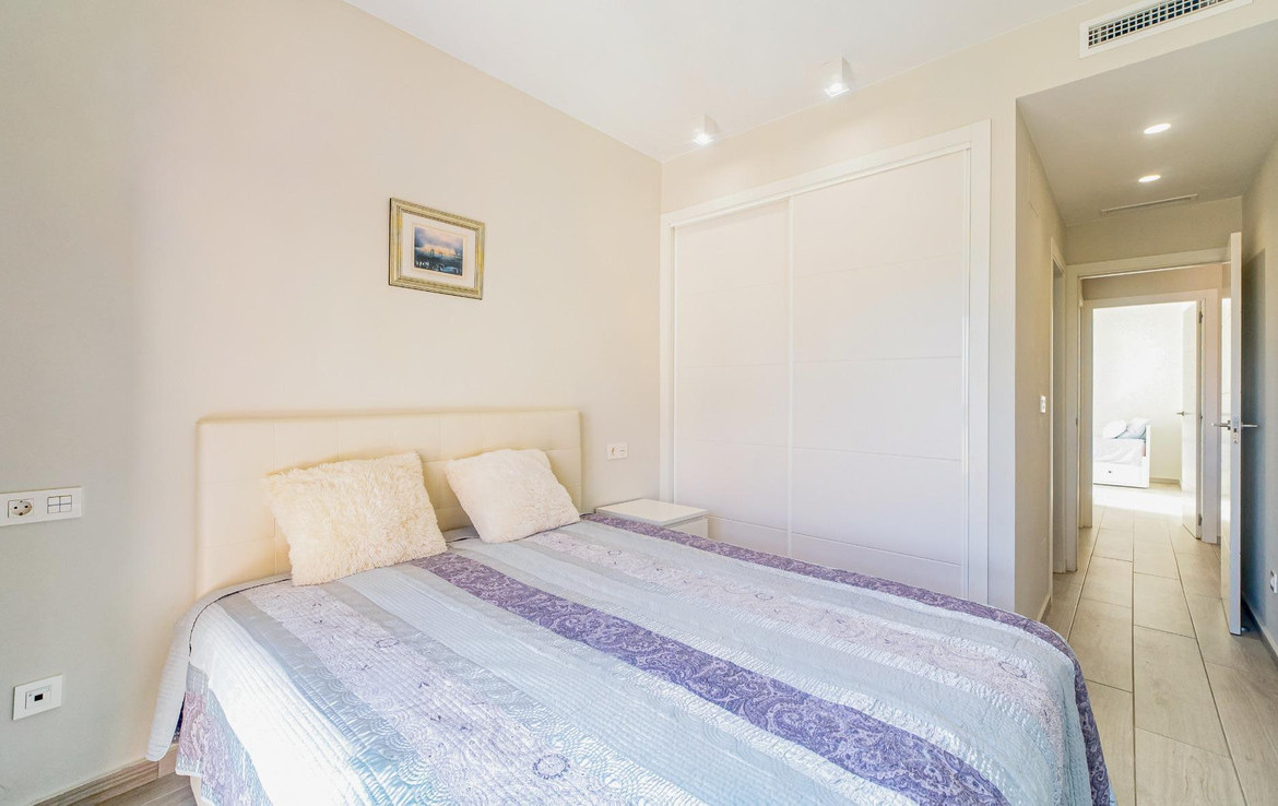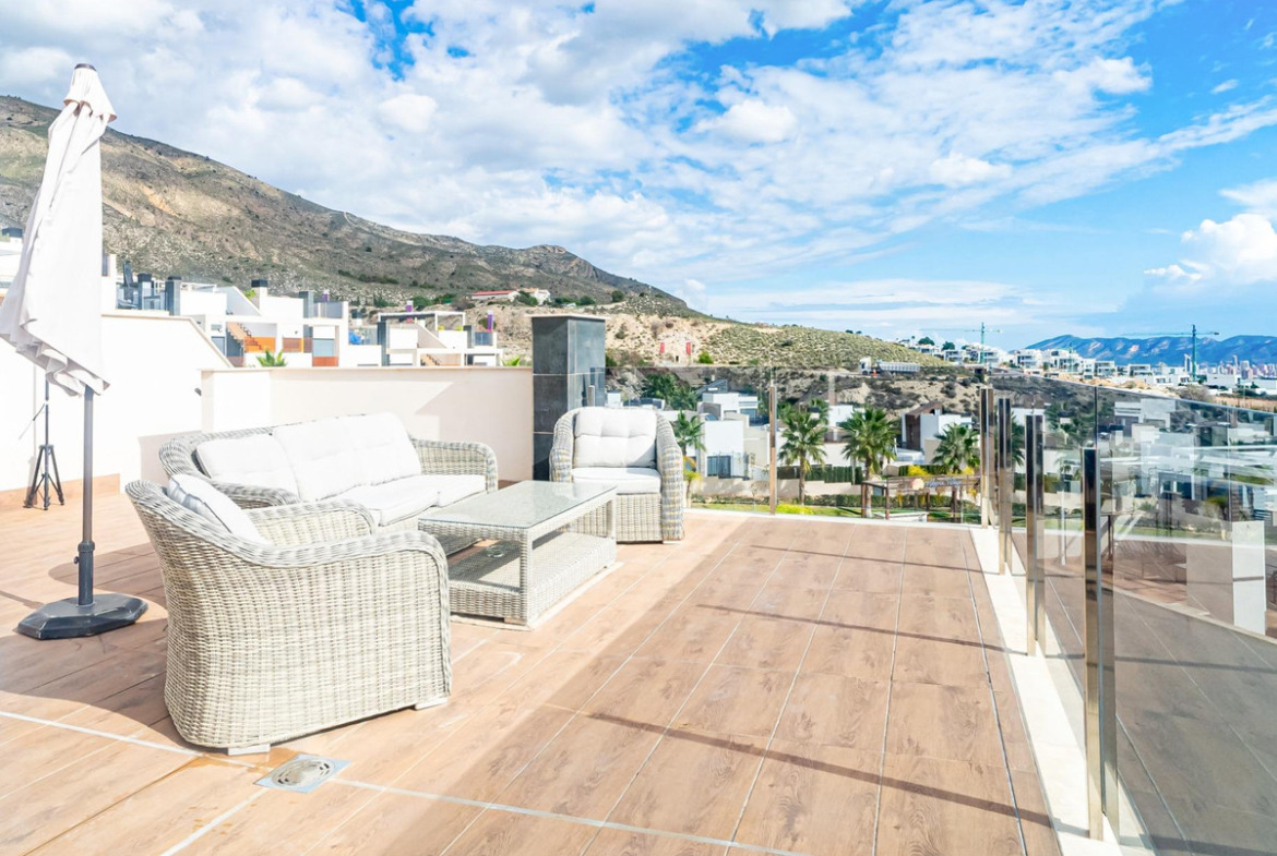 This corner penthouse is located in the new area of Finestrat. The apartment has plenty of natural light and is in very good condition. It features 3 bedrooms, one of which has a small balcony, two bathrooms with underfloor heating, (one of them is an en-suite bathroom), open-plan kitchen, and living room with access to a balcony with a storage room and to a 90 m² solarium. The terrace enjoys sunlight all day, has electricity and water supply, a storage room for the washing machine, and impressive mountain and sea views. The water is heated by solar panels, and the apartment has air conditioning for both cooling and heating. A parking space is included in the price, located in front of the building.