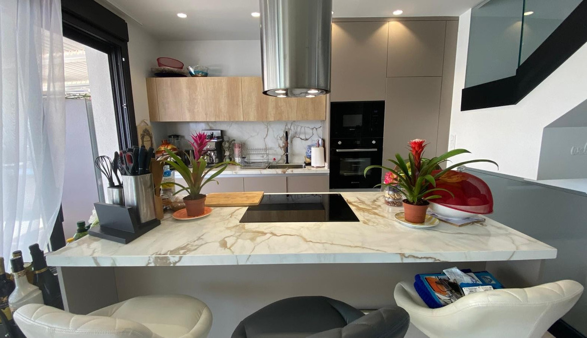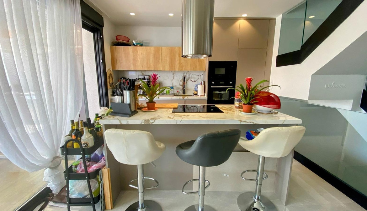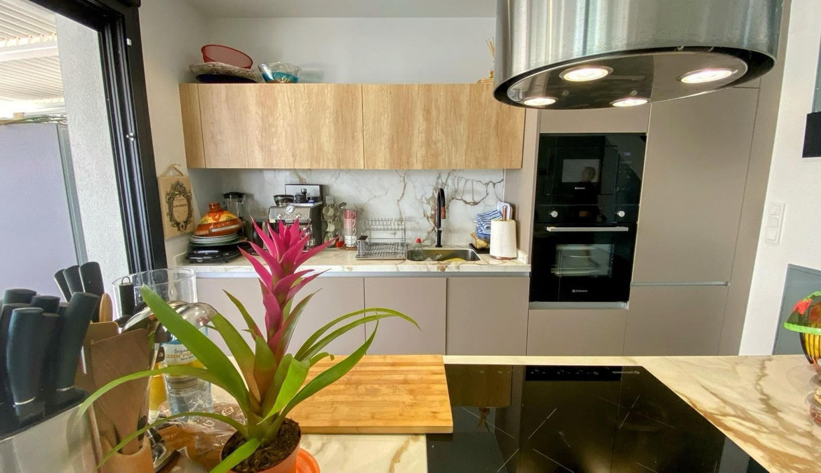 The cutting-edge kitchen, fully equipped with top-of-the-line appliances, opens onto a spacious open-concept living room. This bright and welcoming area is surrounded by large windows offering spectacular views of the Mediterranean Sea and mountains.