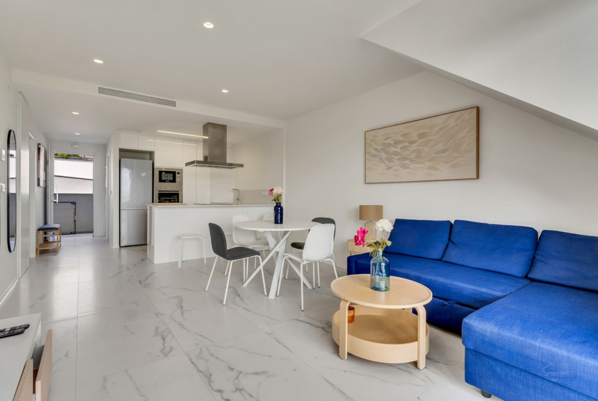 Designed for elegance and functionality, this duplex features: A bright living and dining area with seamless access to a semi-covered terrace, ideal for al fresco dining and relaxing. A fully equipped open-plan kitchen with a compact quartz island, perfect for entertaining. A luxurious main bedroom with sea views, terrace access, an en-suite bathroom, and a walk-in dressing room. A second bedroom at the rear, with a nearby bathroom for added convenience. A utility cupboard equipped with a washer and dryer for practical living. The property includes a private 68 sqm solarium, offering a tranquil space to enjoy stunning sea views and the natural beauty of the Costa Blanca.