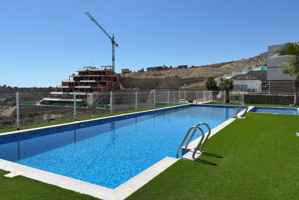 Strategically located, the property is a short distance from Puig Campana Golf course and just 10 minutes by car from La Marina Shopping Centre, which hosts supermarkets, boutiques, bars, and restaurants. The golden beaches of Benidorm are also a mere 10-minute drive away, while nearby towns like Villajoyosa, Altea, and Calpe add to the region's charm. This sought-after resort features lush green areas, an inviting swimming pool, and private outdoor parking for each residence, ensuring comfort and convenience.