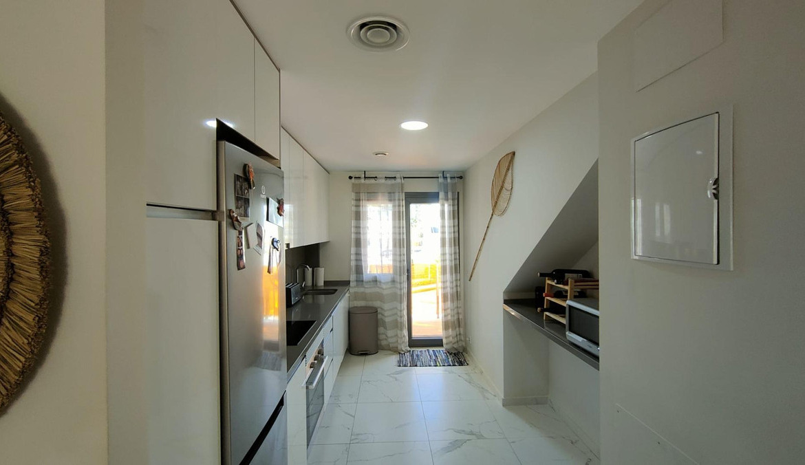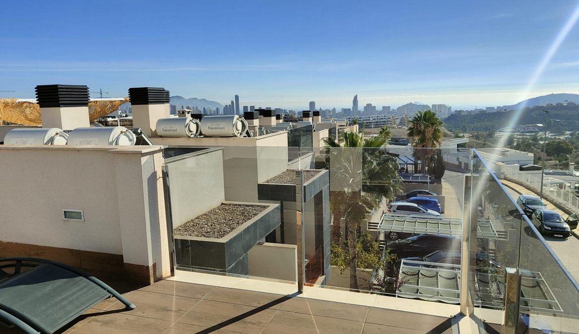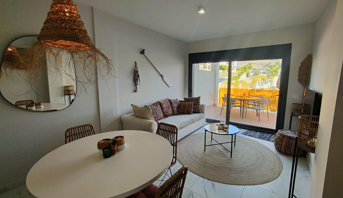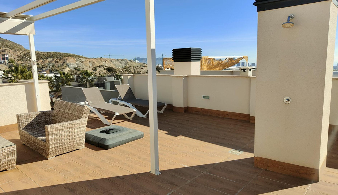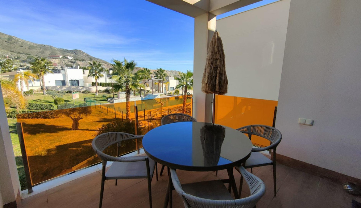 ✨ Upper floor bungalow with solarium and sea views in Alegría Village Resort – Finestrat ✨We present this beautiful upper floor bungalow, located in the exclusive Alegría Village Resort, one of the most complete and well-kept residential areas in Finestrat, with fantastic sea views and an environment designed to enjoy well-being and the Mediterranean lifestyle.The property has 2 bedrooms and 2 bathrooms, offering comfort and functionality. It has a large private solarium, ideal for relaxing, with a built-in barbecue, seating area, and open views. It comes fully equipped, including furniture and appliances, as well as solar panels for hot water, underfloor heating in the bathrooms, and electric blinds.The resort's communal areas are exceptional and designed for the whole family:???? Oriental garden with palm trees and fruit trees???? 25 x 12 m infinity pool???? 8 x 8 m Jacuzzi???? Pool bar???? Finnish sauna????️ Gym???? Children's playground and poolAll this in a privileged location, close to all amenities, with quick access to the motorway to Alicante, close to the Puig Campana golf course and just a few minutes from the beaches.✨ An ideal property for living, enjoying holidays or investing in one of the best areas of the Costa Blanca.