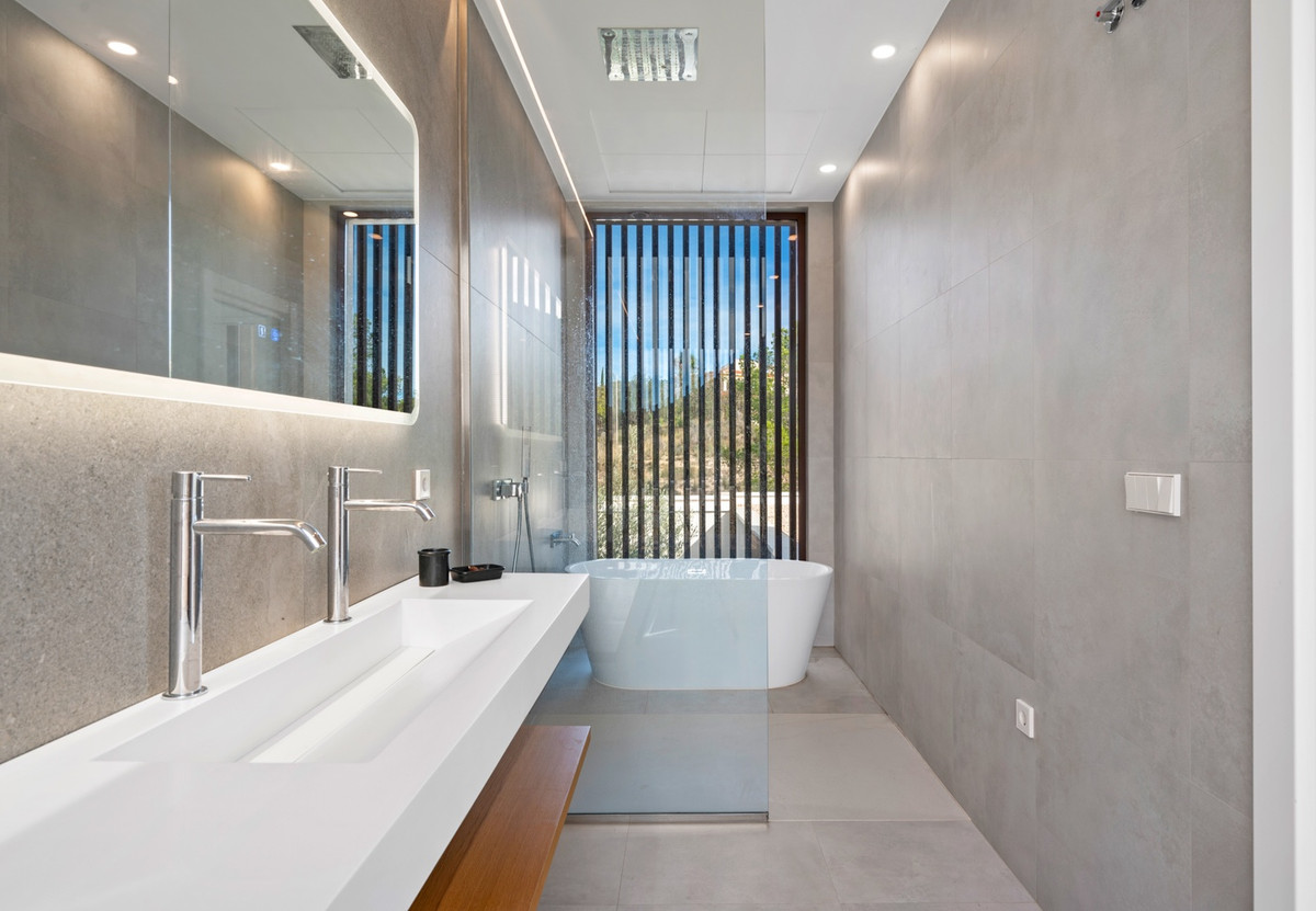 From here, you access the hallway that leads to the most private area of the house: the main suite. A room where calm and silence rule. A huge window to count stars at night and welcome sunrise in the morning. A spacious walk-in closet and en-suite bathroom with a designer bathtub to wash the day away… or a long shower while gazing at the majestic Puig Campana.