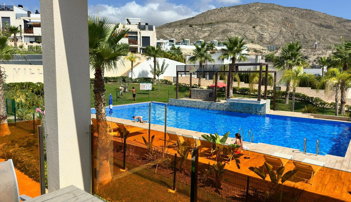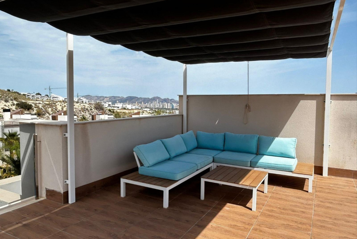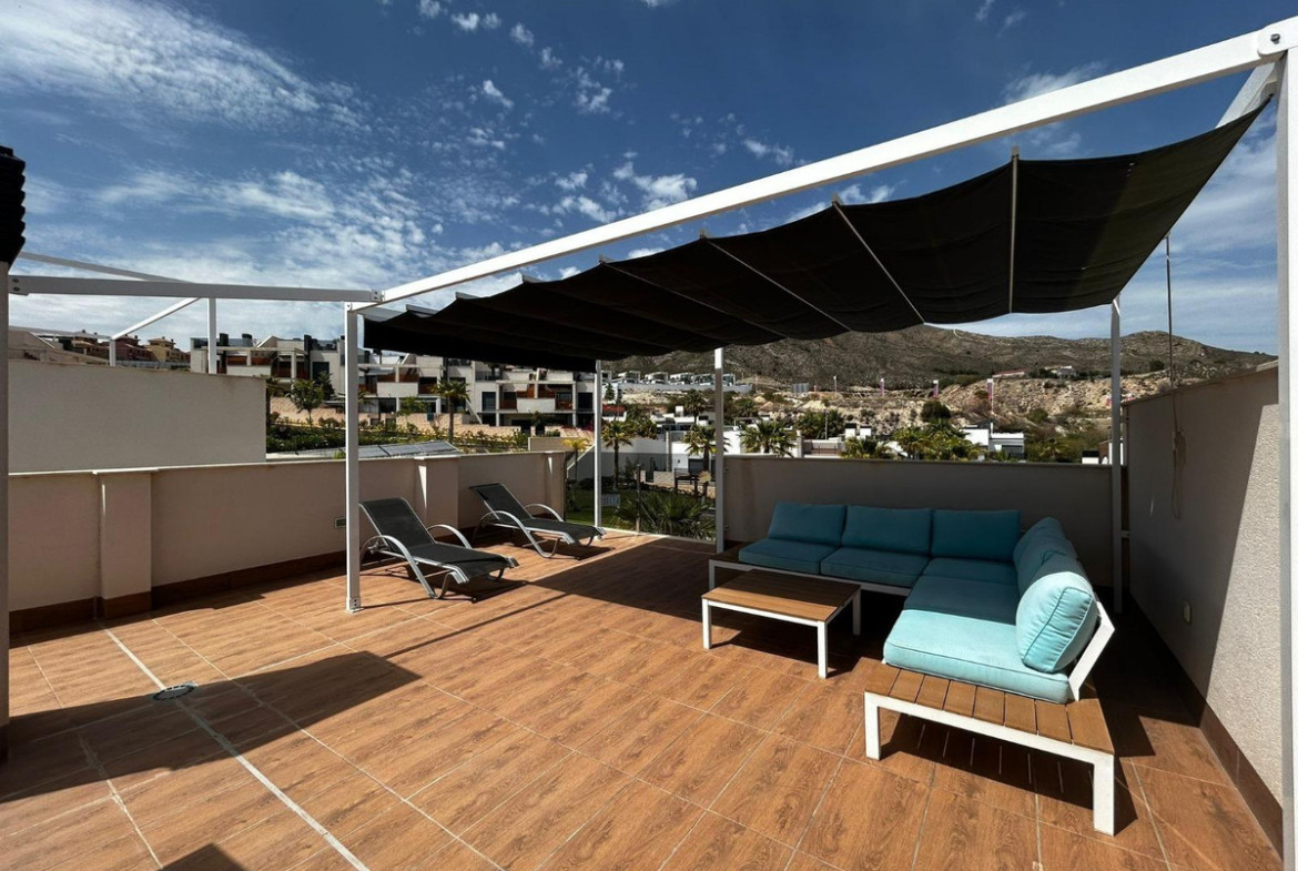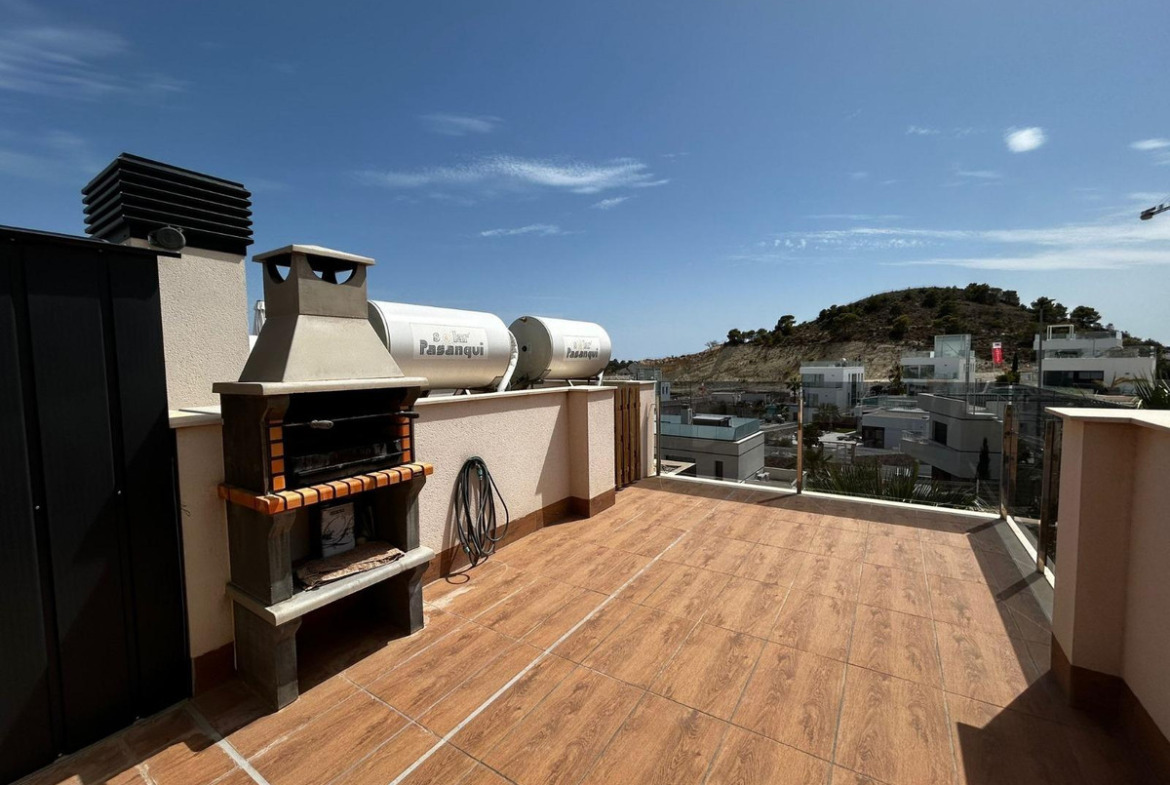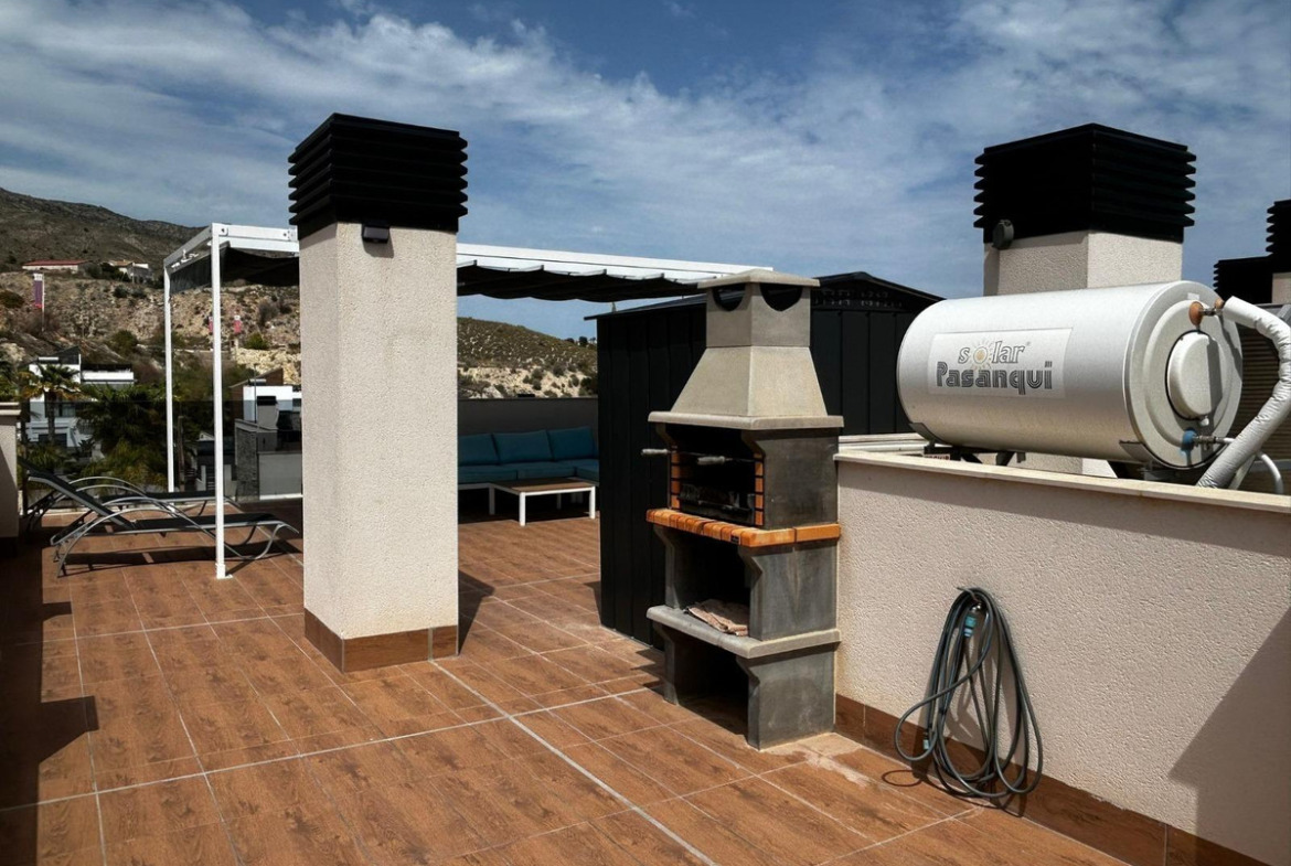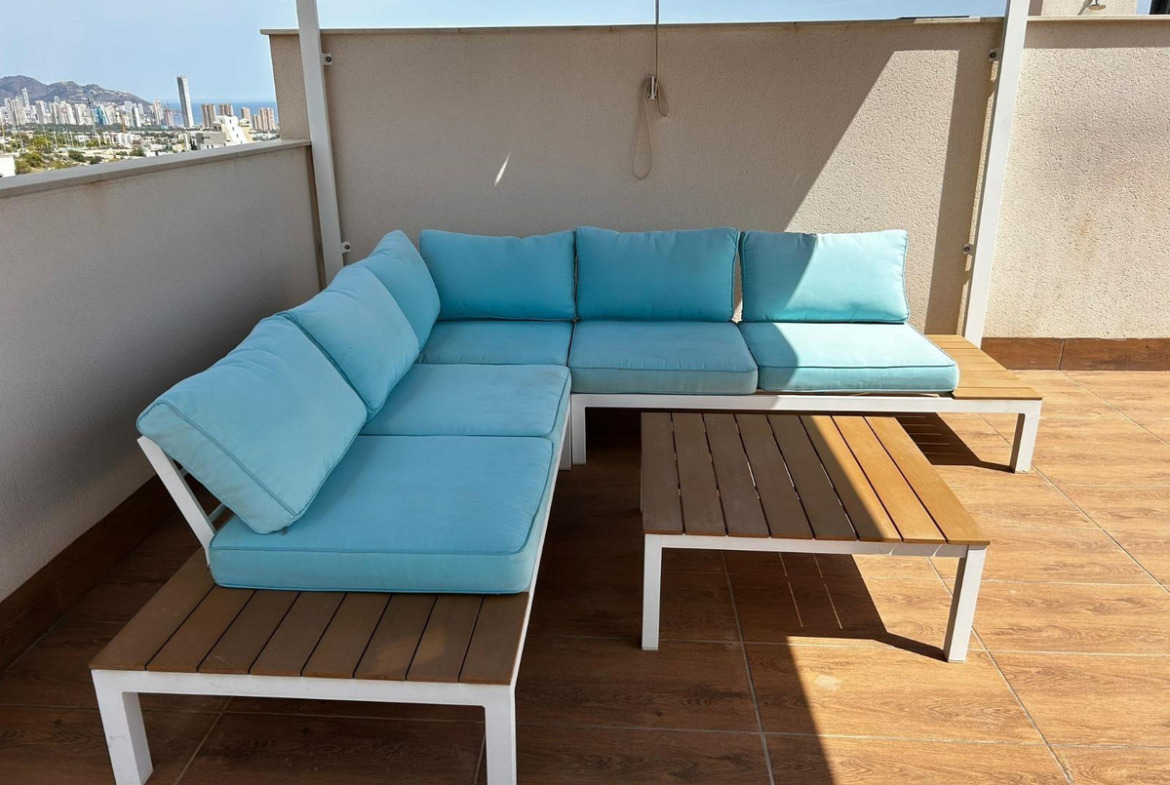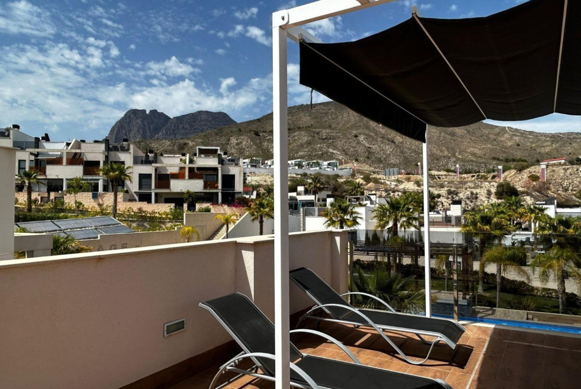 Apartment for sale in the Balcón de Finestrat area, located in the modern residential complex Alegria Village.One of the main advantages of the property is the private roof terrace, equipped with a canopy, relaxation area, and its own jacuzzi. Here **a recreational space with a barbecue area has been arranged**, from which beautiful views of Finestrat and Benidorm can be enjoyed.The apartment is situated in a well-maintained urbanization with common infrastructure: swimming pool, gym, sauna, and green areas for the residents' relaxation. The price also includes a parking space.The area combines a peaceful atmosphere with convenient proximity to all the necessary infrastructure. The Centro Comercial La Marina shopping center is just 5 minutes away by car, and the nearest beaches of Benidorm can be reached in about 7 minutes by car. Nearby are green areas, walking paths, and playgrounds.