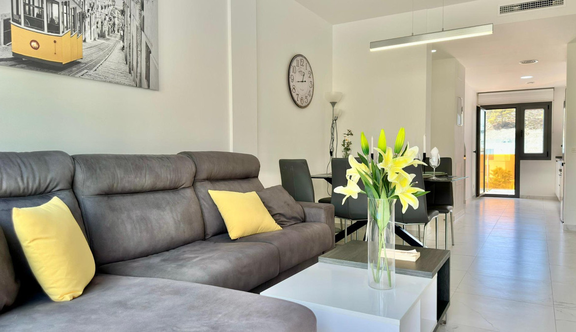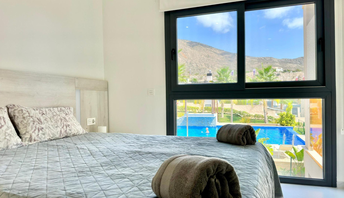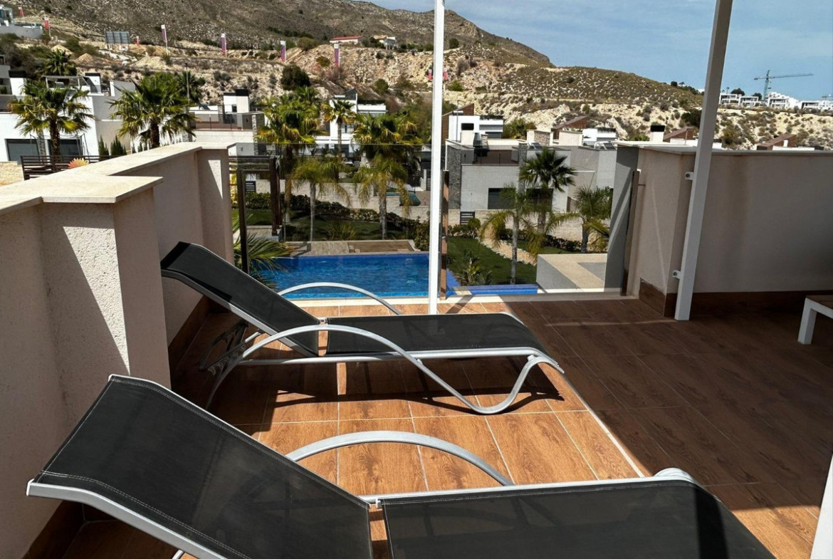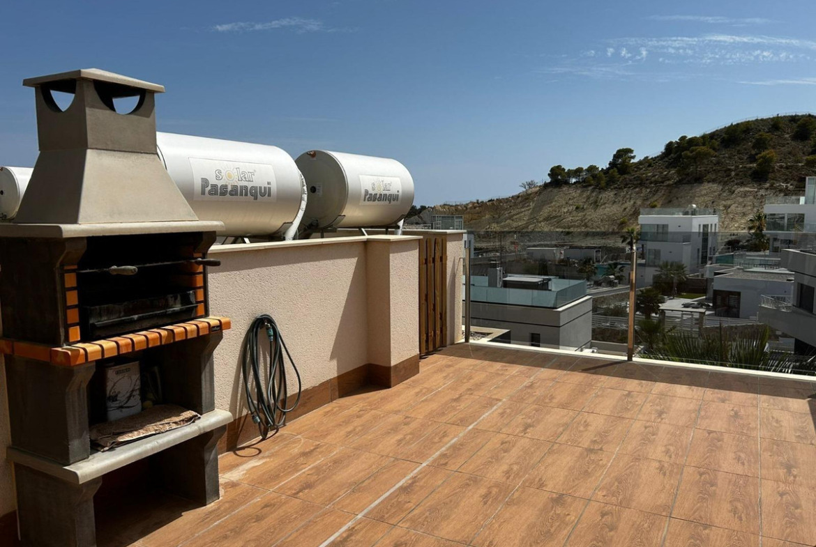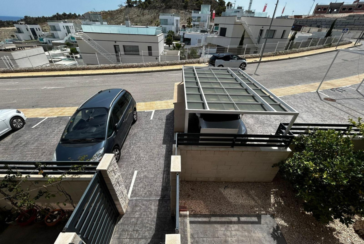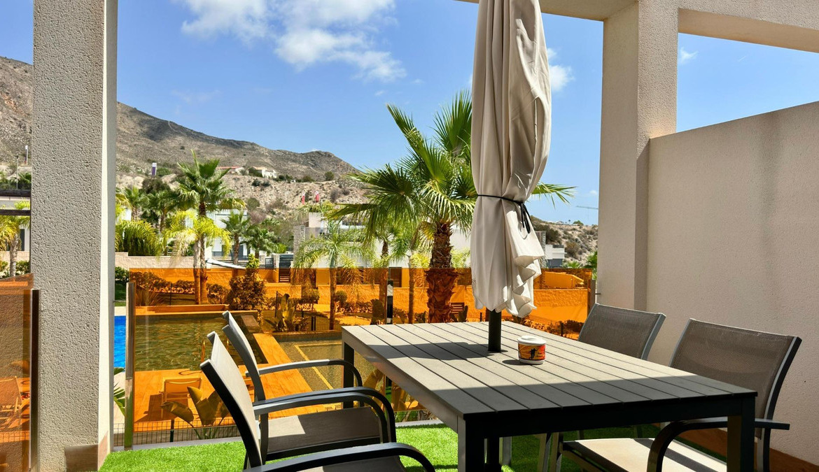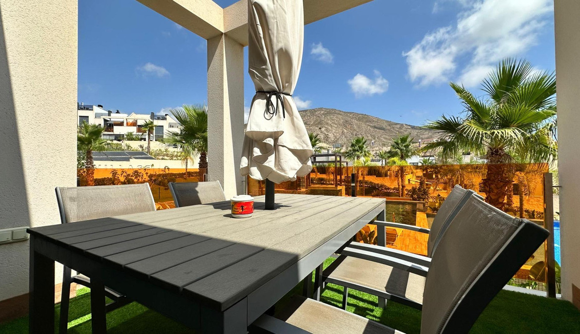 Apartment for sale in the Balcón de Finestrat area, located in the modern residential complex Alegria Village.One of the main advantages of the property is the private roof terrace, equipped with a canopy, relaxation area, and its own jacuzzi. Here **a recreational space with a barbecue area has been arranged**, from which beautiful views of Finestrat and Benidorm can be enjoyed.The apartment is situated in a well-maintained urbanization with common infrastructure: swimming pool, gym, sauna, and green areas for the residents' relaxation. The price also includes a parking space.The area combines a peaceful atmosphere with convenient proximity to all the necessary infrastructure. The Centro Comercial La Marina shopping center is just 5 minutes away by car, and the nearest beaches of Benidorm can be reached in about 7 minutes by car. Nearby are green areas, walking paths, and playgrounds.