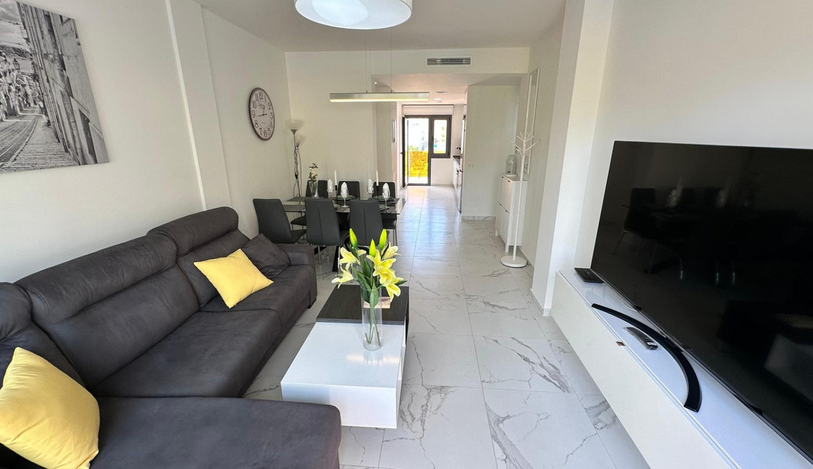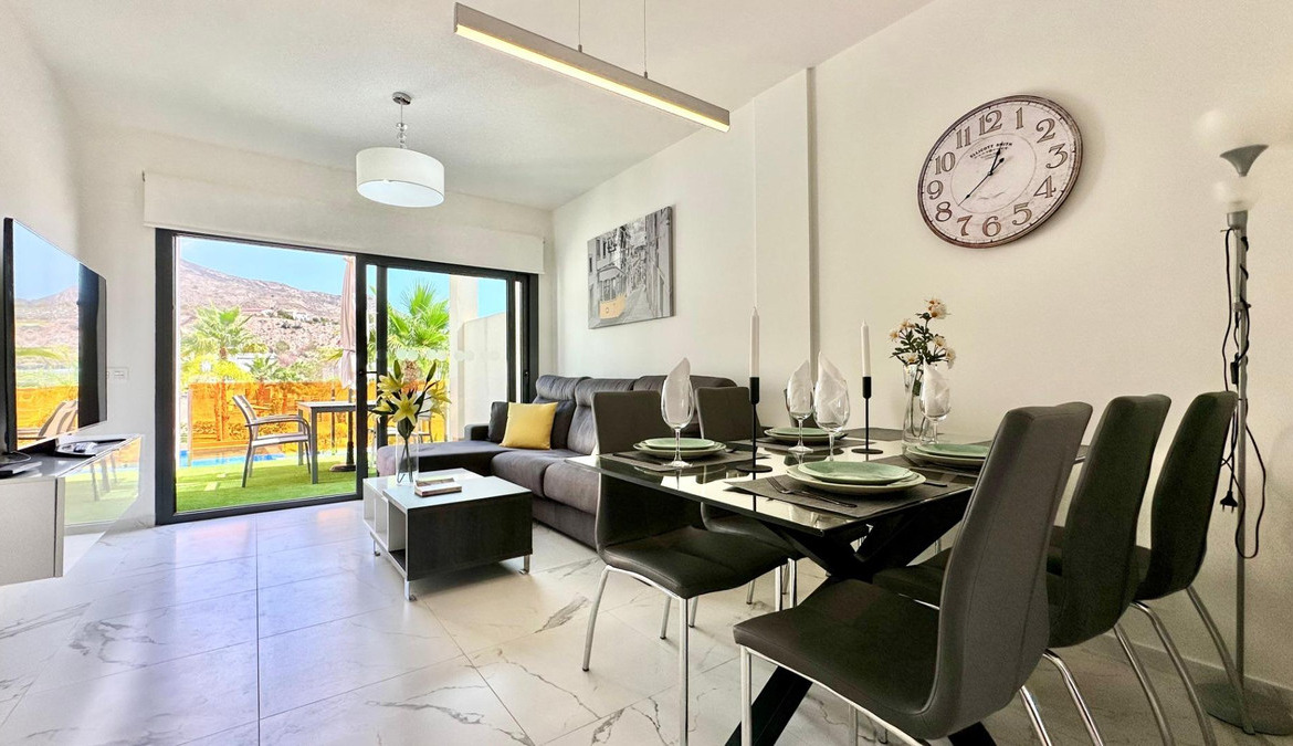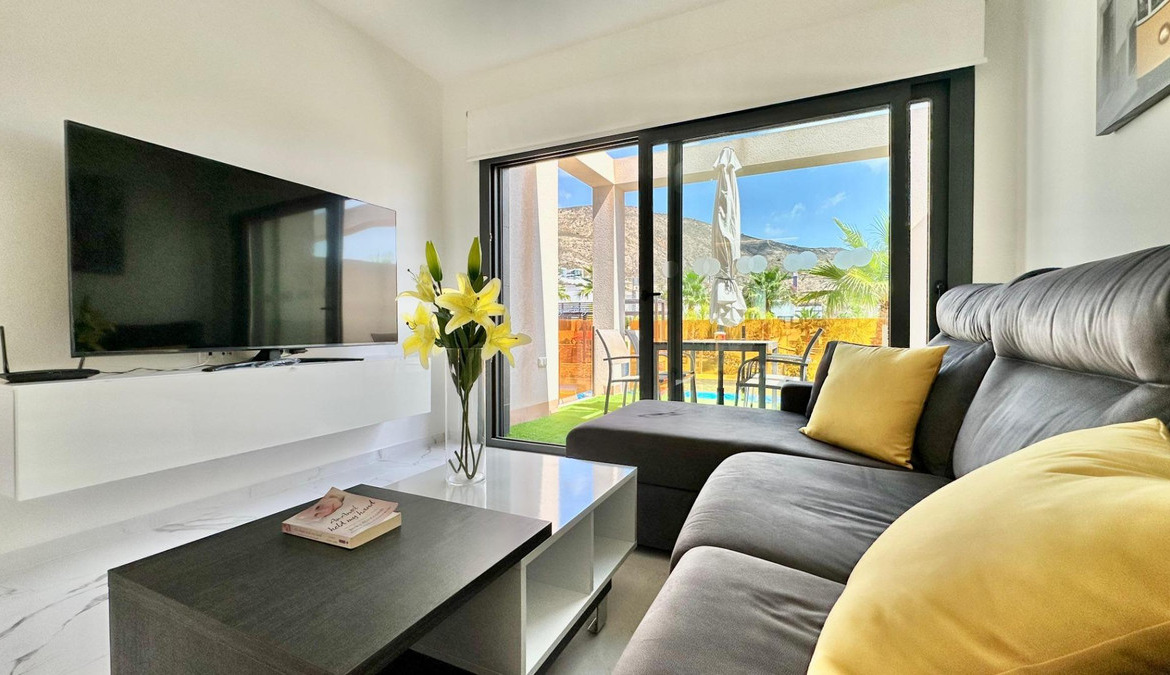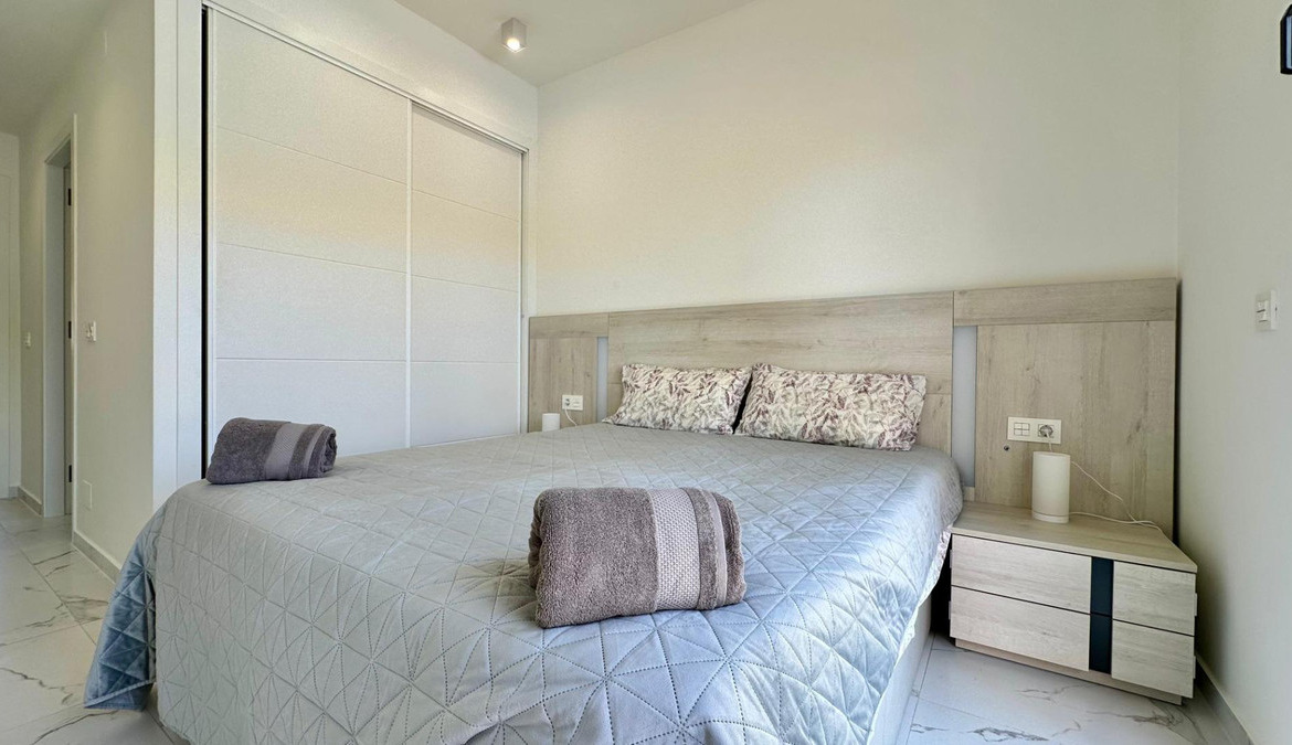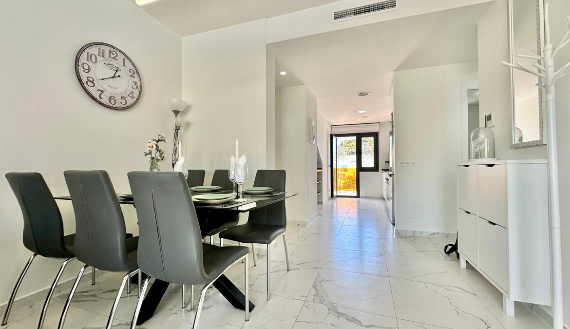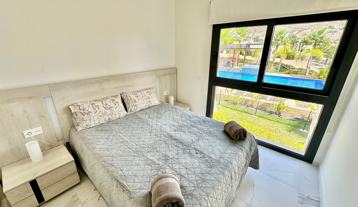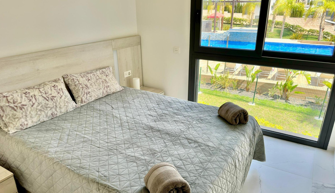 Apartment for sale in the Balcón de Finestrat area, located in the modern residential complex Alegria Village.One of the main advantages of the property is the private roof terrace, equipped with a canopy, relaxation area, and its own jacuzzi. Here **a recreational space with a barbecue area has been arranged**, from which beautiful views of Finestrat and Benidorm can be enjoyed.The apartment is situated in a well-maintained urbanization with common infrastructure: swimming pool, gym, sauna, and green areas for the residents' relaxation. The price also includes a parking space.The area combines a peaceful atmosphere with convenient proximity to all the necessary infrastructure. The Centro Comercial La Marina shopping center is just 5 minutes away by car, and the nearest beaches of Benidorm can be reached in about 7 minutes by car. Nearby are green areas, walking paths, and playgrounds.