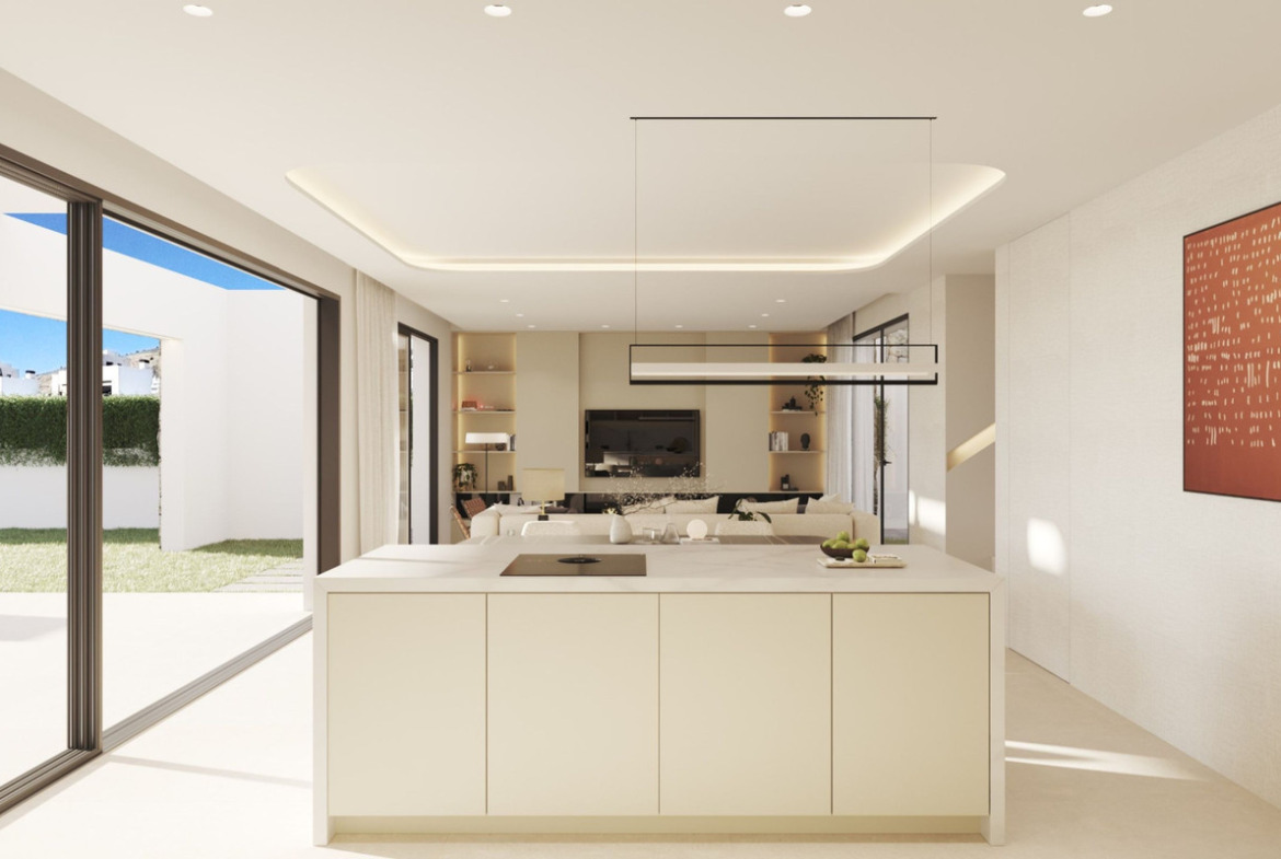 The homes include a fully equipped kitchen with Siemens appliances (induction hob, oven, microwave, dishwasher, and washing machine), a high-efficiency aerothermal system, interior and exterior LED lighting, and high-quality finishes that reflect the modern and elegant character of the residential development.