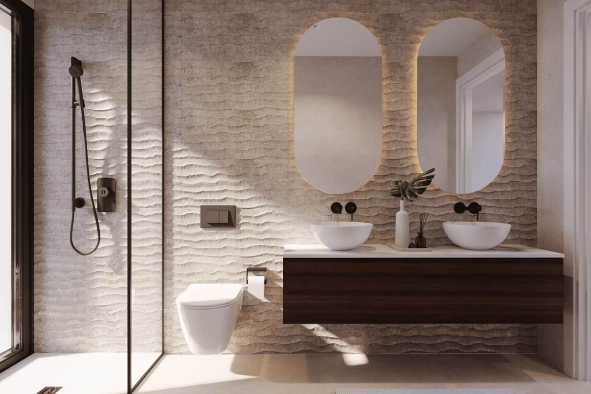 All villas feature 3 bedrooms, 3 bathrooms, and a spacious open-plan living-dining-kitchen area that integrates with the terrace and private pool. Villas 1 and 2 enjoy an east-facing orientation and a larger outdoor social area, ideal for gatherings. Villas 3 and 4 include an infinity pool with west-facing orientation and open mountain views, creating unique sunsets even from the living room.