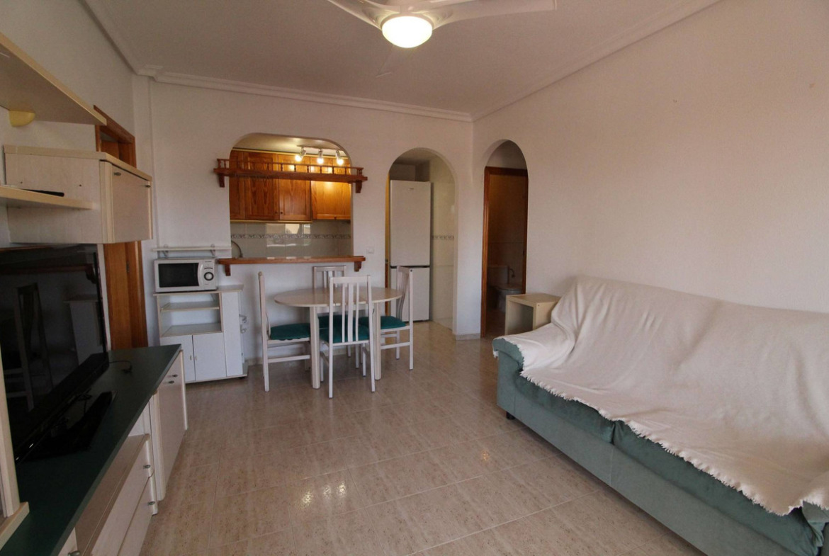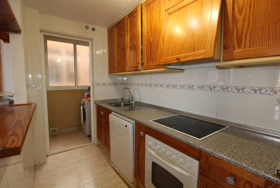 This first floor flat is located in a gated community with a very nice swimming pool surrounded by trees and plants. It has 2 bedrooms and one full bathroom. The main bedroom has double bed, built in wardrobe, TV; the second bedroom has 2 single beds and a built in closet. The kitchen is fully equipped with fridge/freezer, oven, hob, dishwasher, coffee machine, there is a small laundry room in the back of the kitchen where the washing machine and the boiler are. The lounge/dinning room are has a sofa that can sit 3 people, a dining table for 4 and it has access to a very nice balcony, perfect to sit outside to have coffee or tea.