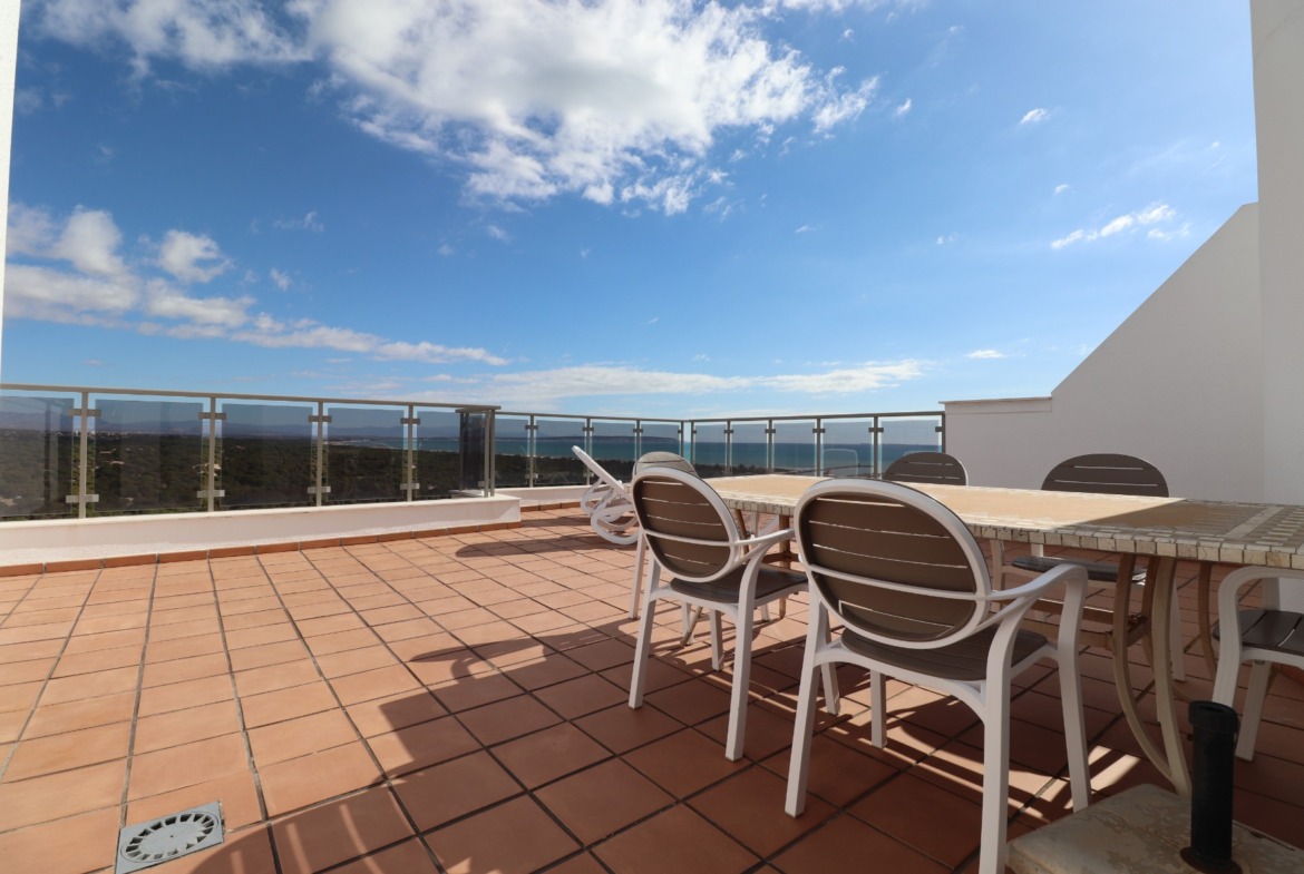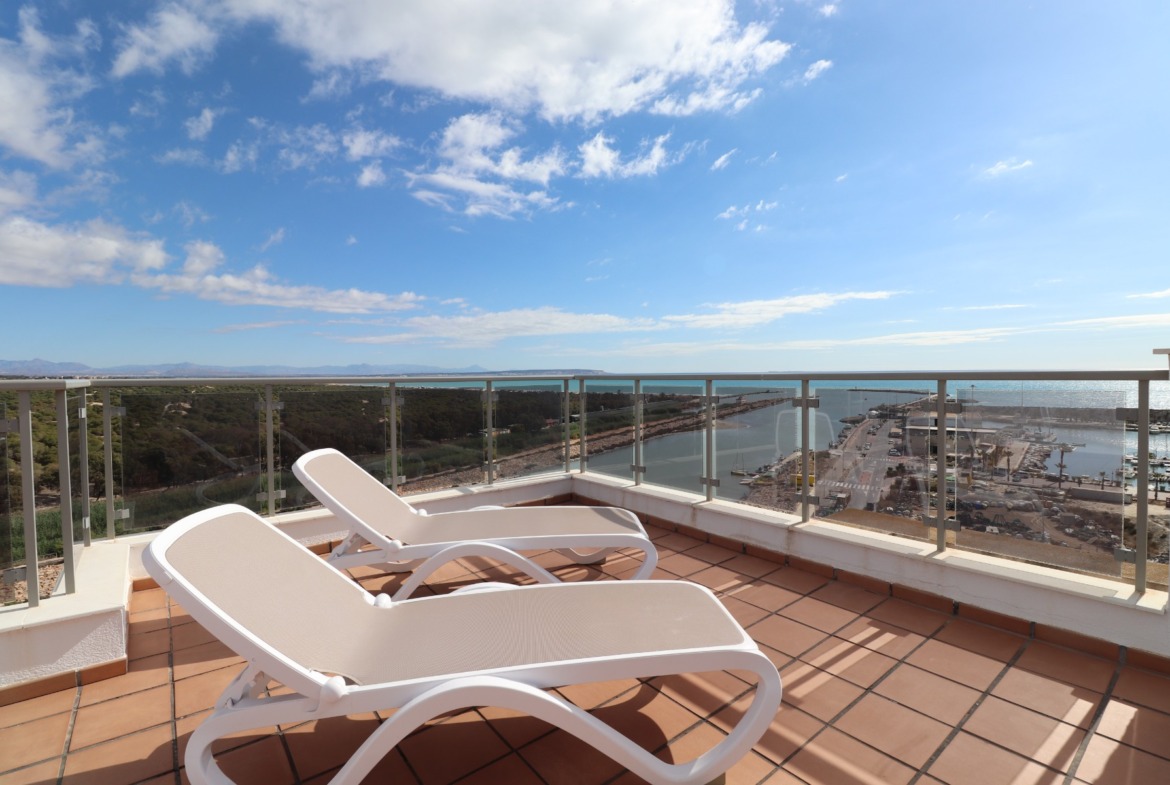 This Stunning, Corner, East Facing, Three Bedroom Penthouse, Duplex Apartment in Guardamar del Segura is located at the port, on the 10th Floor, within a Secure Gated Community boasting luxury amenities. With a spacious 10m2 uncovered terrace and an expansive 74m2 private rooftop solarium, this residence offers unparalleled panoramic views across the river, the sea, pine forest, and mountains beyond. Inside, the property features fitted wardrobes in each of the three bedrooms, ensuring ample storage space, while air conditioning throughout ensures year-round comfort. Residents can enjoy leisure time in the communal swimming pool, tennis court, playground, and mini-golf area, all within the gated community. Parking is convenient with two private underground enclosed garages measuring 42m2 and 37m2 respectively, along with a private underground car parking space. The separate kitchen with an adjoining utility room adds practicality to the living space, while security is enhanced with a sturdy security door. Outdoor living is enhanced with a sun awning on the terrace, providing shade on sunny days. The property’s prime location places it less than 500 meters from the beach and seafront, offering easy access to the coast’s stunning amenities. Situated in Costa Blanca South, this residence is within easy reach of local amenities and facilities, making it an ideal choice for those seeking luxury living in a vibrant coastal community. Absolutely Remarkable Views! One not to be missed!!!