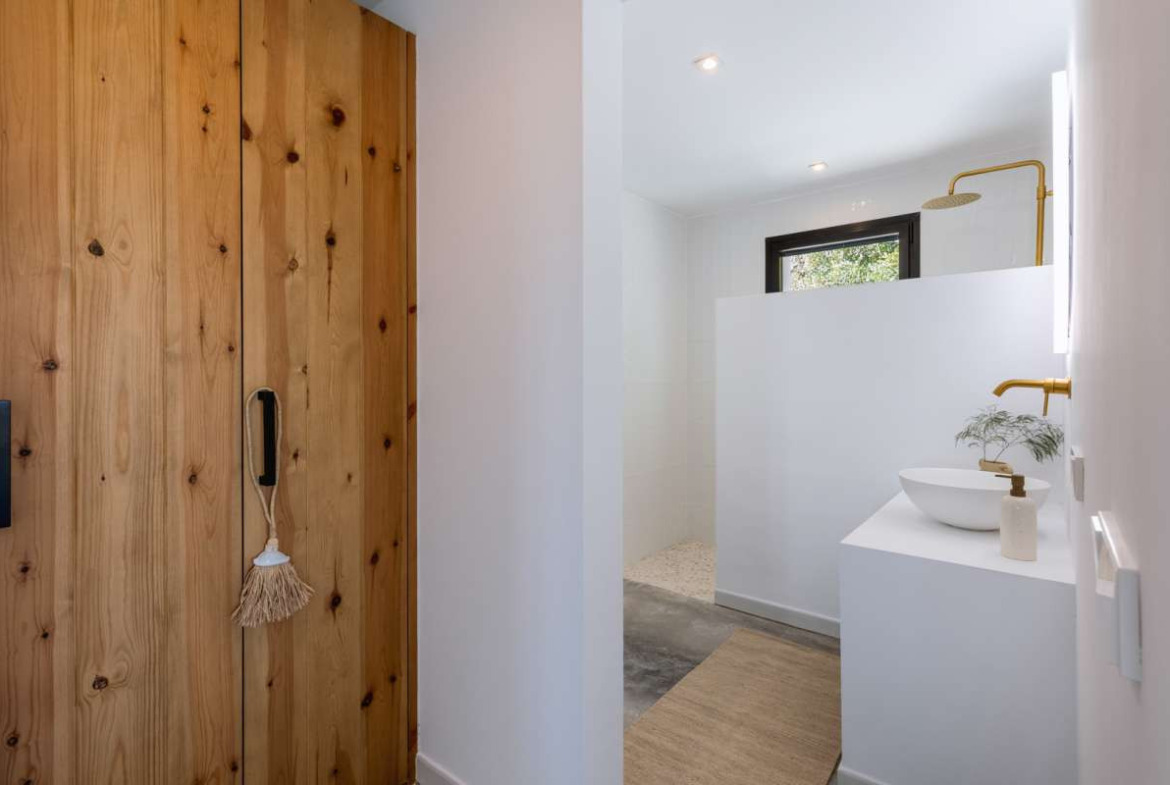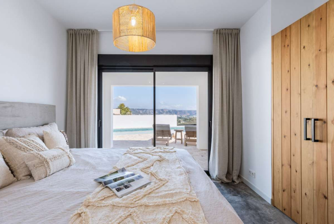 This pretty villa offers amazing views of Javea, its bay, and the sea. It has 3 bedrooms, each with its own bathroom.The villa has two floors, and each one has a big covered terrace where you can enjoy the beautiful views.When you arrive at the top floor, you'll find a nice open space with a kitchen, a dining area, a bedroom, and a bathroom. Downstairs, there are two more bedrooms, each with its own bathroom, and a toilet for guests.Outside, there's a terrace with a private pool and a garden with some lovely olive trees and cozy spots to sit.The renovation of this property is soon to be finished. In addition you have the option to buy it furnished with all new furniture.
