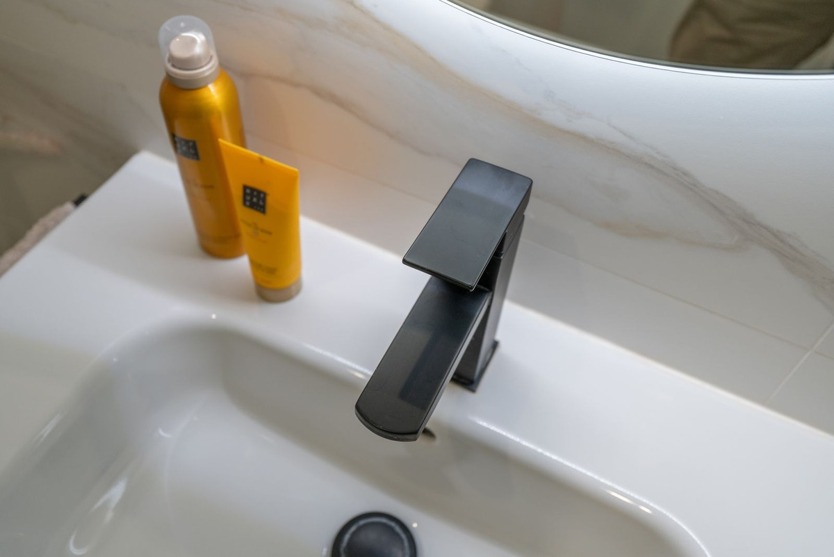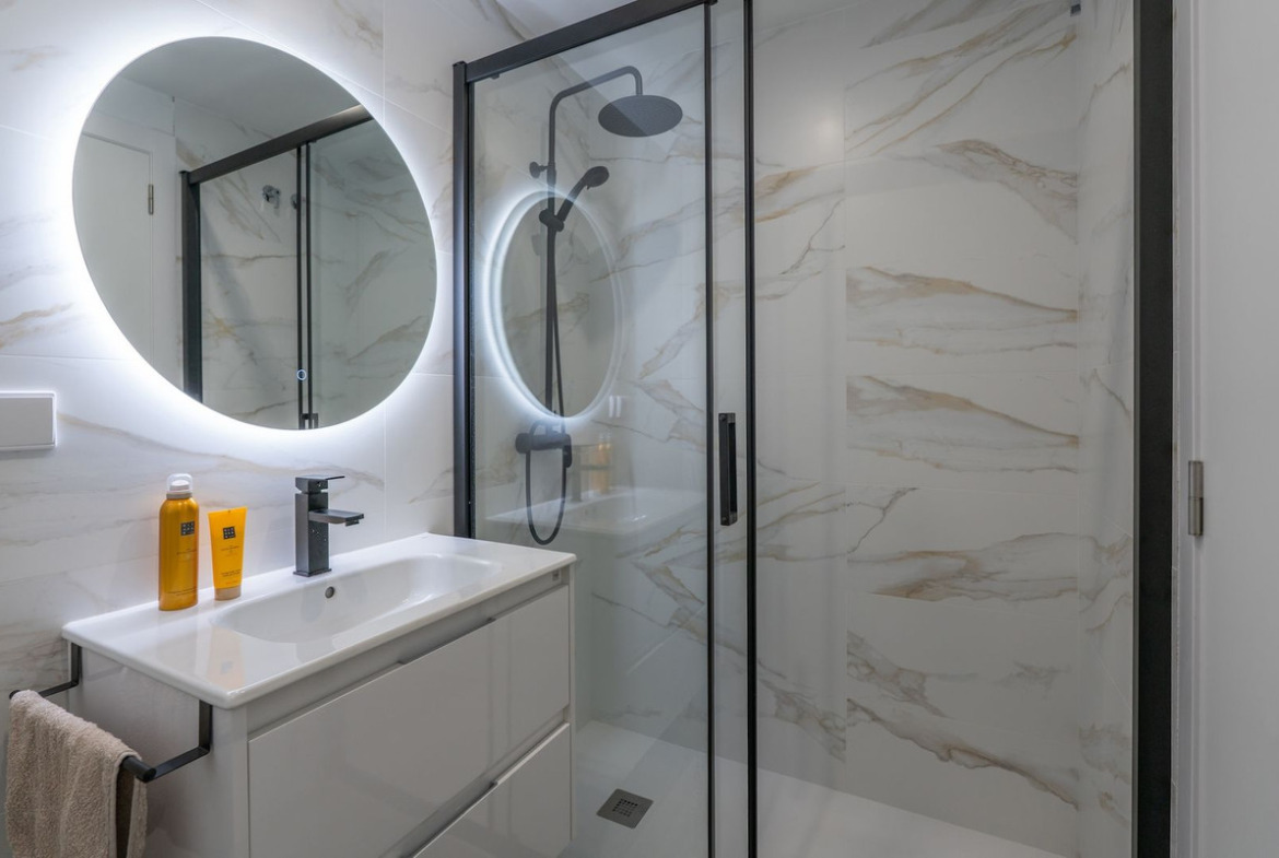 There are three bedrooms, all with built-in wardrobes and large enough for double beds. Two fresh, modern bathrooms with marble-look tiles, black accents, and storage-friendly vanities, plus a separate toilet. Everything is well finished—you don’t have to do a thing. There’s also a separate utility room with a washing machine and boiler.