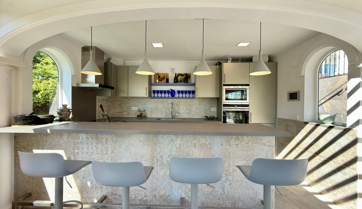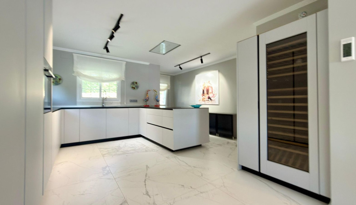 The modern kitchen is fully equipped with high-quality appliances by Gaggenau, including an American-style fridge and a large wine fridge, and connects directly to the terraces, pool, and summer house. A guest toilet and office complete this level.