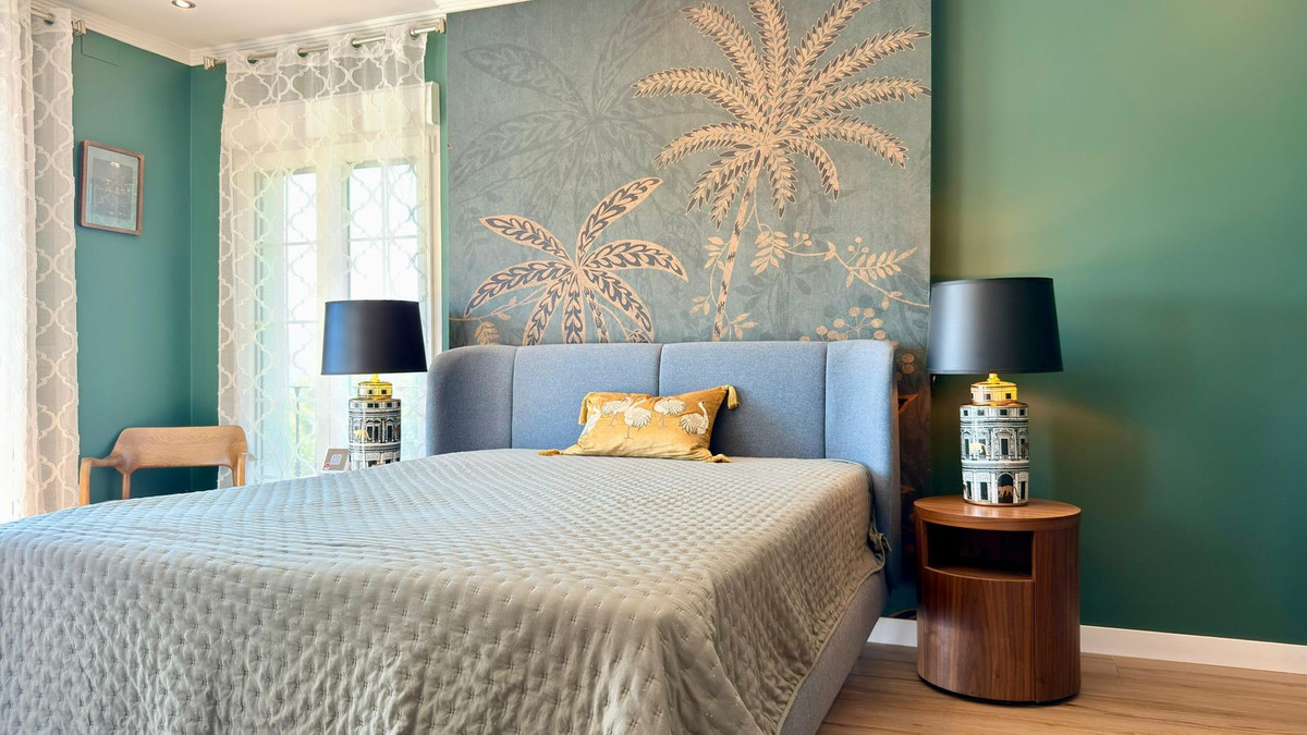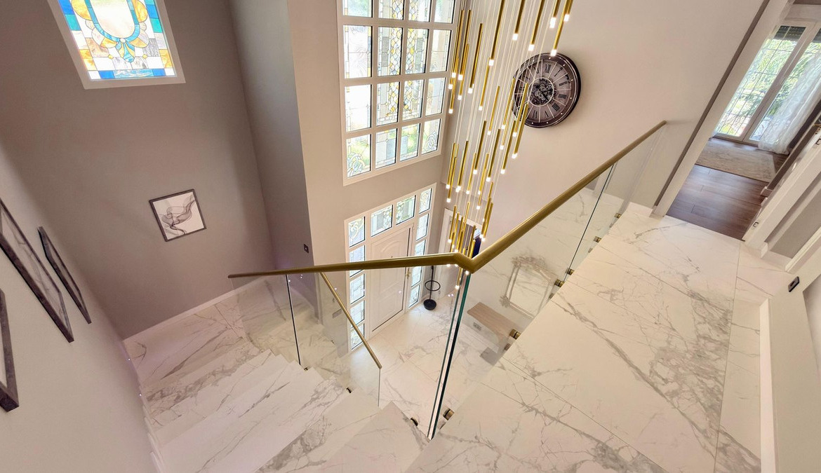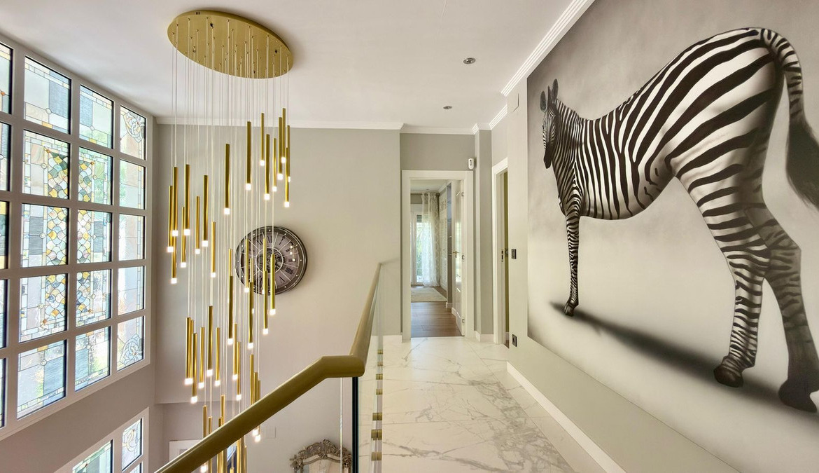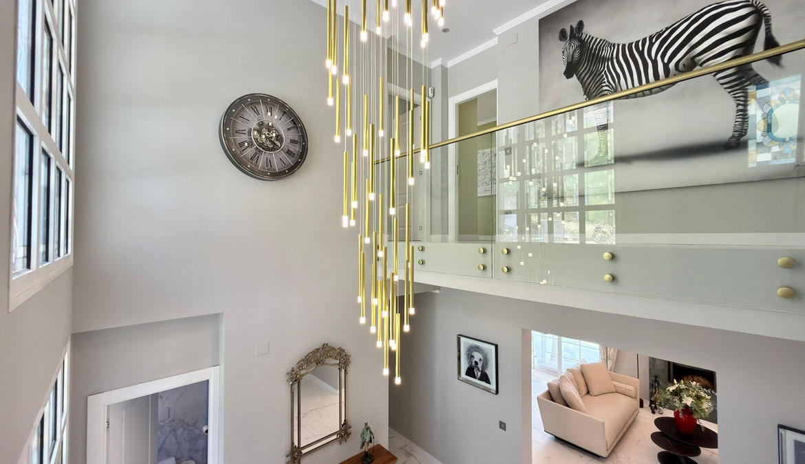 On the ground floor, a spectacular entrance hall with double-height ceilings and stained-glass windows welcomes you with natural light. The main living room includes a working fireplace with hand-painted golden details, while a second lounge area is designed for entertainment, equipped with a large TV and automatic blinds.